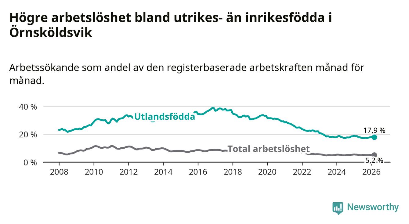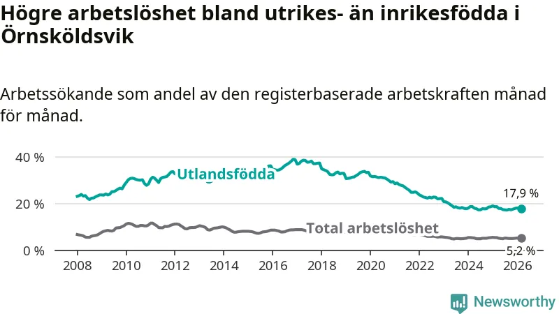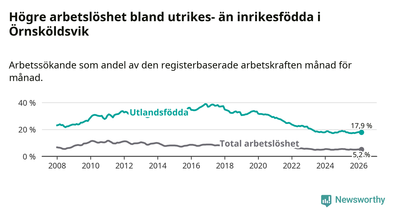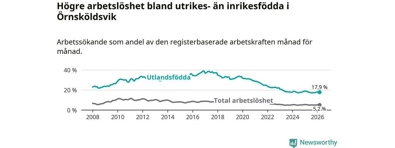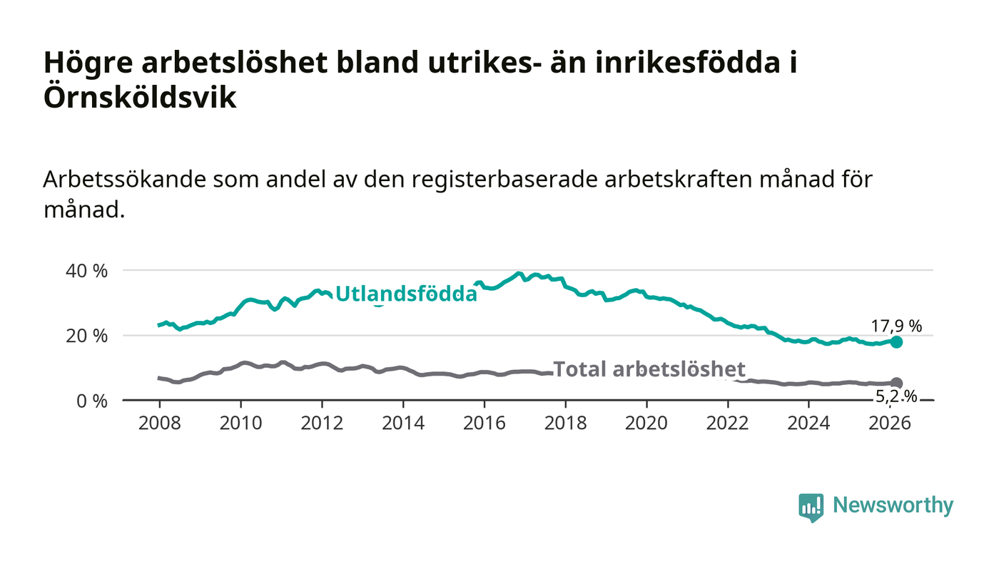 Skillnaden i arbetslöshet mellan utrikesfödda och hela befolkningen är 12,7 procentenheter i Örnsköldsvik. Det är en mindre skillnad än för ett år sedan (−0,6 procentenheter).