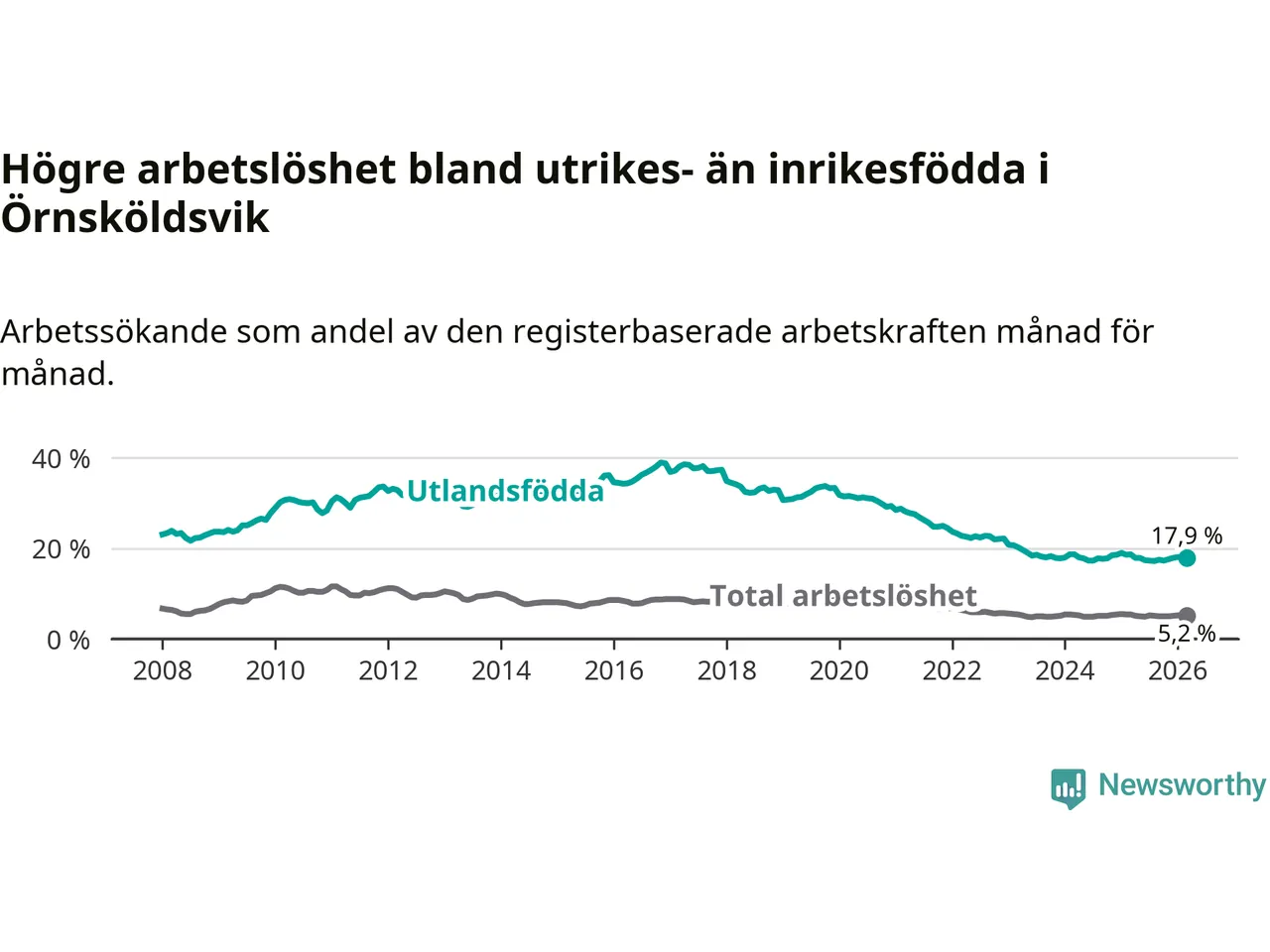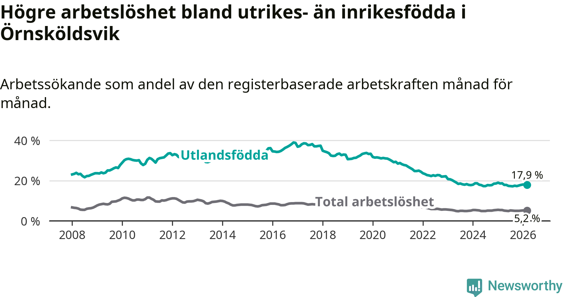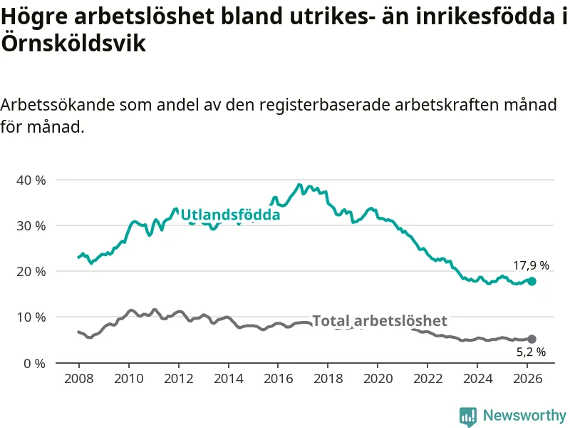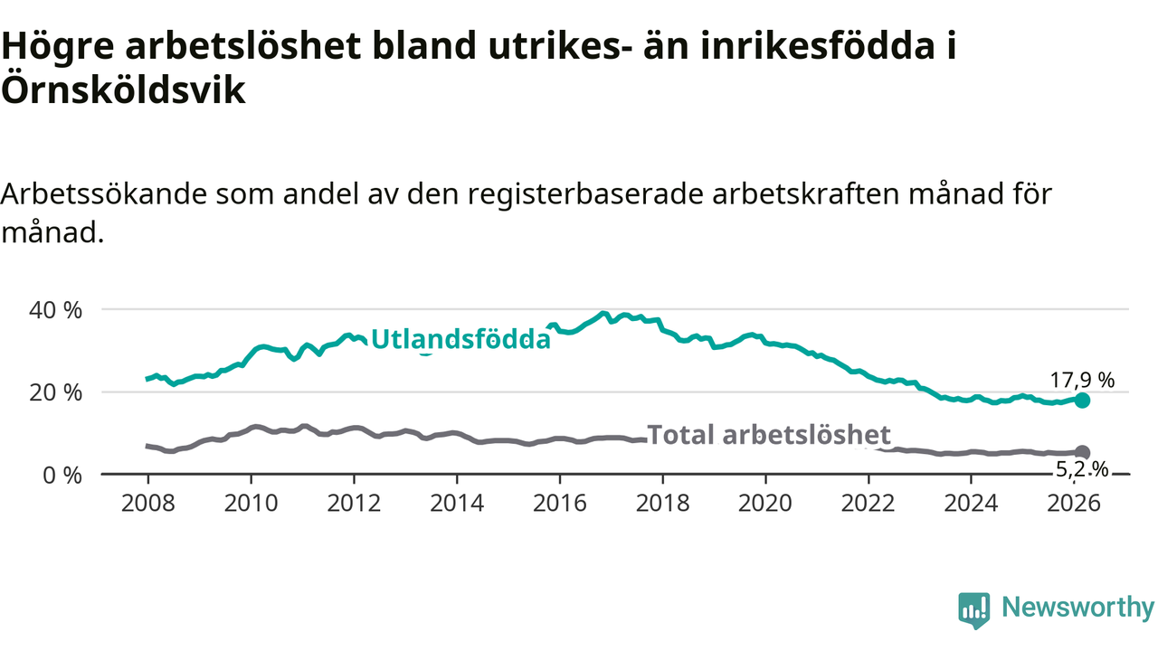 Skillnaden i arbetslöshet mellan utrikesfödda och hela befolkningen är 12,7 procentenheter i Örnsköldsvik. Det är en mindre skillnad än för ett år sedan (−0,6 procentenheter).
