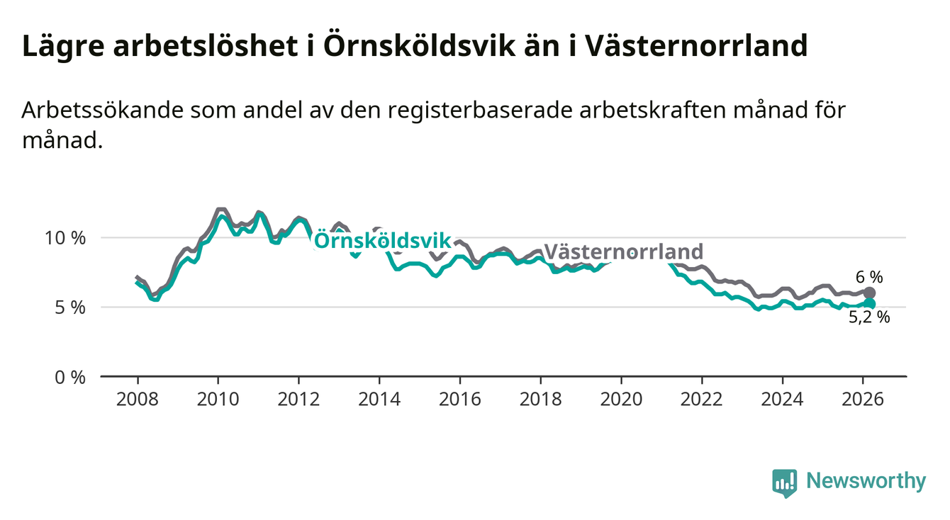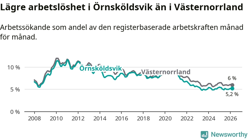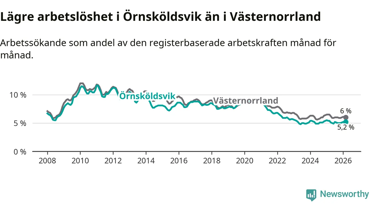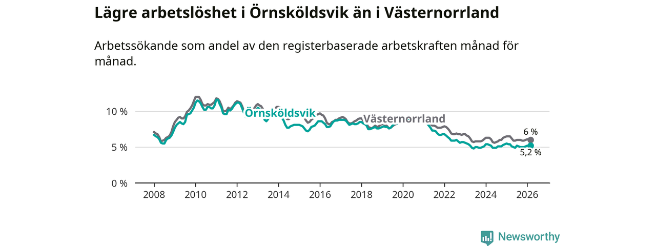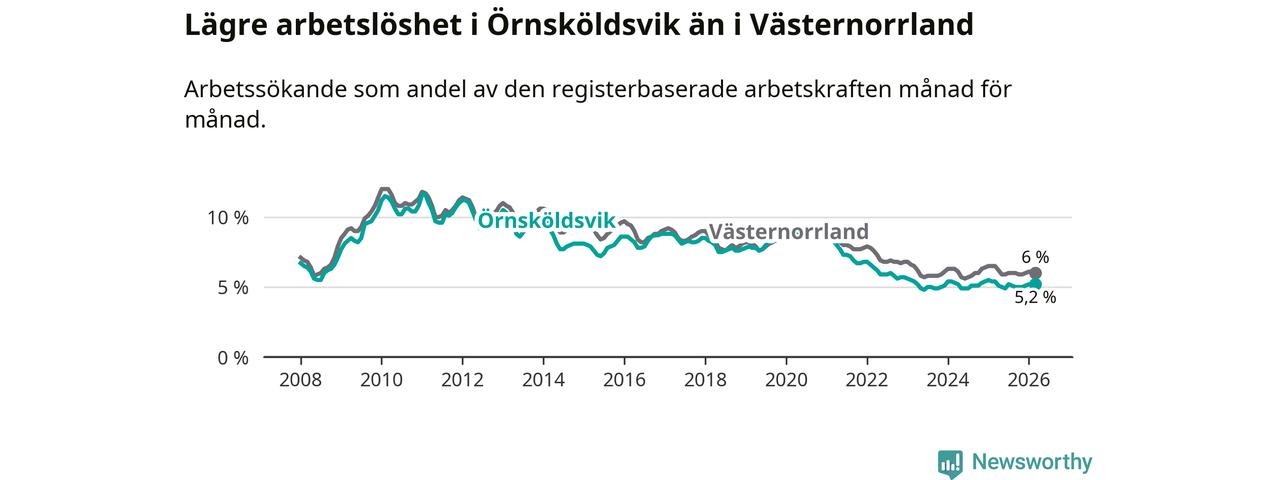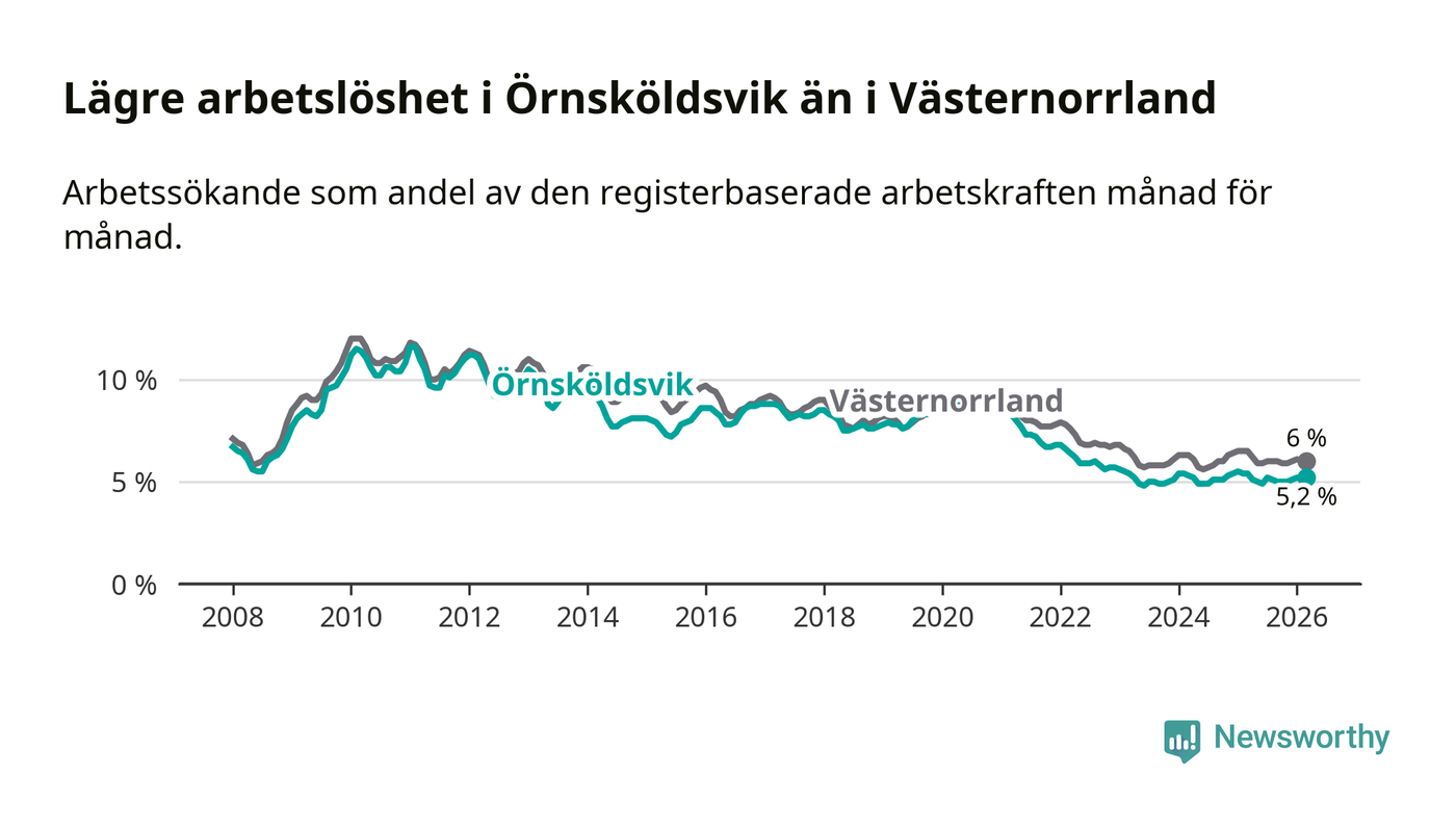 Örnsköldsvik hade redan tidigare lägre arbetslöshet än snittet i hela Västernorrlands län och nu växer klyftan (5,2 procent i kommunen, jämfört med 6,0 procent i hela länet). Örnsköldsvik har därmed även den lägsta arbetslöshetsnivån i länet. Härnösand har den högsta (8,0 procent).