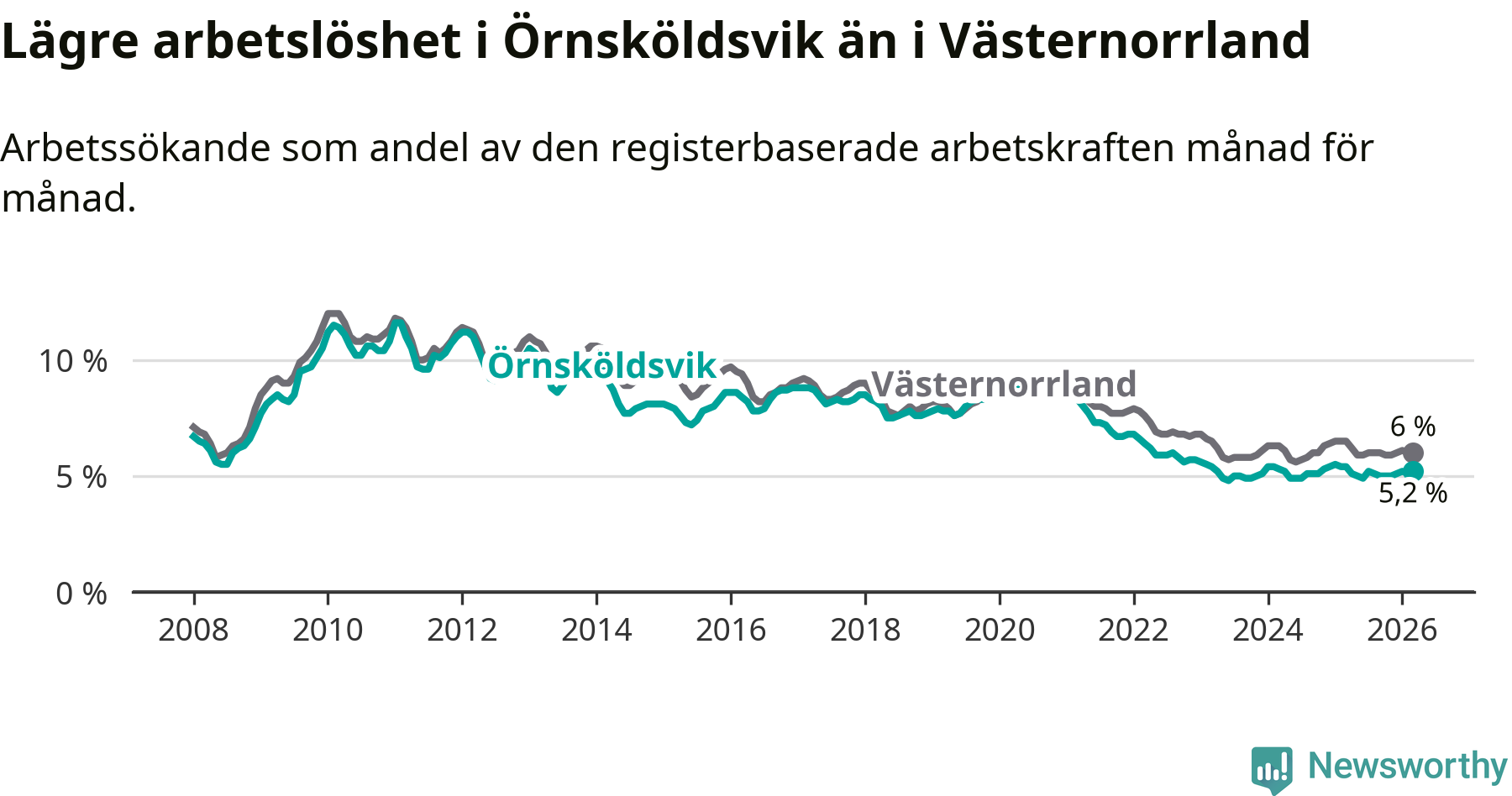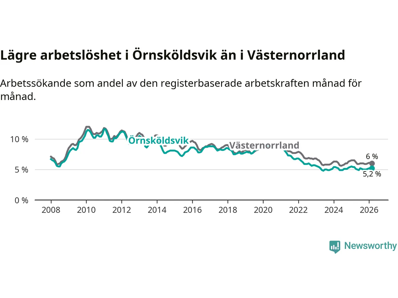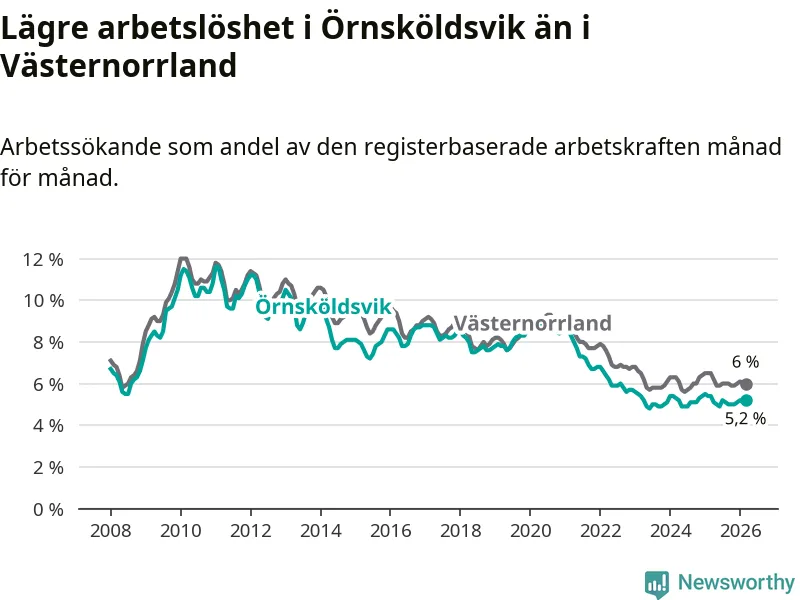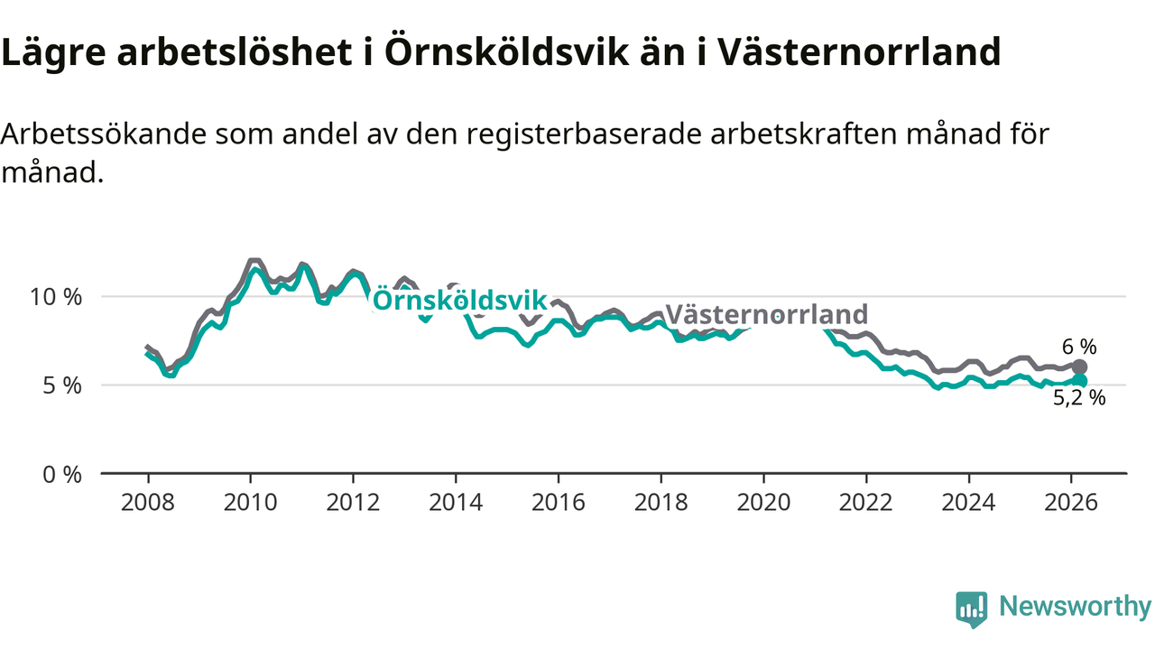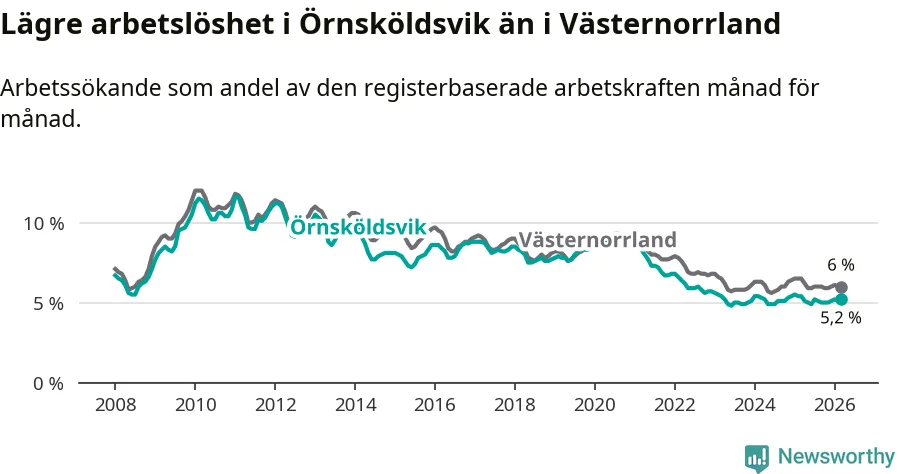 Örnsköldsvik hade redan tidigare lägre arbetslöshet än snittet i hela Västernorrlands län och nu växer klyftan (5,2 procent i kommunen, jämfört med 6,0 procent i hela länet). Örnsköldsvik har därmed även den lägsta arbetslöshetsnivån i länet. Härnösand har den högsta (8,0 procent).