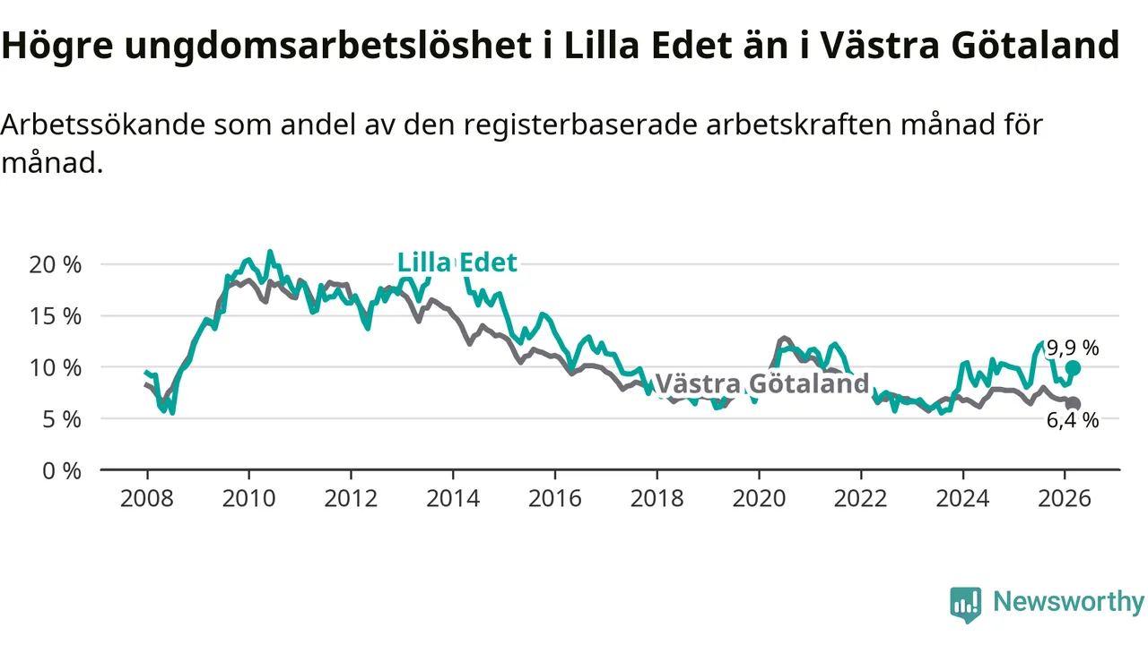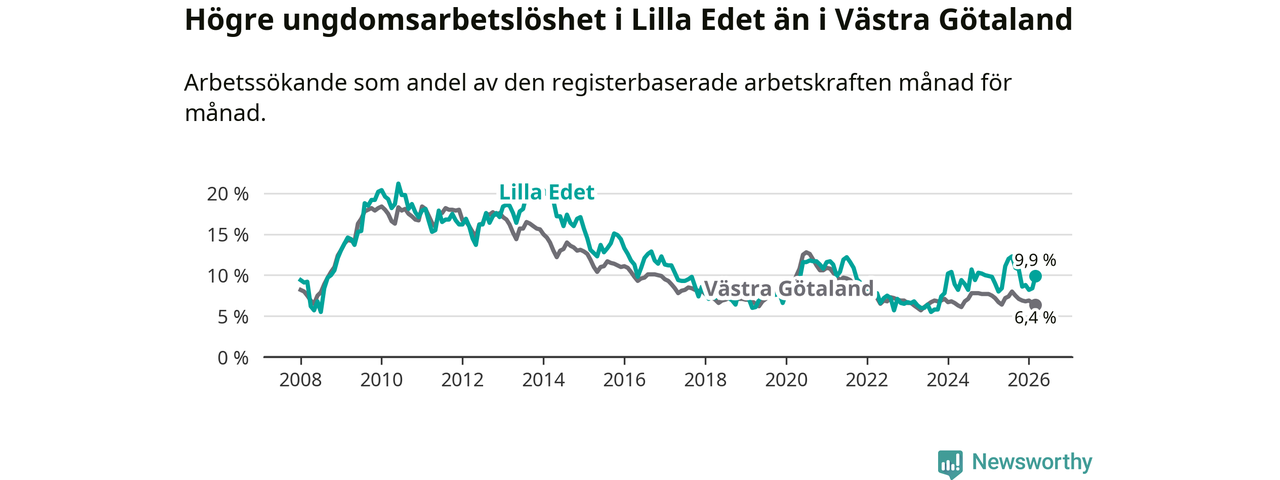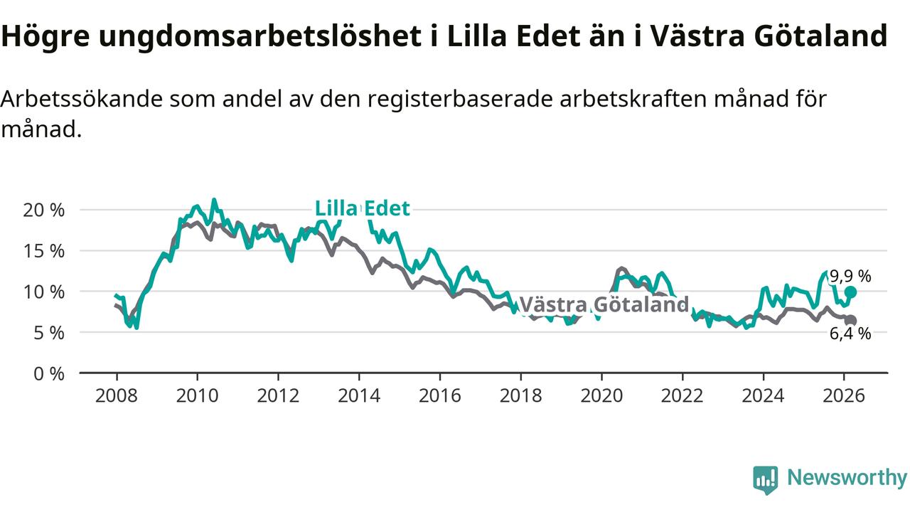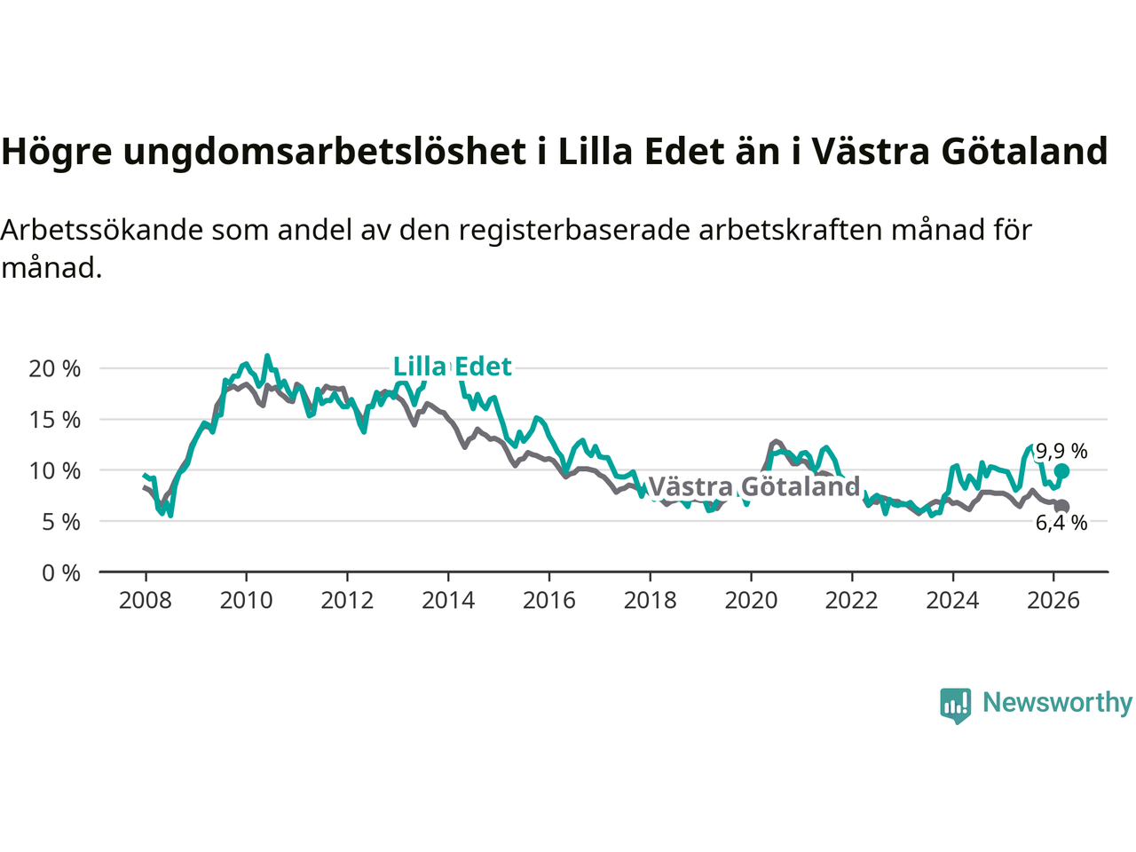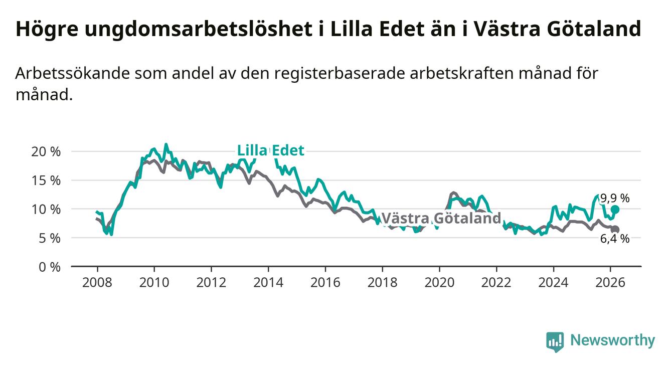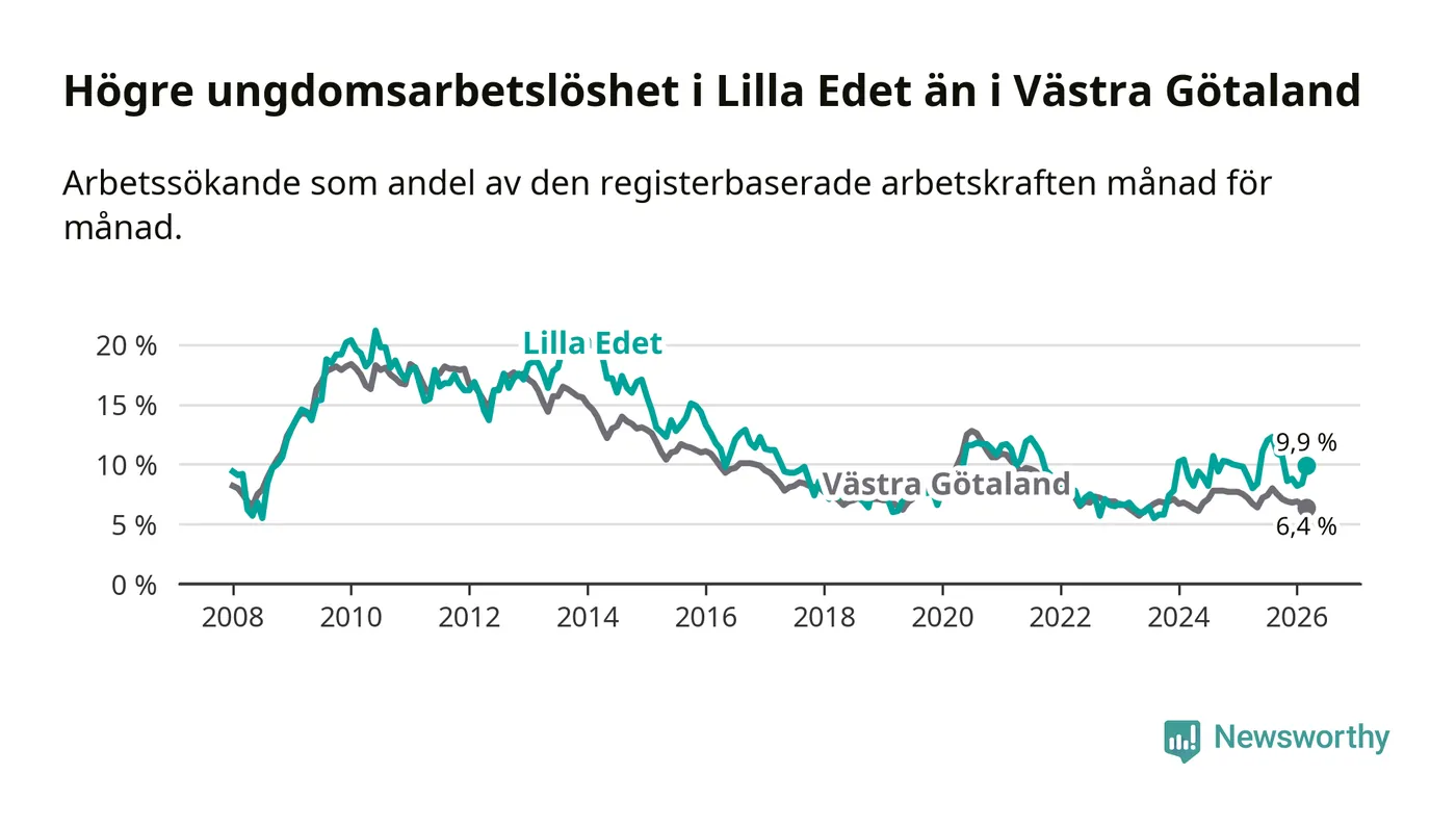 Medan Lilla Edet har lägre total arbetslöshet än Västra Götaland, ligger ungdomsarbetslösheten 3,5 procentenheter högre i Lilla Edet.