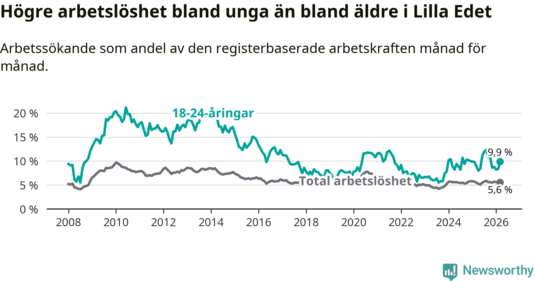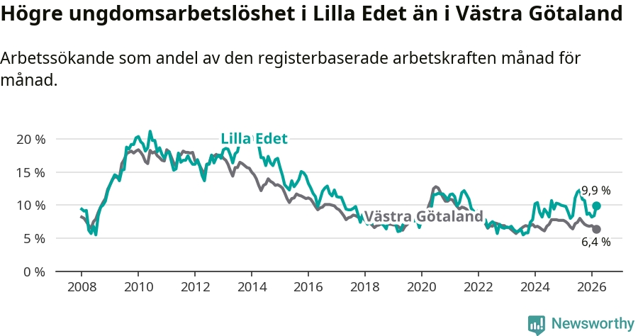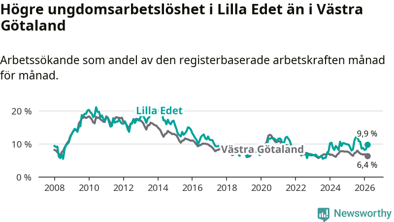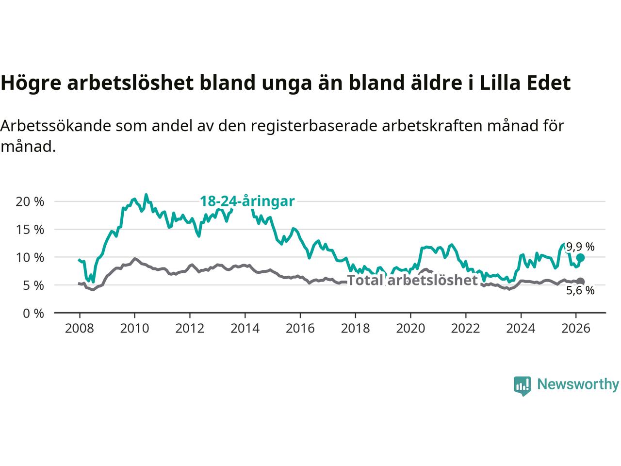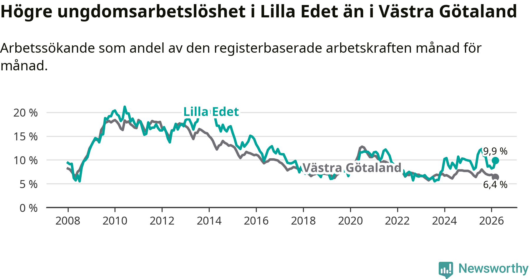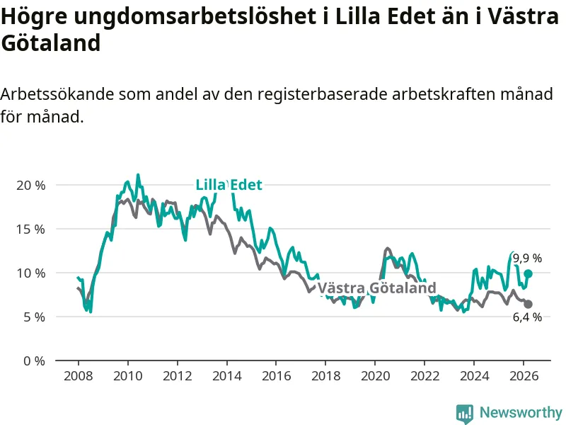 Medan Lilla Edet har lägre total arbetslöshet än Västra Götaland, ligger ungdomsarbetslösheten 3,5 procentenheter högre i Lilla Edet.