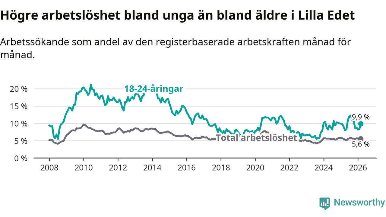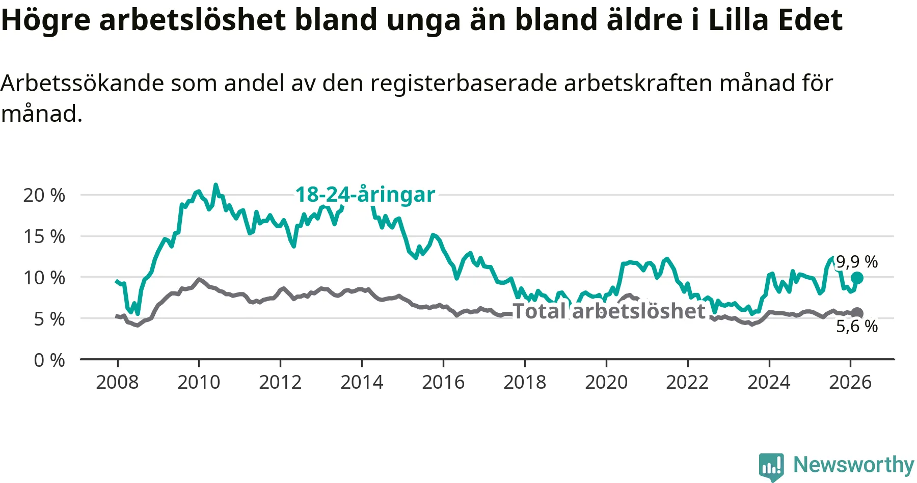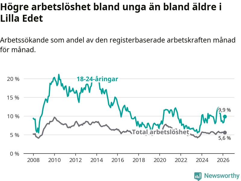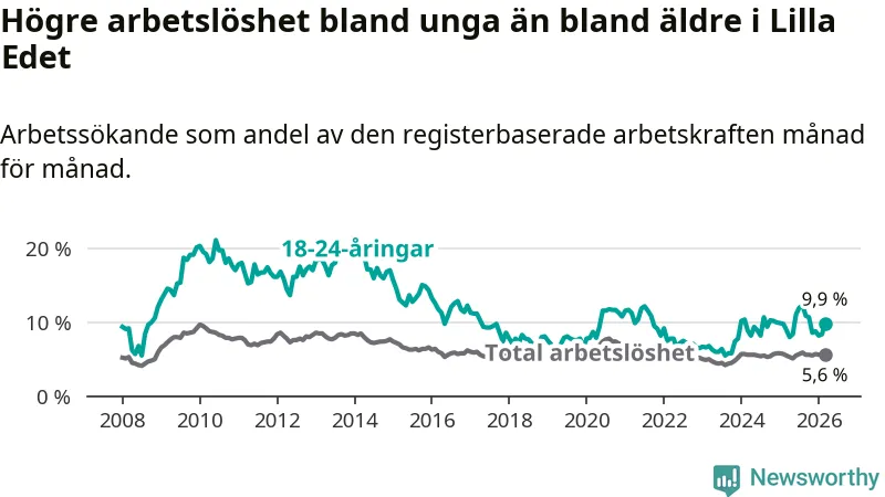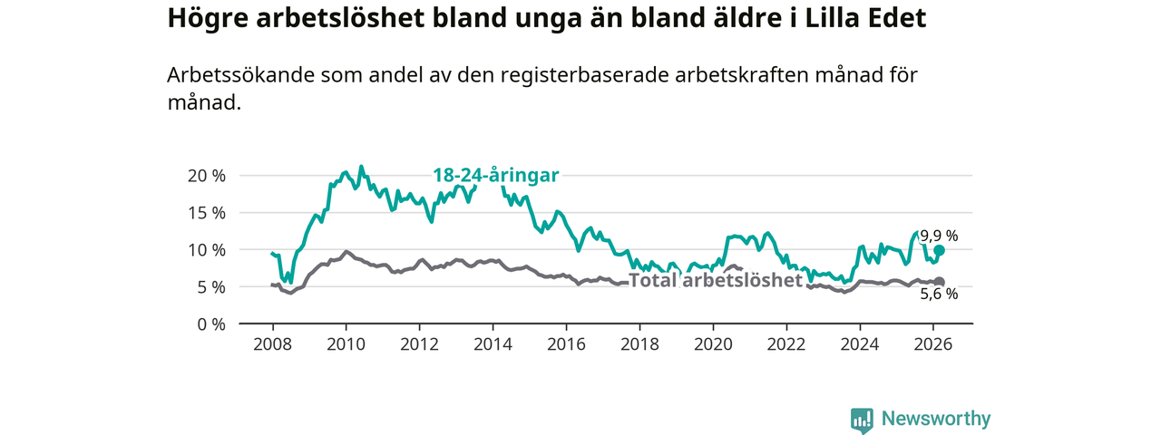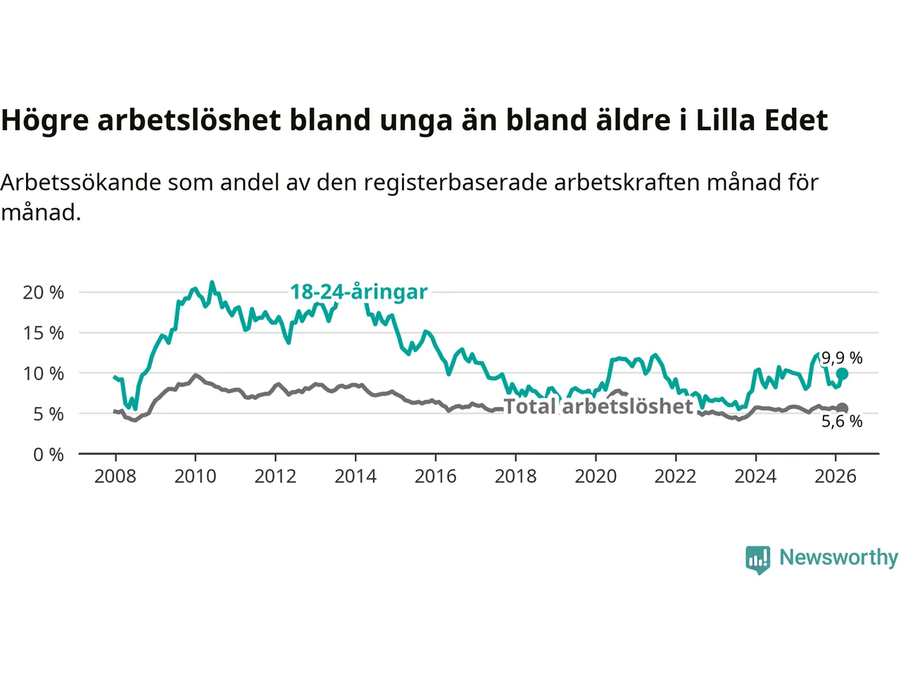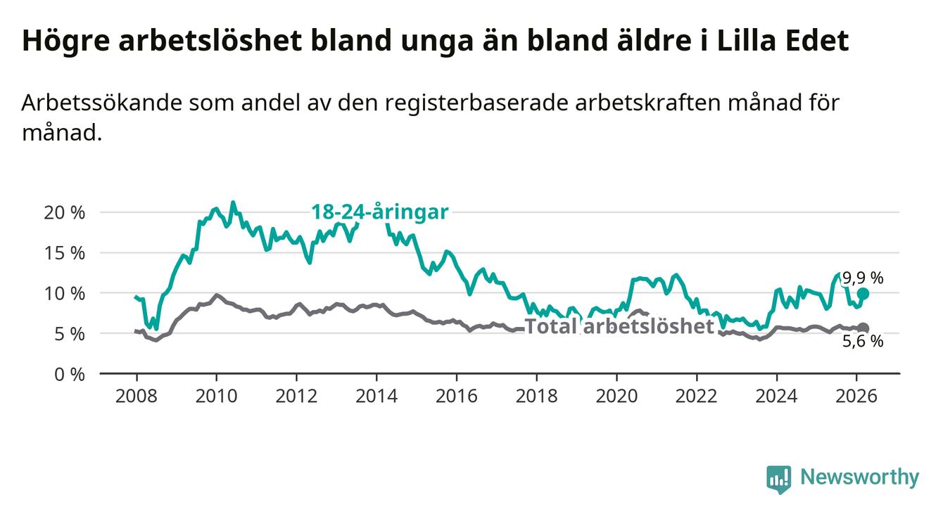 Medan Lilla Edet har lägre total arbetslöshet än Västra Götaland, ligger ungdomsarbetslösheten 3,5 procentenheter högre i Lilla Edet.