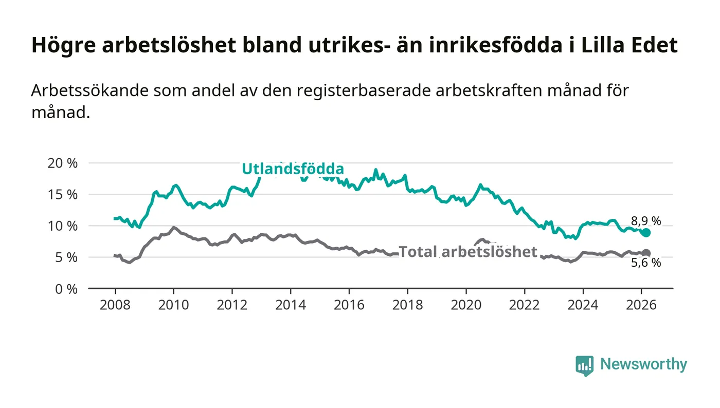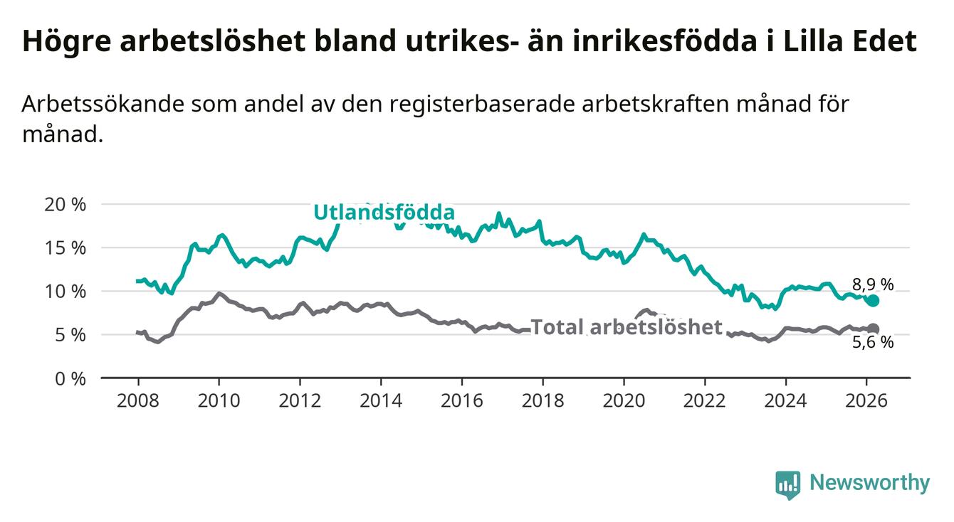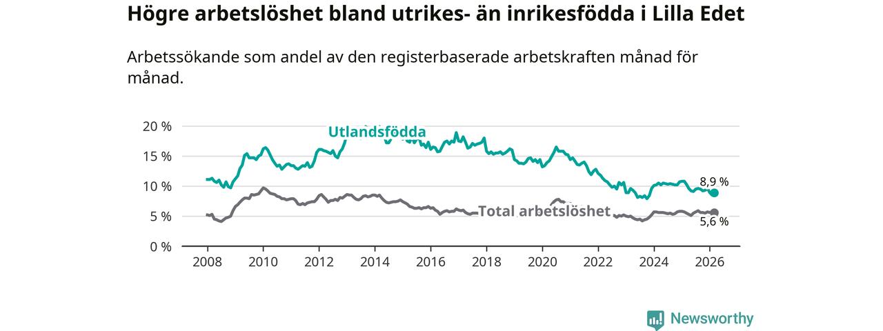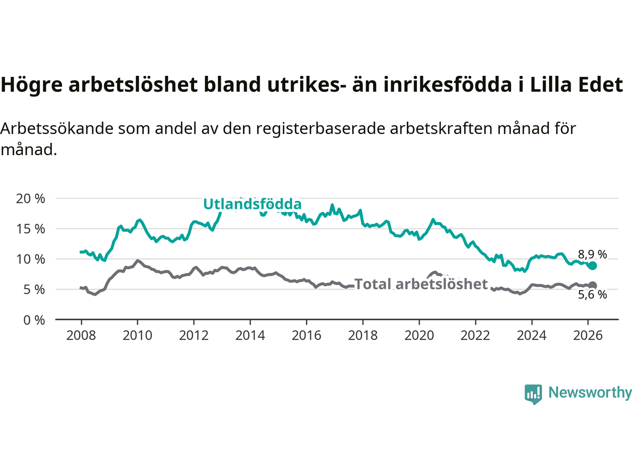 Arbetslösheten bland utlandsfödda var 8,9 procent i Lilla Edet under mars månad, motsvarande 141 av 1 584 personer. Det är 1,4 procentenheter färre än vid samma tidpunkt i fjol (−17 om man räknar personer). Därmed är de utlandsföddas arbetslöshet lägre än vid samma tidpunkt i fjol för 13:e månaden i följd. Sedan februari 2025 har arbetslösheten bland utlandsfödda minskat från 10,8 till 8,9 procent.
