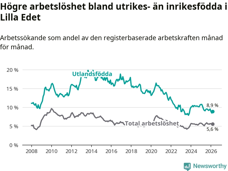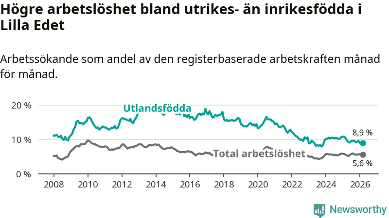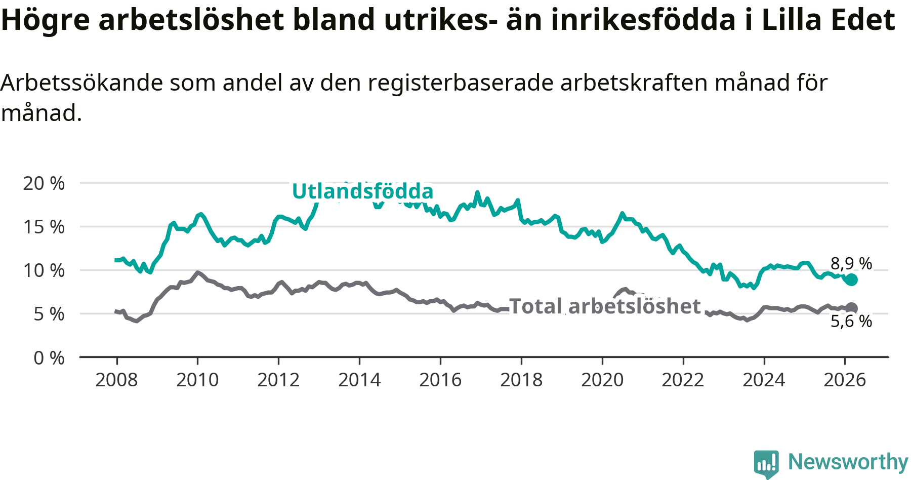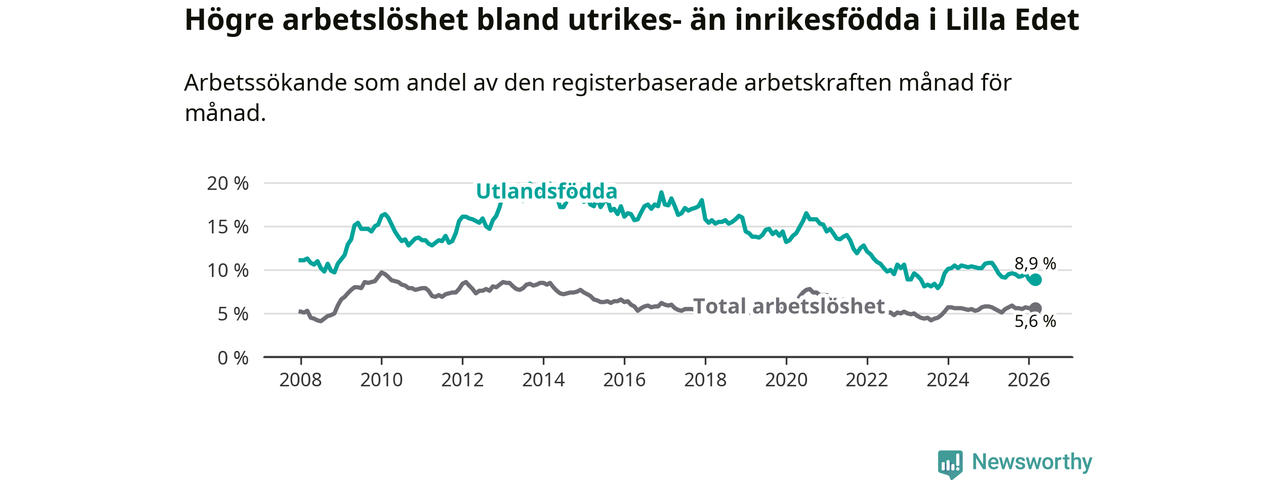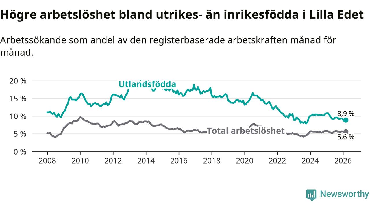 Arbetslösheten bland utlandsfödda var 8,9 procent i Lilla Edet under mars månad, motsvarande 141 av 1 584 personer. Det är 1,4 procentenheter färre än vid samma tidpunkt i fjol (−17 om man räknar personer). Därmed är de utlandsföddas arbetslöshet lägre än vid samma tidpunkt i fjol för 13:e månaden i följd. Sedan februari 2025 har arbetslösheten bland utlandsfödda minskat från 10,8 till 8,9 procent.