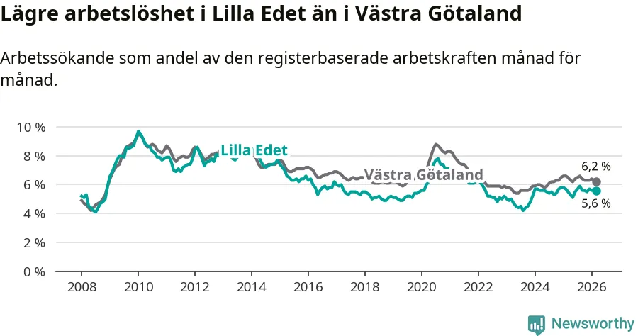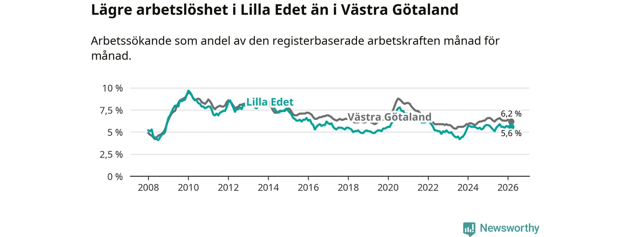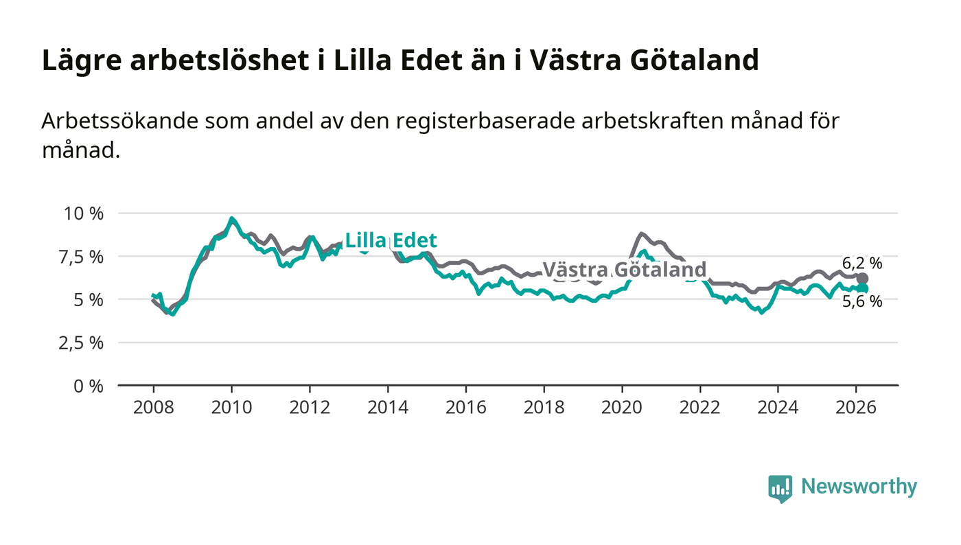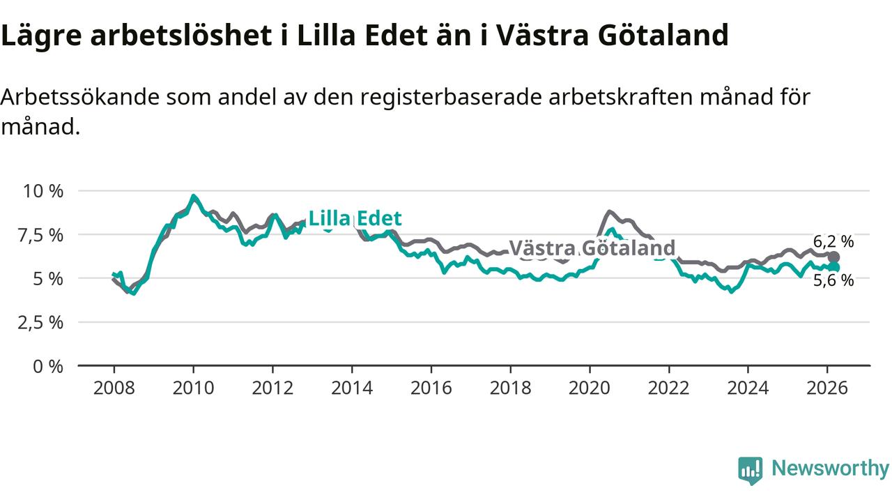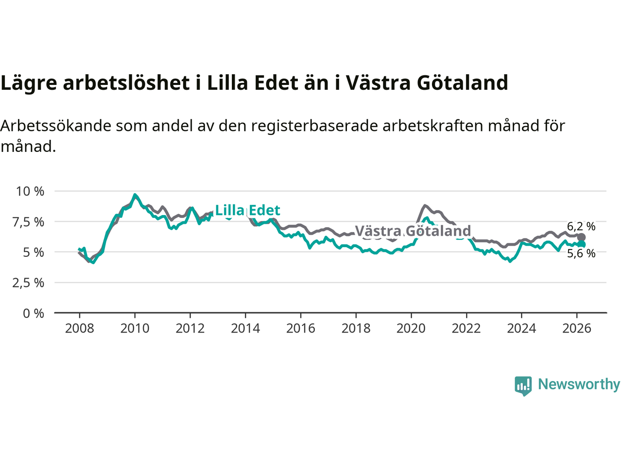 Under mars månad rapporterade Lilla Edets kommun en total arbetslöshet på 5,6 procent. Det är en ökning jämfört med samma tidpunkt i fjol (+0,1 procentenheter). I Västra Götalands län däremot sjunker arbetslösheten .
