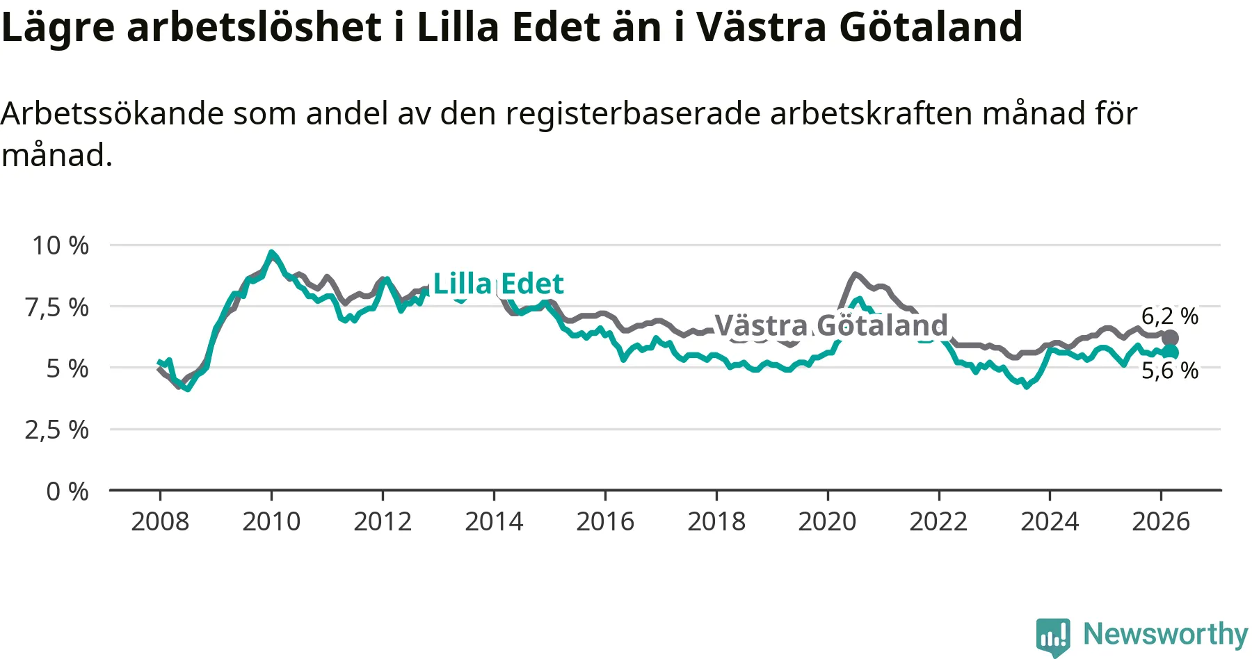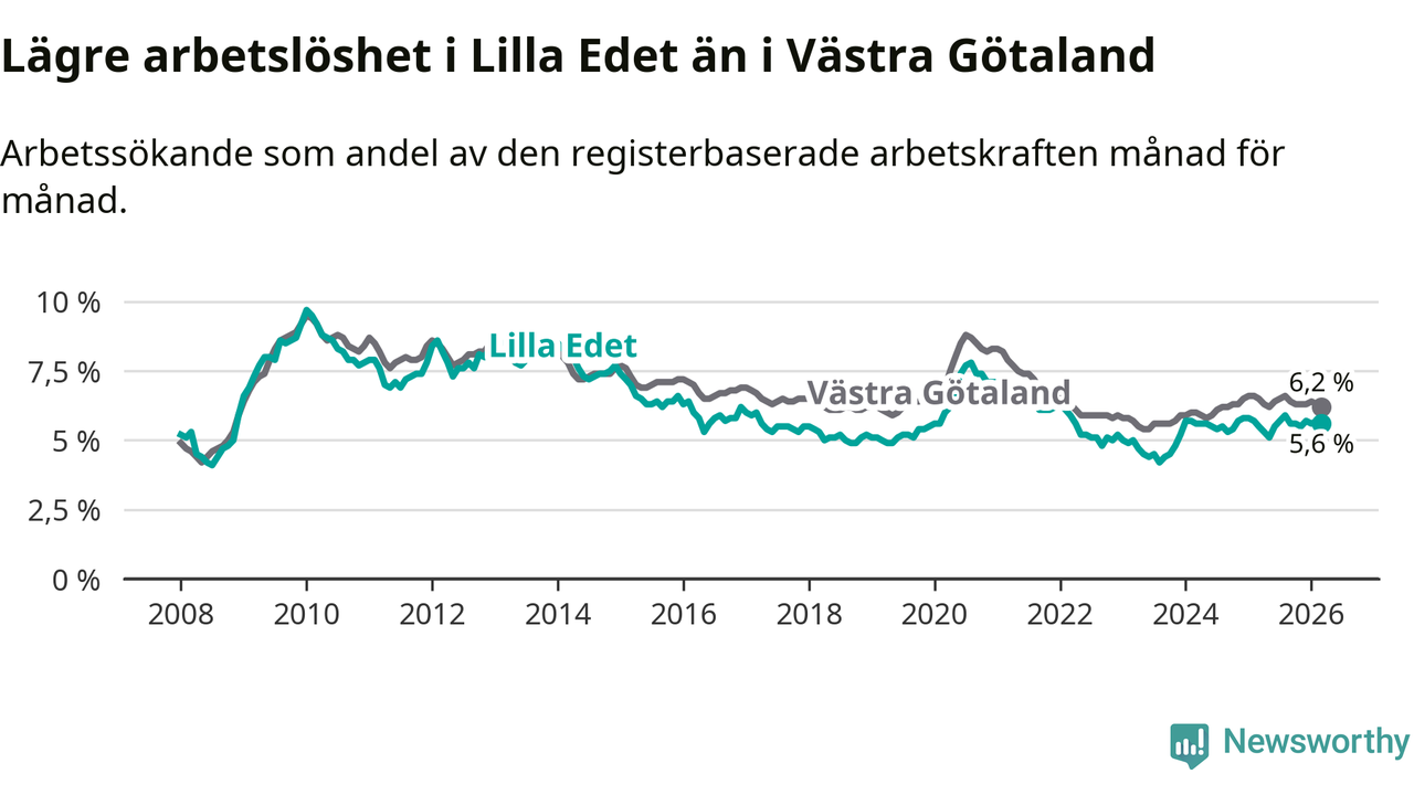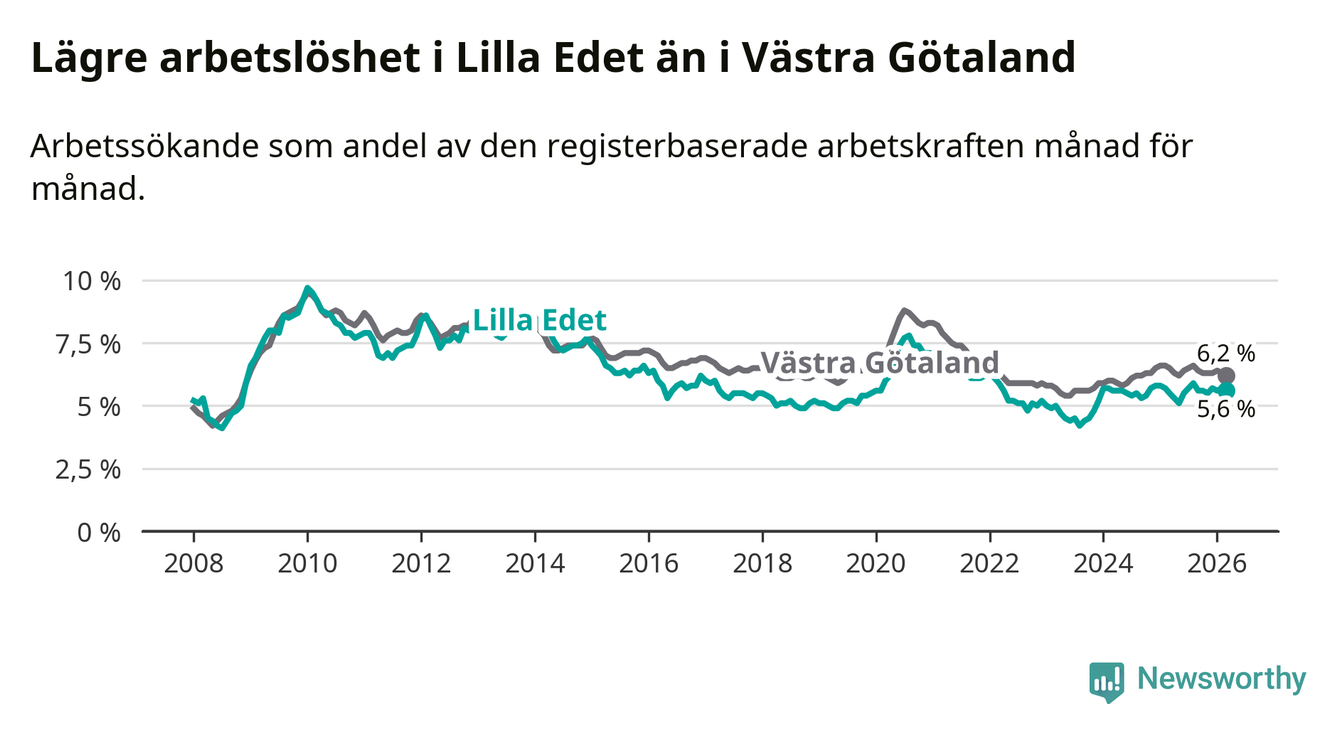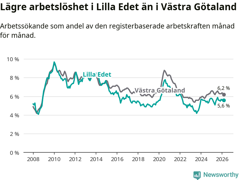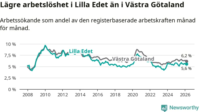 Under mars månad rapporterade Lilla Edets kommun en total arbetslöshet på 5,6 procent. Det är en ökning jämfört med samma tidpunkt i fjol (+0,1 procentenheter). I Västra Götalands län däremot sjunker arbetslösheten .