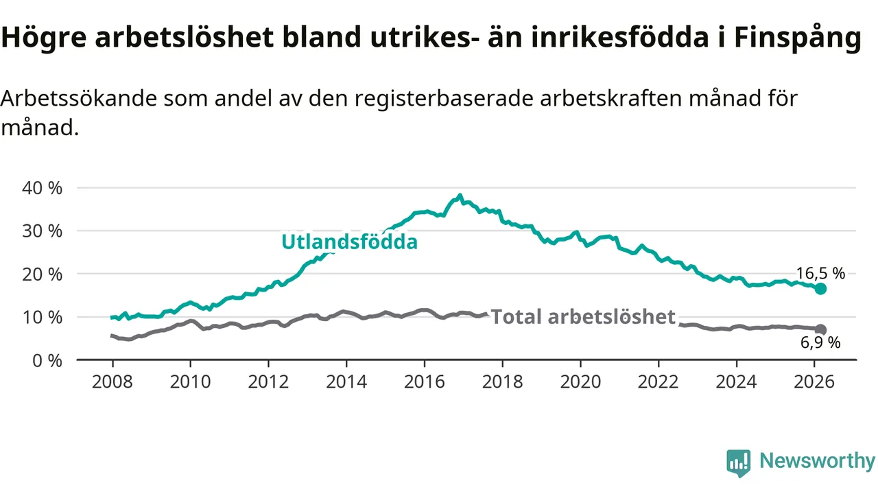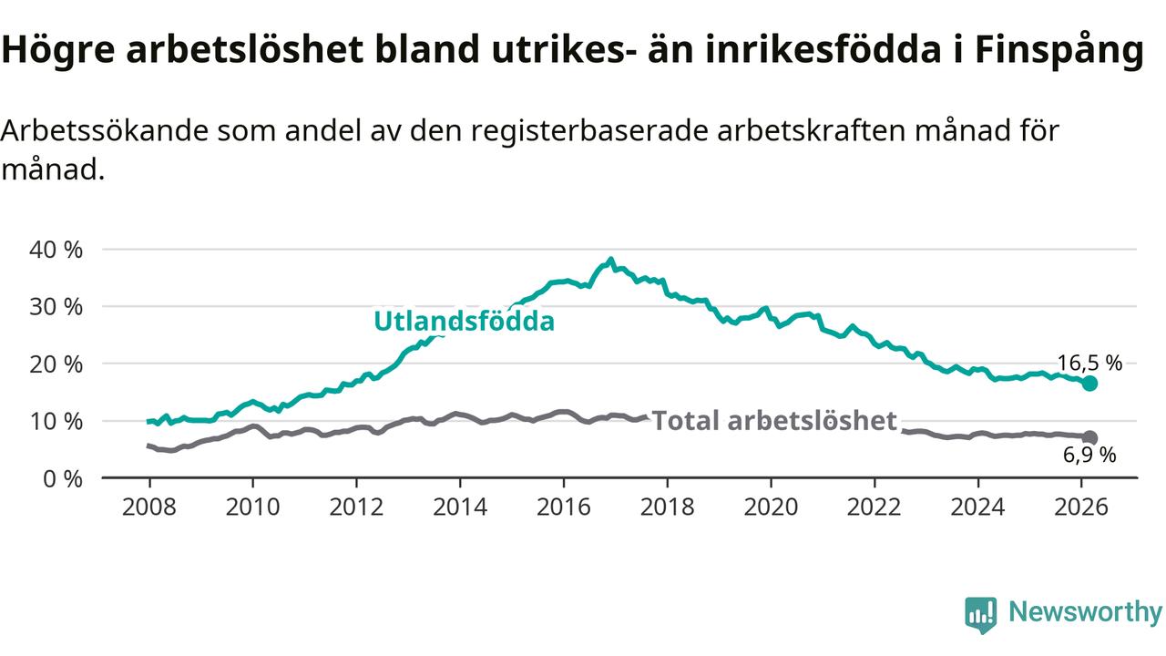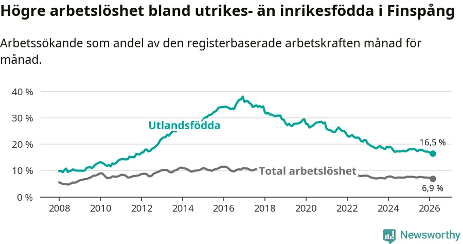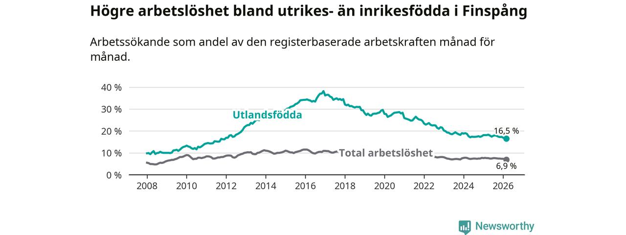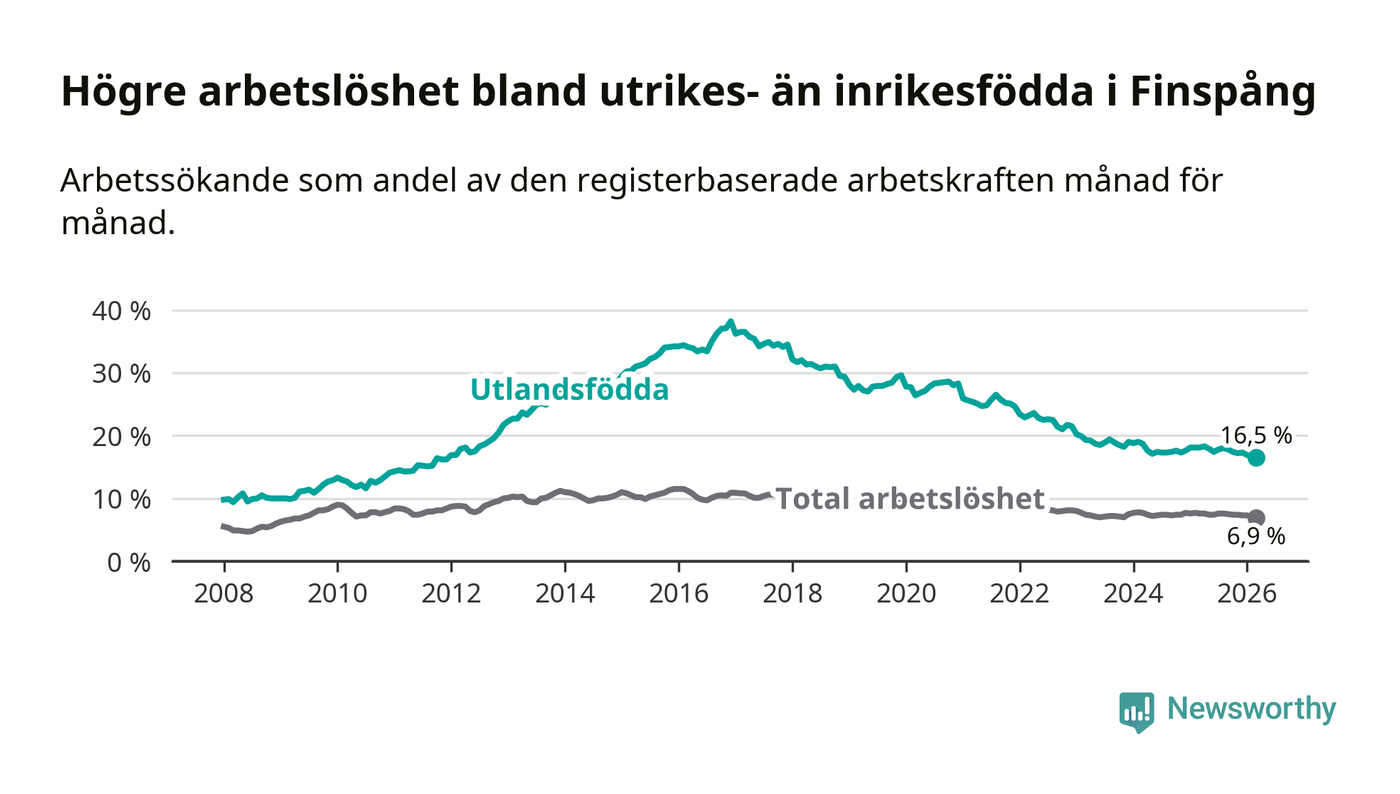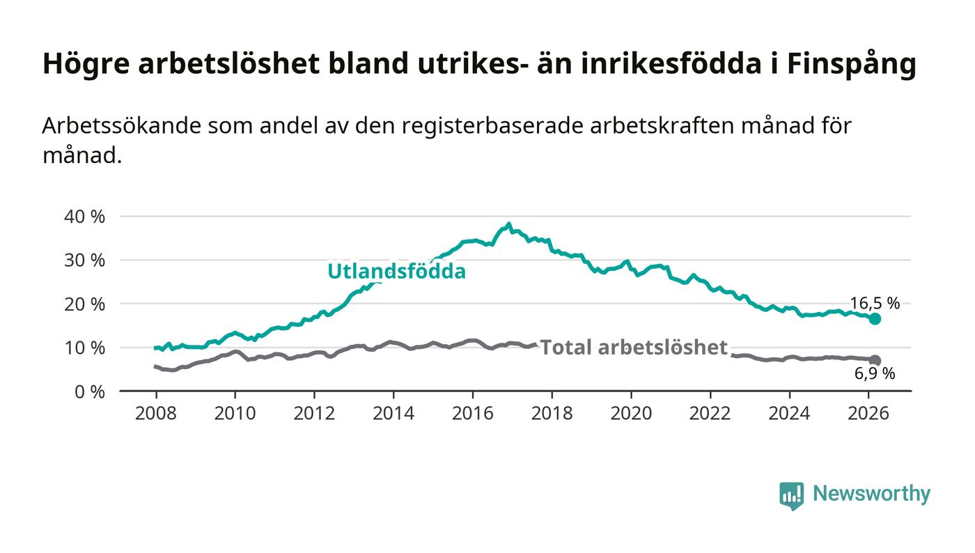 Arbetslösheten bland utlandsfödda var 16,5 procent i Finspång under mars månad, motsvarande 327 av 1 982 personer. Det är 1,6 procentenheter färre än vid samma tidpunkt i fjol (−34 om man räknar personer). Därmed är de utlandsföddas arbetslöshet lägre än vid samma tidpunkt i fjol för sjätte månaden i följd. Sedan september 2025 har arbetslösheten bland utlandsfödda minskat från 17,8 till 16,5 procent. Den nuvarande arbetslöshetsnivån är den lägsta sedan december 2011.