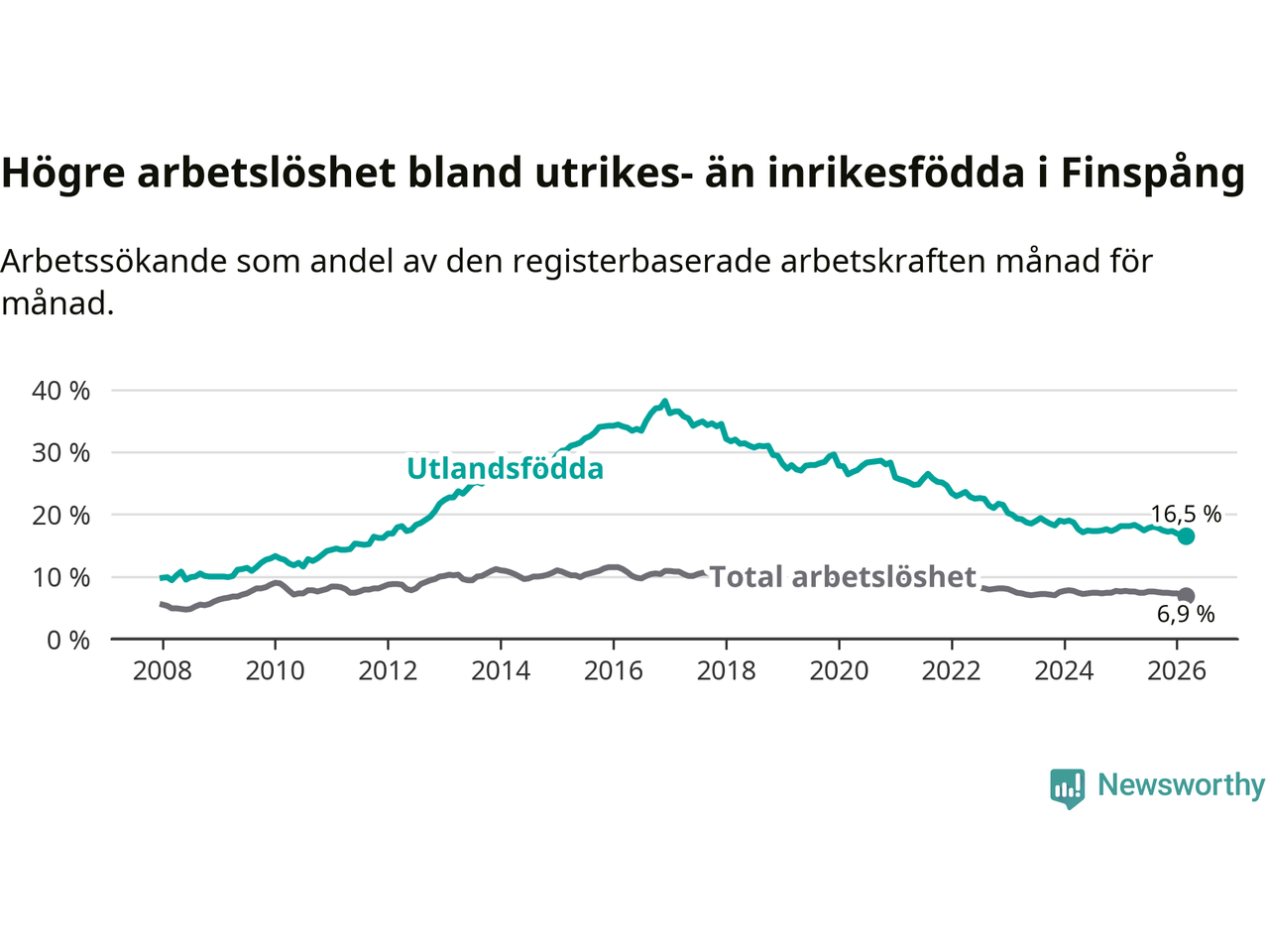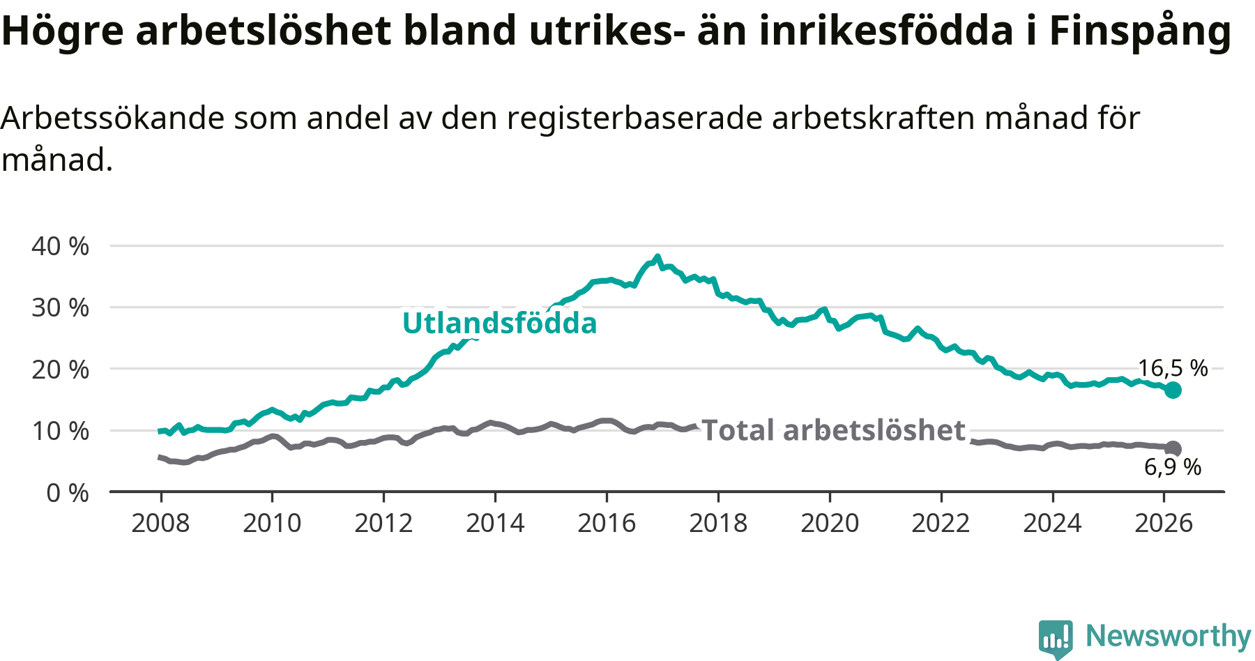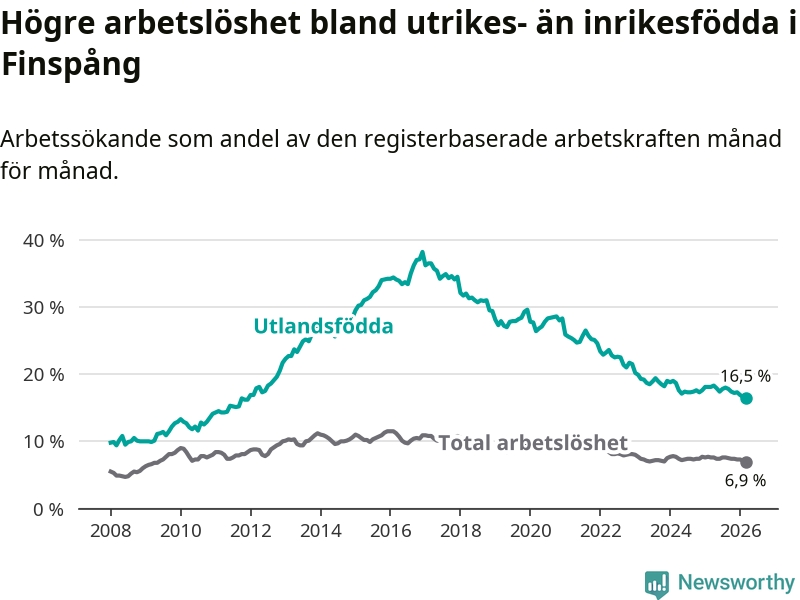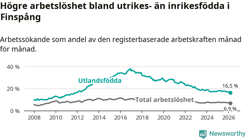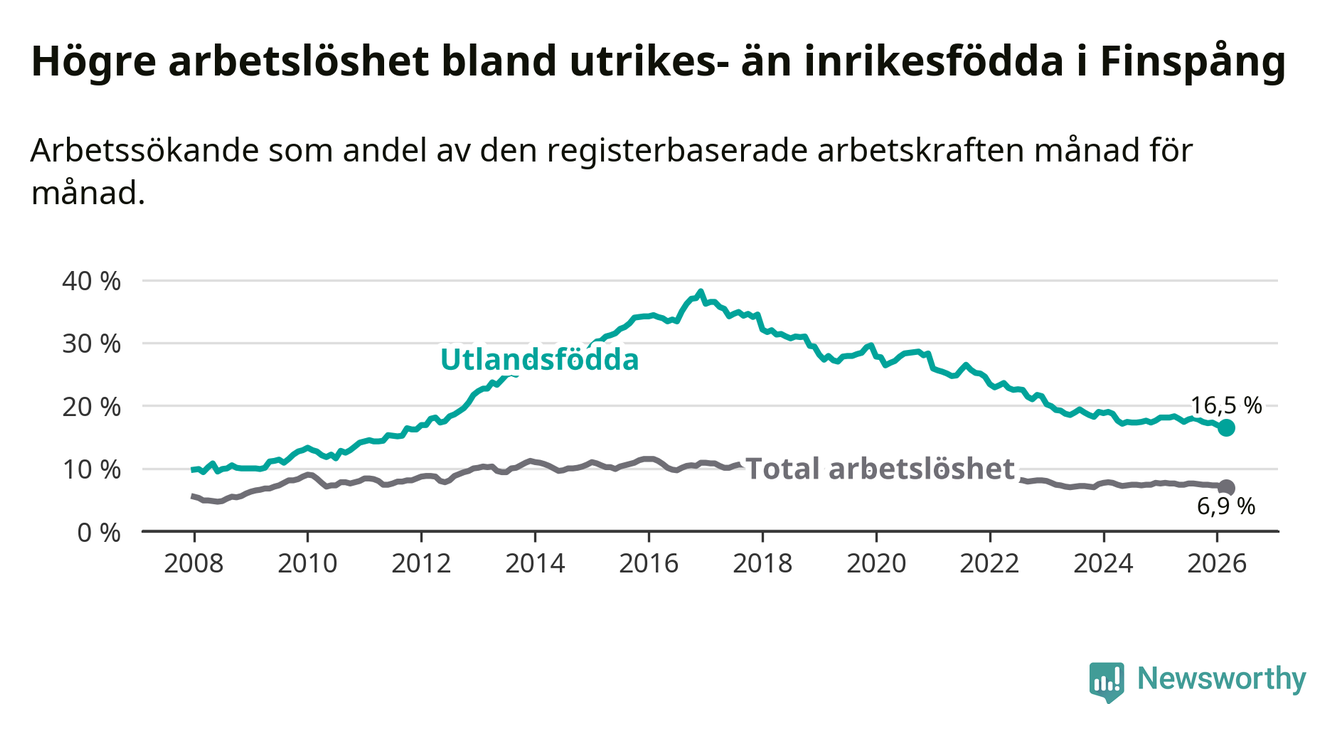 Arbetslösheten bland utlandsfödda var 16,5 procent i Finspång under mars månad, motsvarande 327 av 1 982 personer. Det är 1,6 procentenheter färre än vid samma tidpunkt i fjol (−34 om man räknar personer). Därmed är de utlandsföddas arbetslöshet lägre än vid samma tidpunkt i fjol för sjätte månaden i följd. Sedan september 2025 har arbetslösheten bland utlandsfödda minskat från 17,8 till 16,5 procent. Den nuvarande arbetslöshetsnivån är den lägsta sedan december 2011.