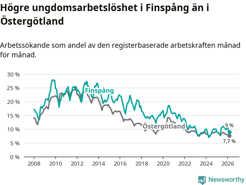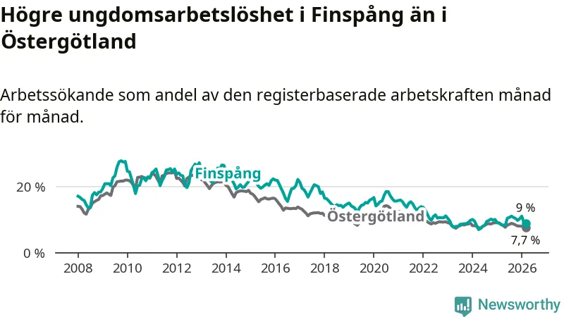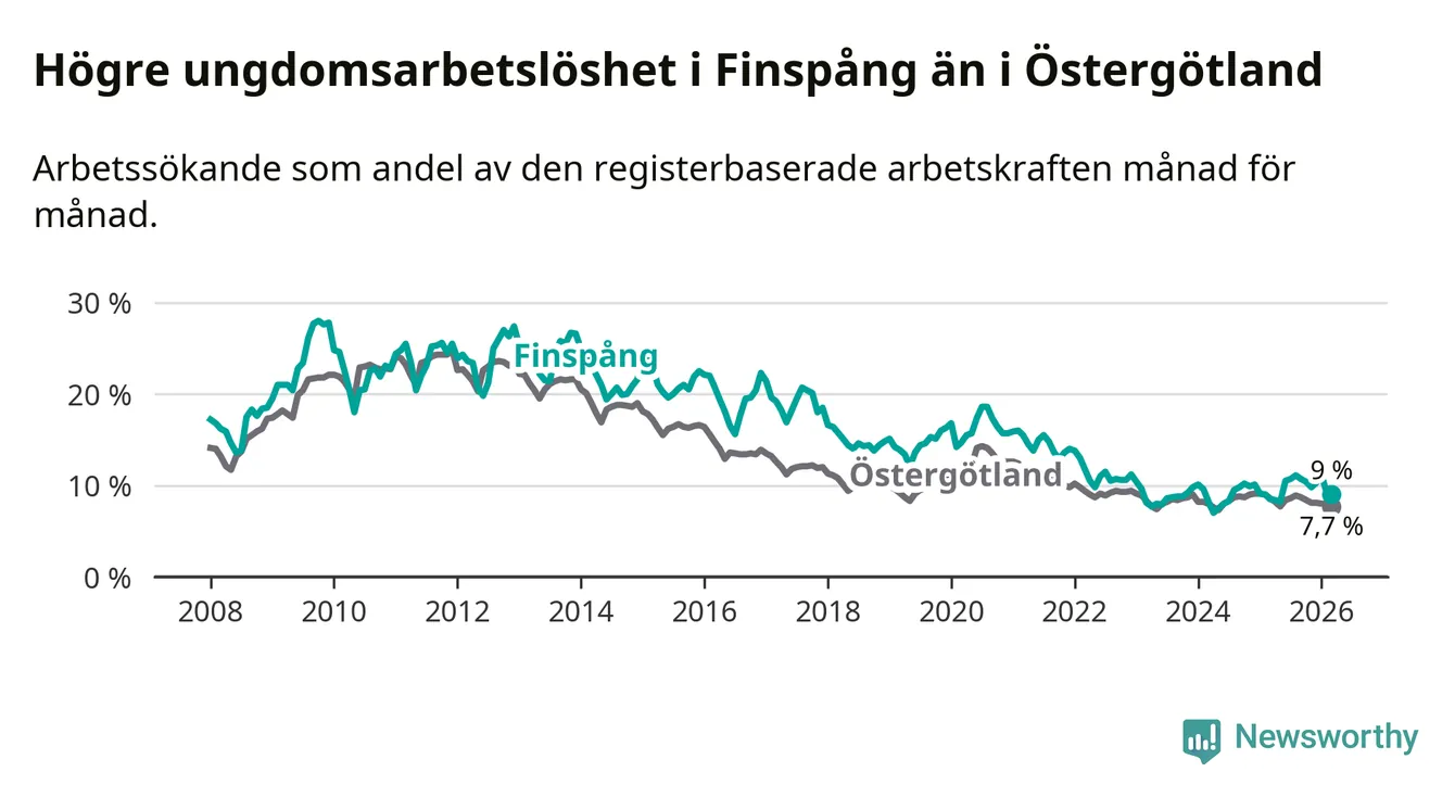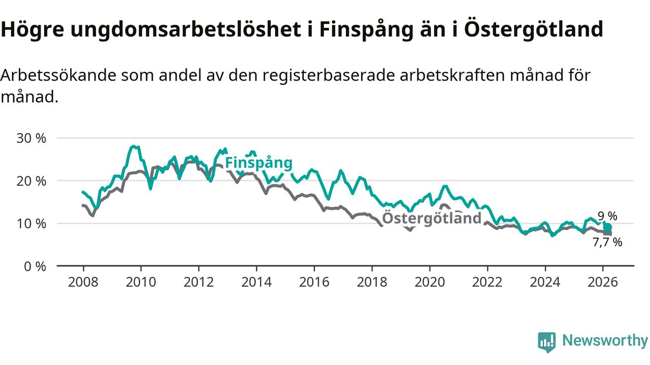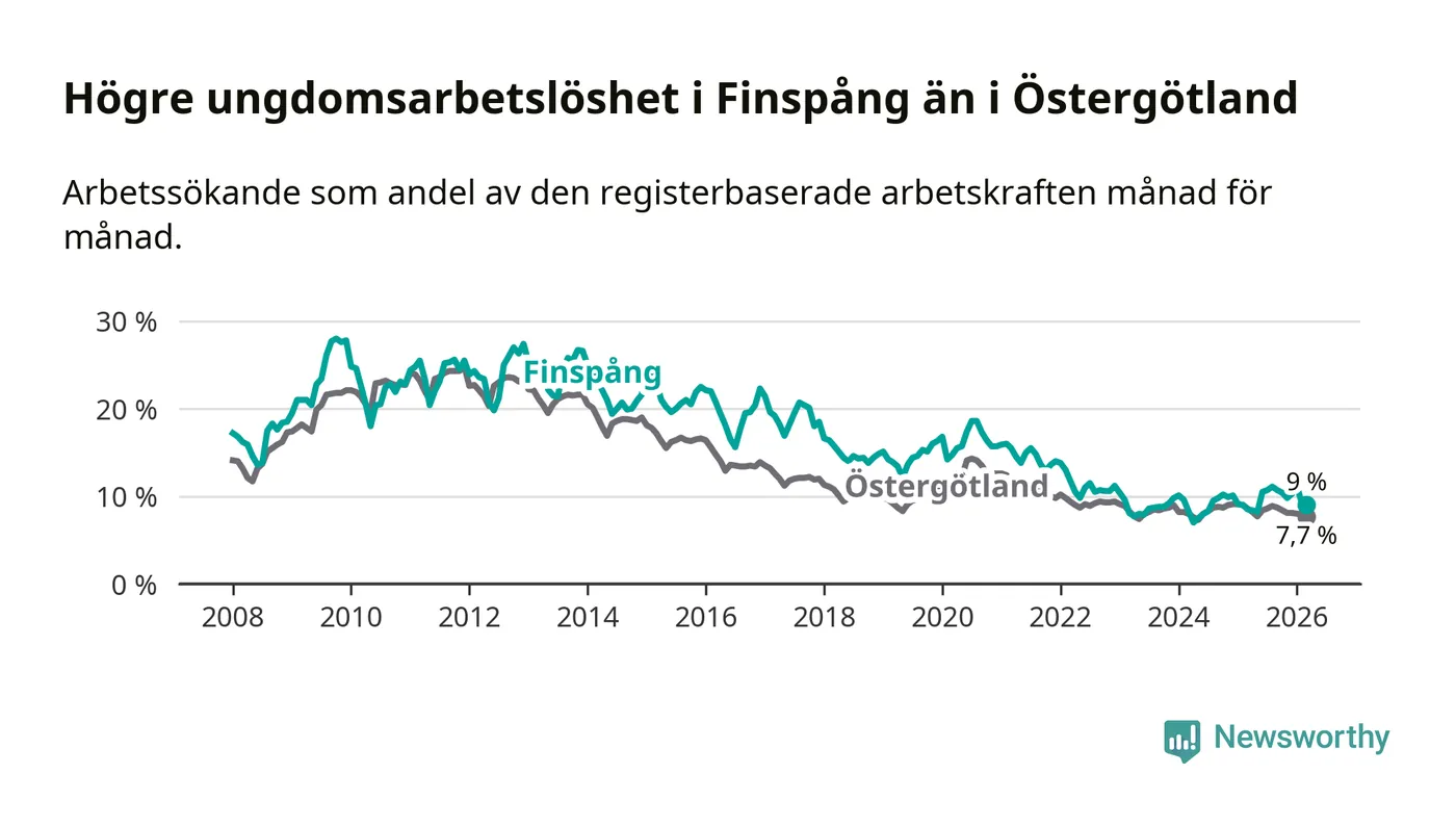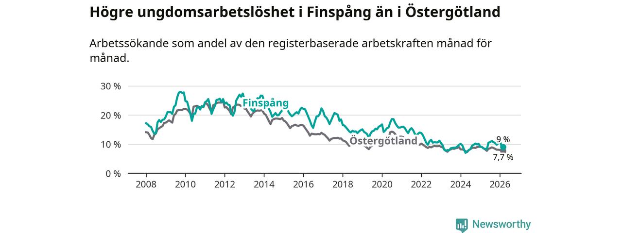 Medan Finspång har ungefär samma total arbetslöshet som Östergötland, ligger ungdomsarbetslösheten 1,3 procentenheter högre i Finspång.