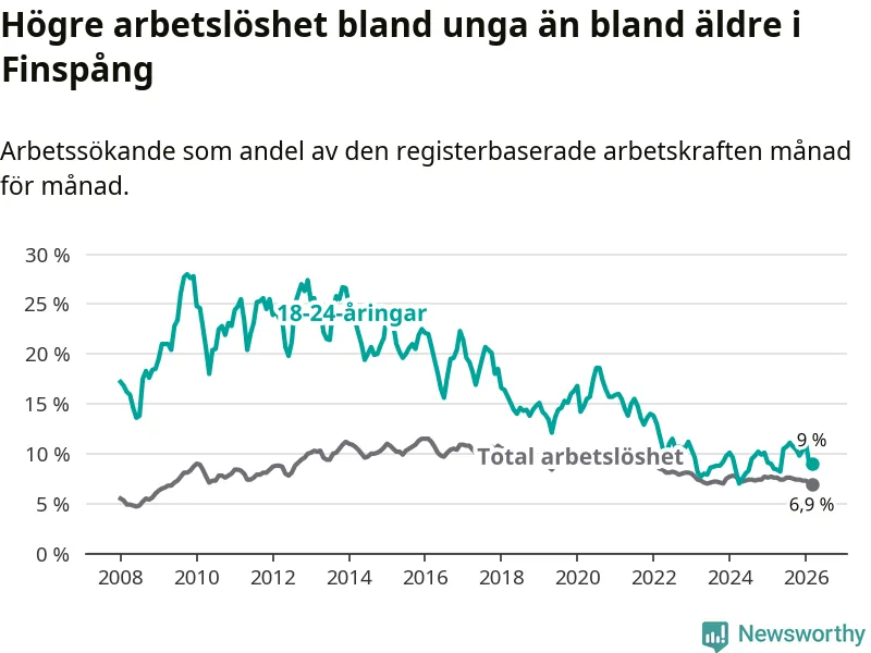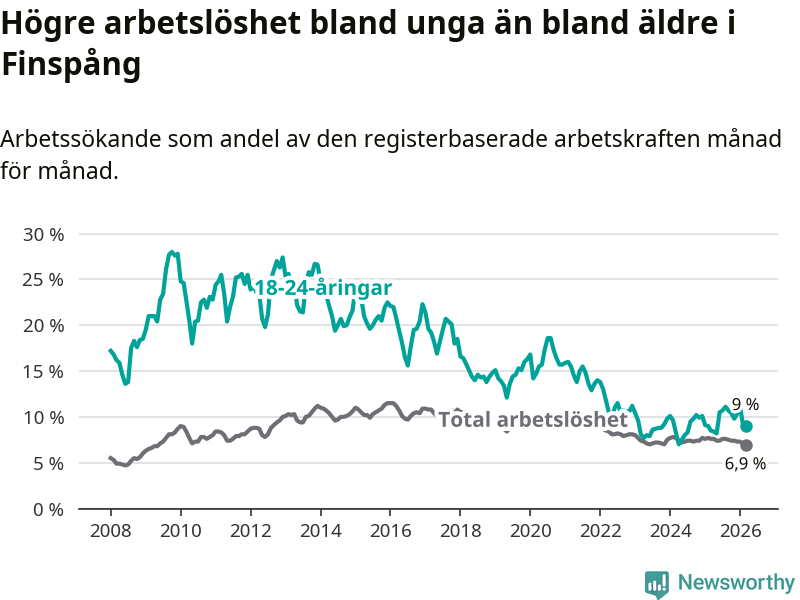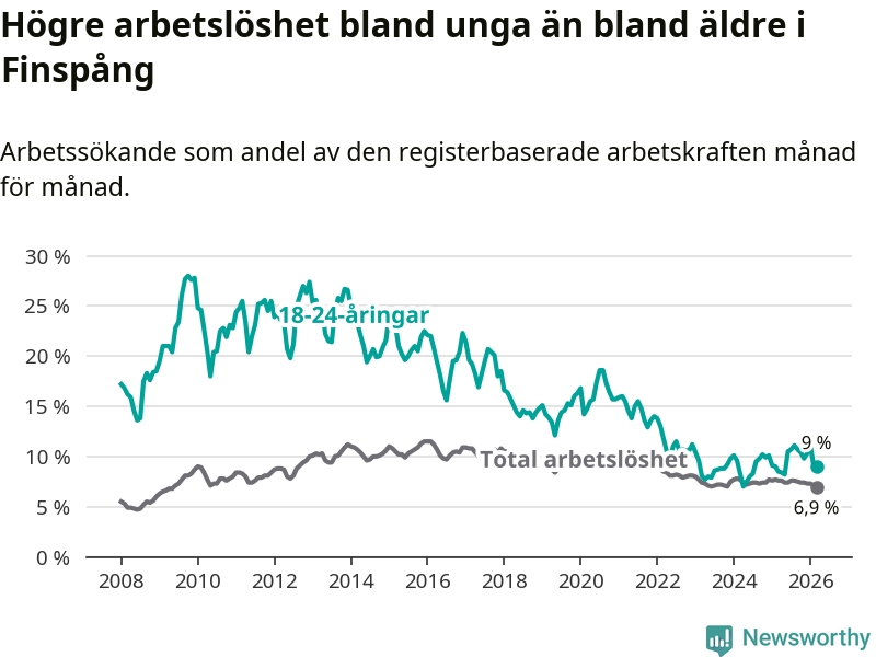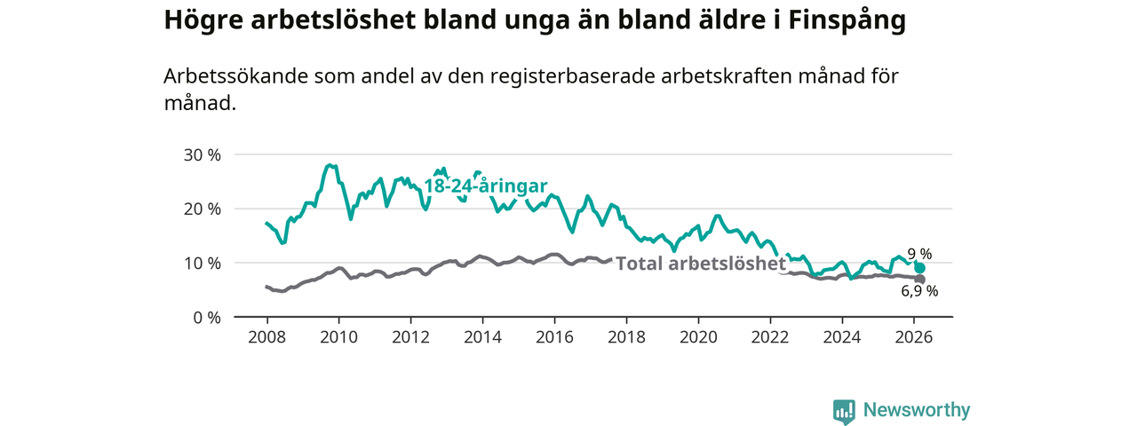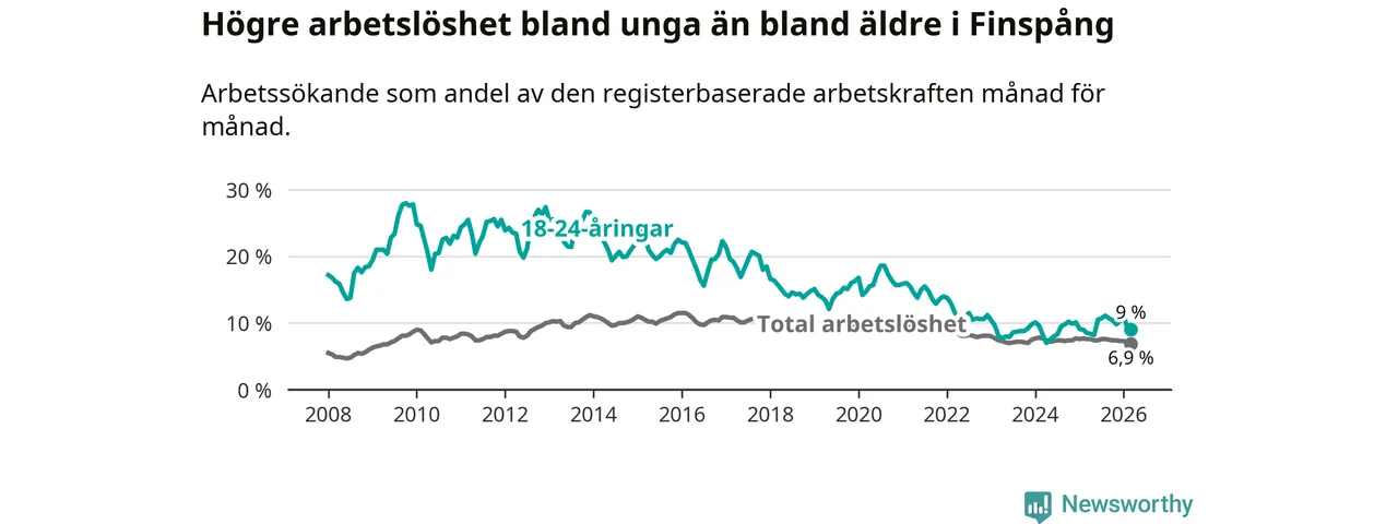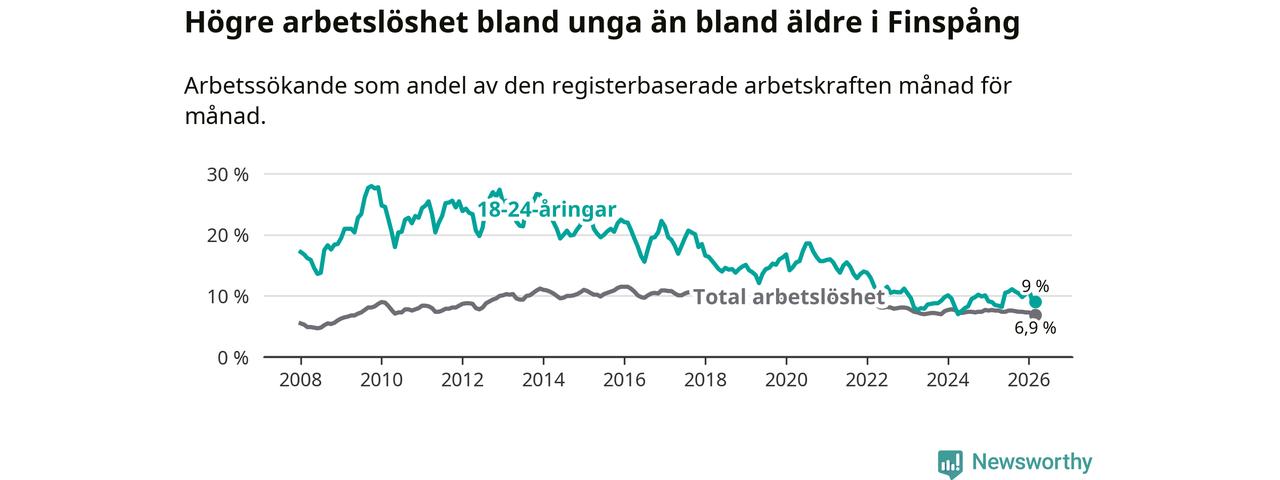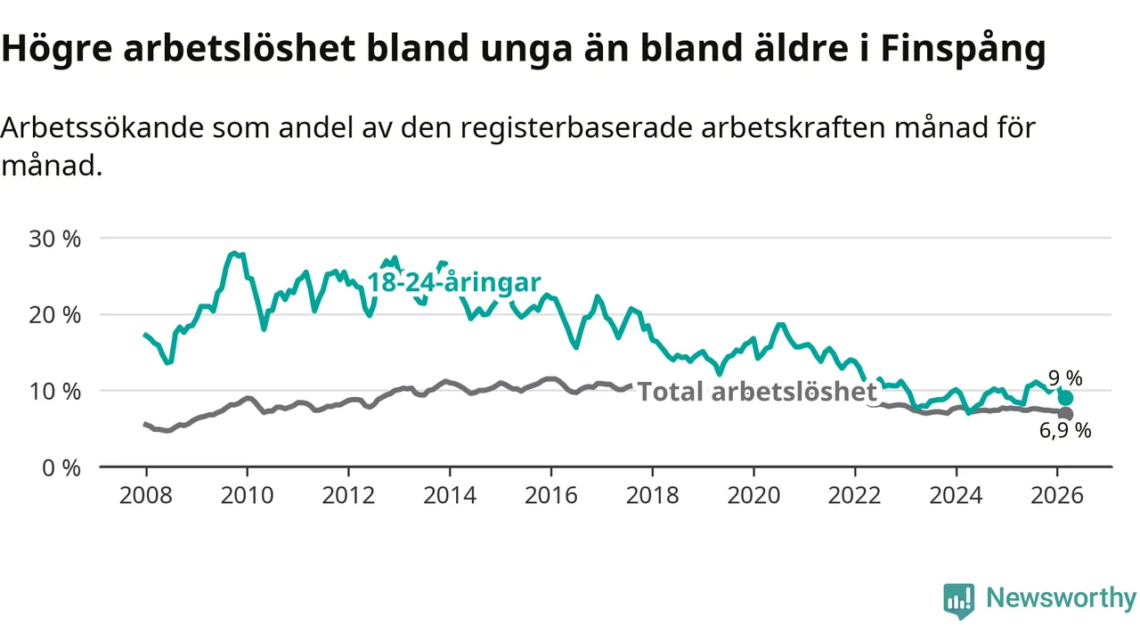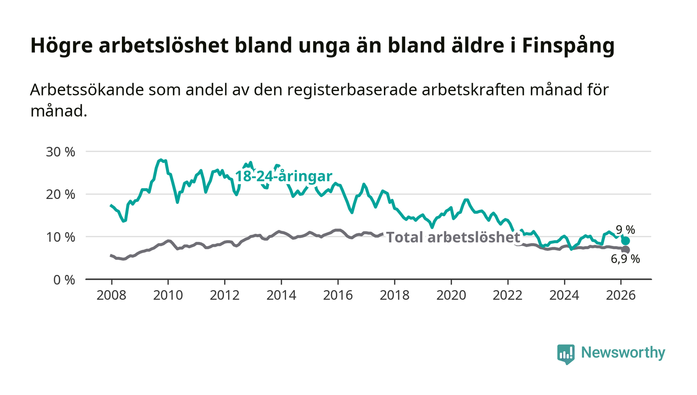 Medan Finspång har ungefär samma total arbetslöshet som Östergötland, ligger ungdomsarbetslösheten 1,3 procentenheter högre i Finspång.