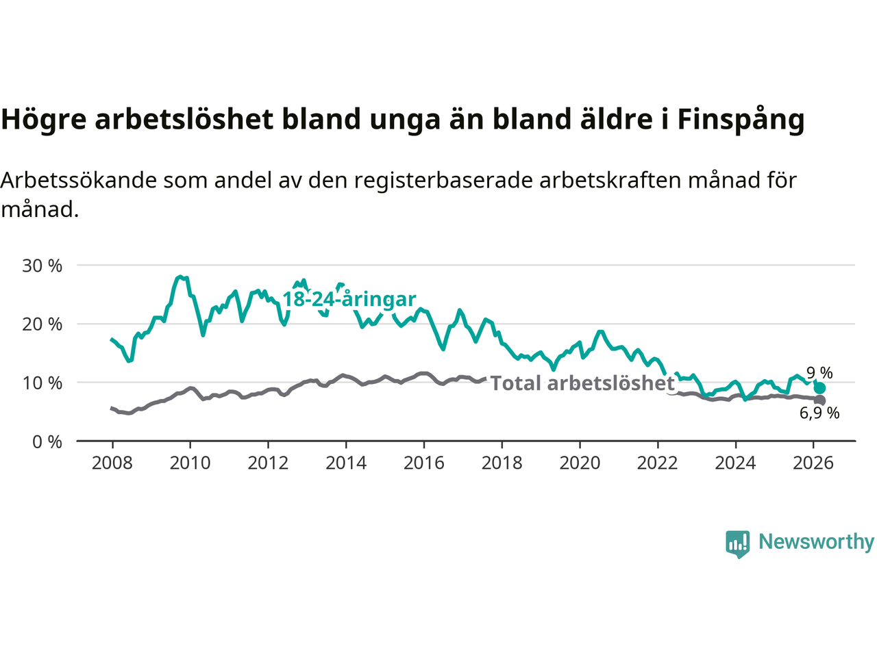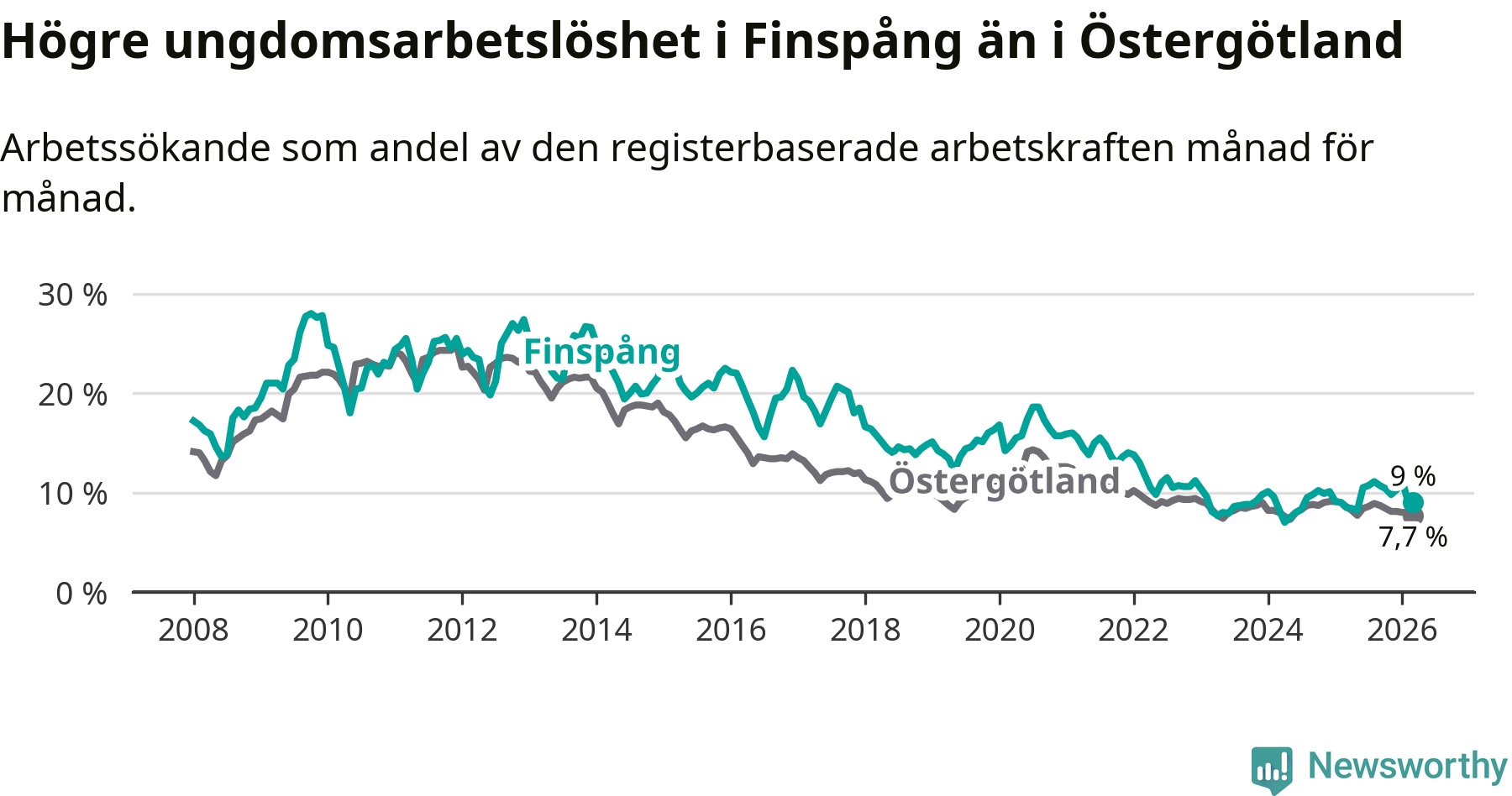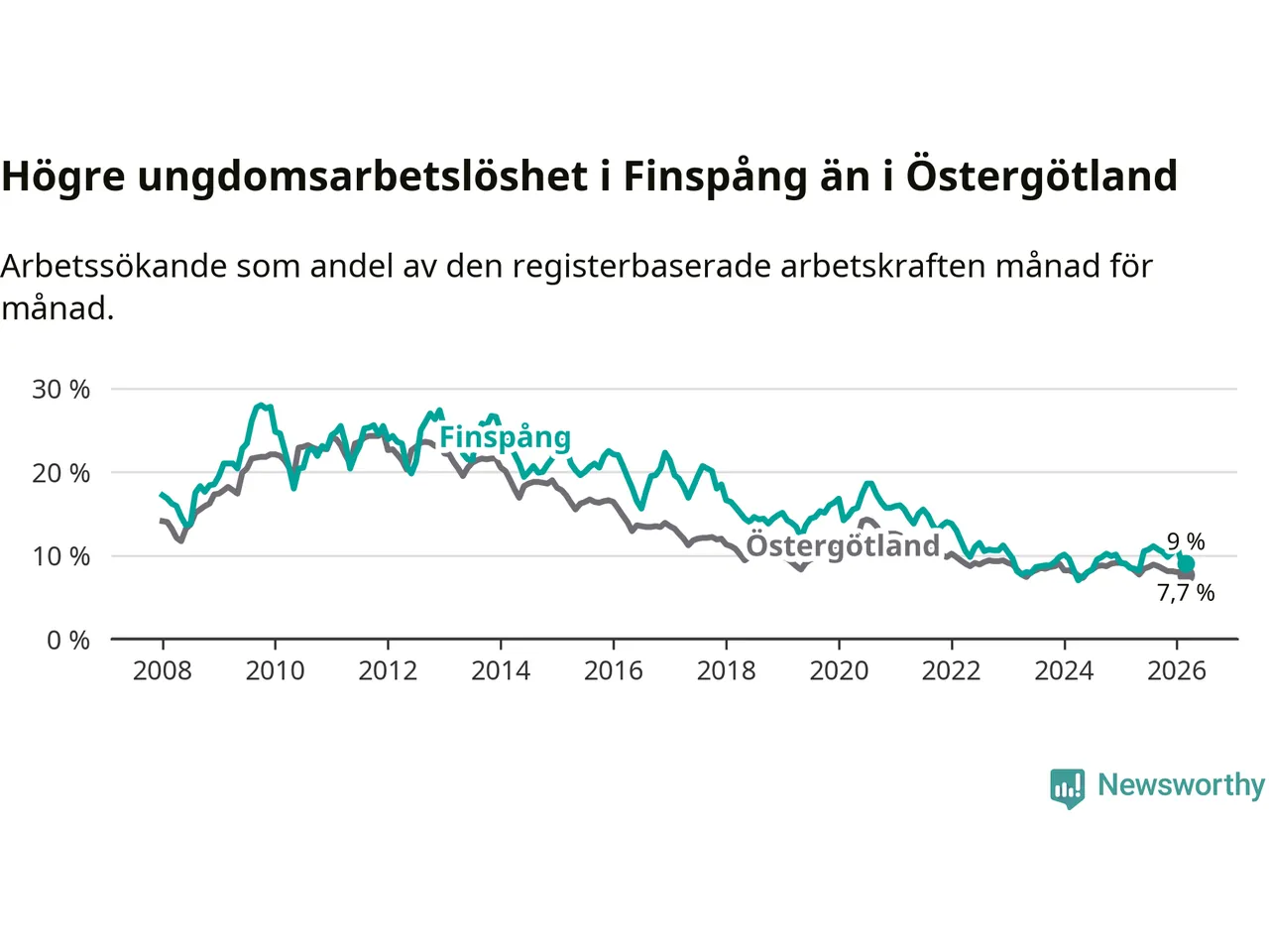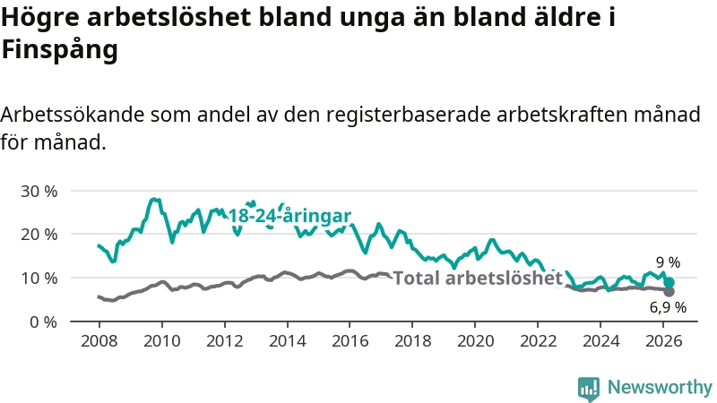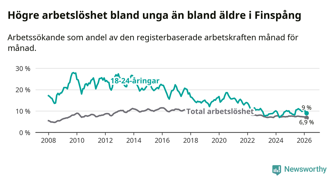 Medan Finspång har ungefär samma total arbetslöshet som Östergötland, ligger ungdomsarbetslösheten 1,3 procentenheter högre i Finspång.