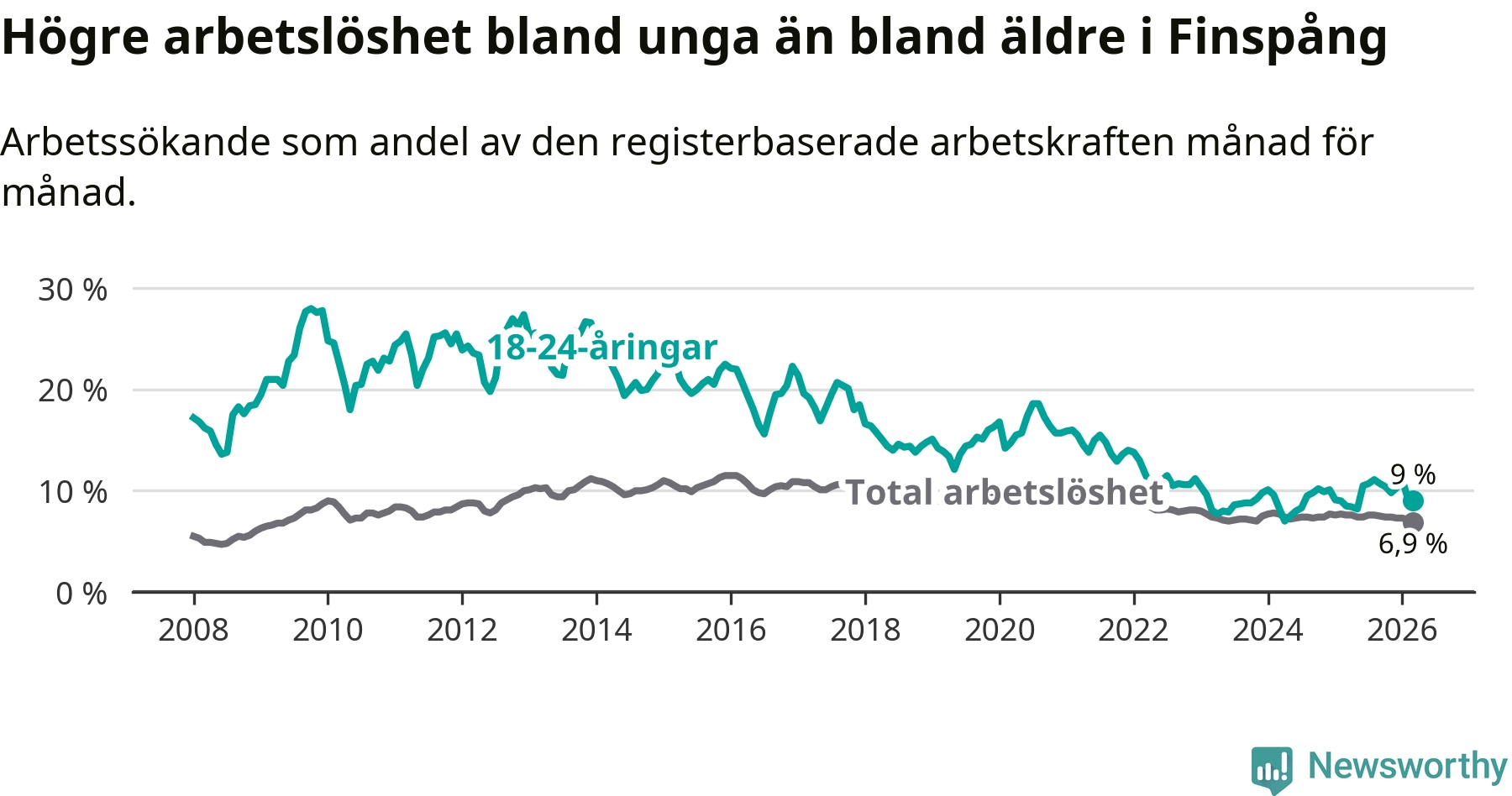 Till skillnad från den totala arbetslösheten stiger arbetslösheten bland unga (+0,5 procentenheter). I mars var 9,0 procent av 18–24-åringarna inskrivna som arbetssökande (motsvarande 82 personer). Mäter vi antalet inskrivna ser vi en ökning med två personer på ett års sikt.