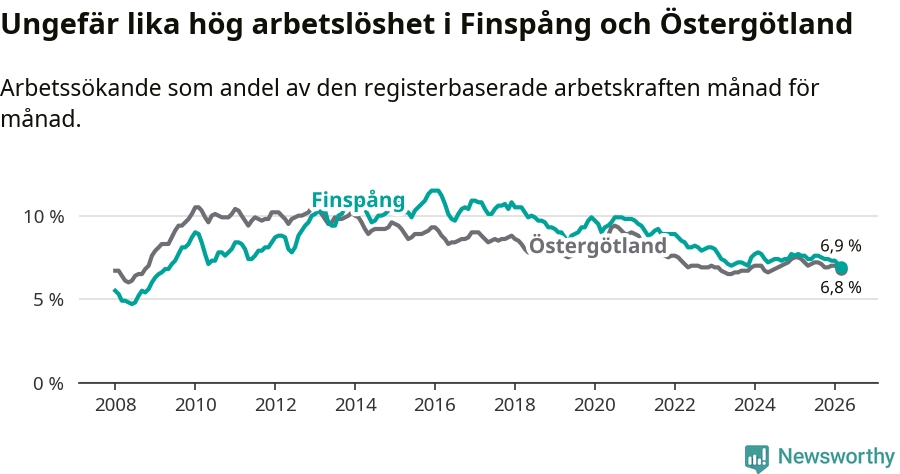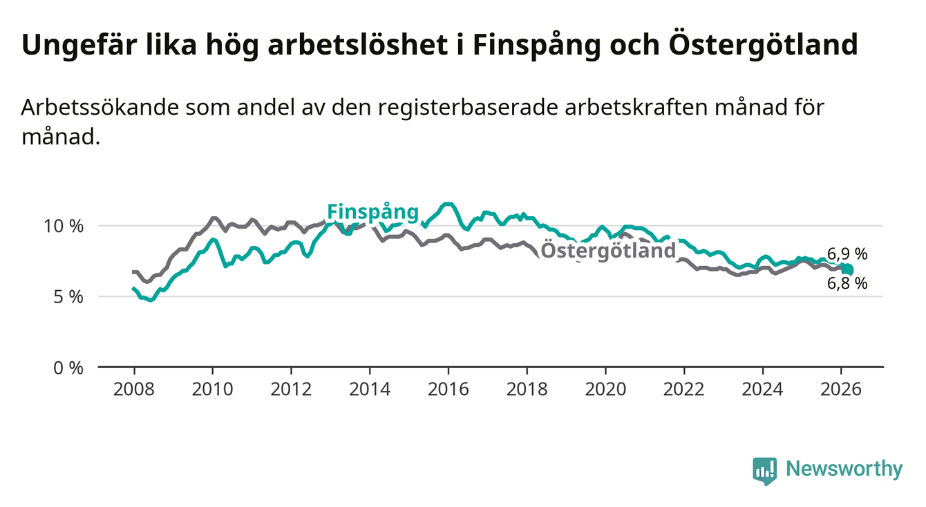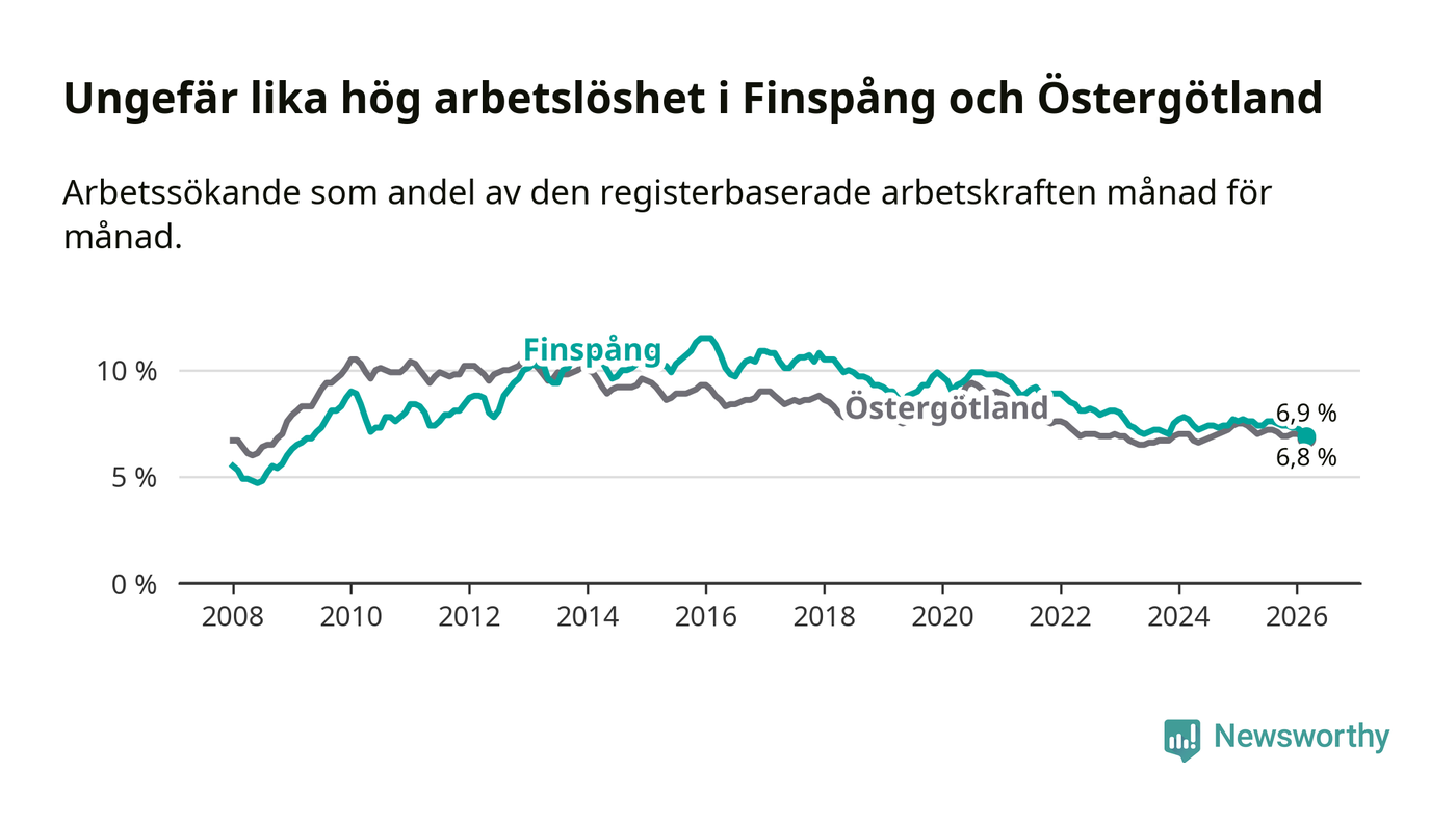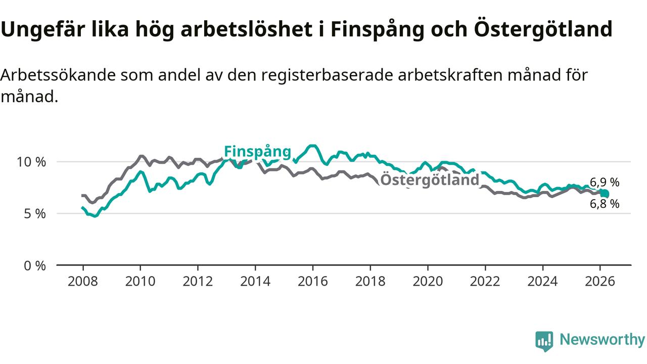 Under mars månad rapporterade Finspångs kommun en total arbetslöshet på 6,9 procent. Det är en minskning jämfört med samma tidpunkt i fjol (−0,7 procentenheter). Även i Östergötlands län sjunker arbetslösheten .