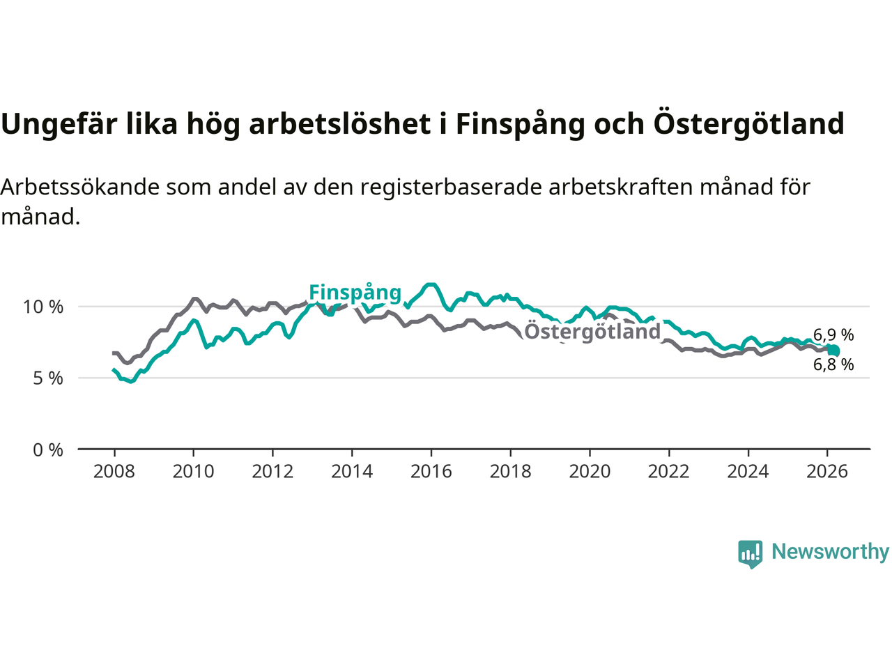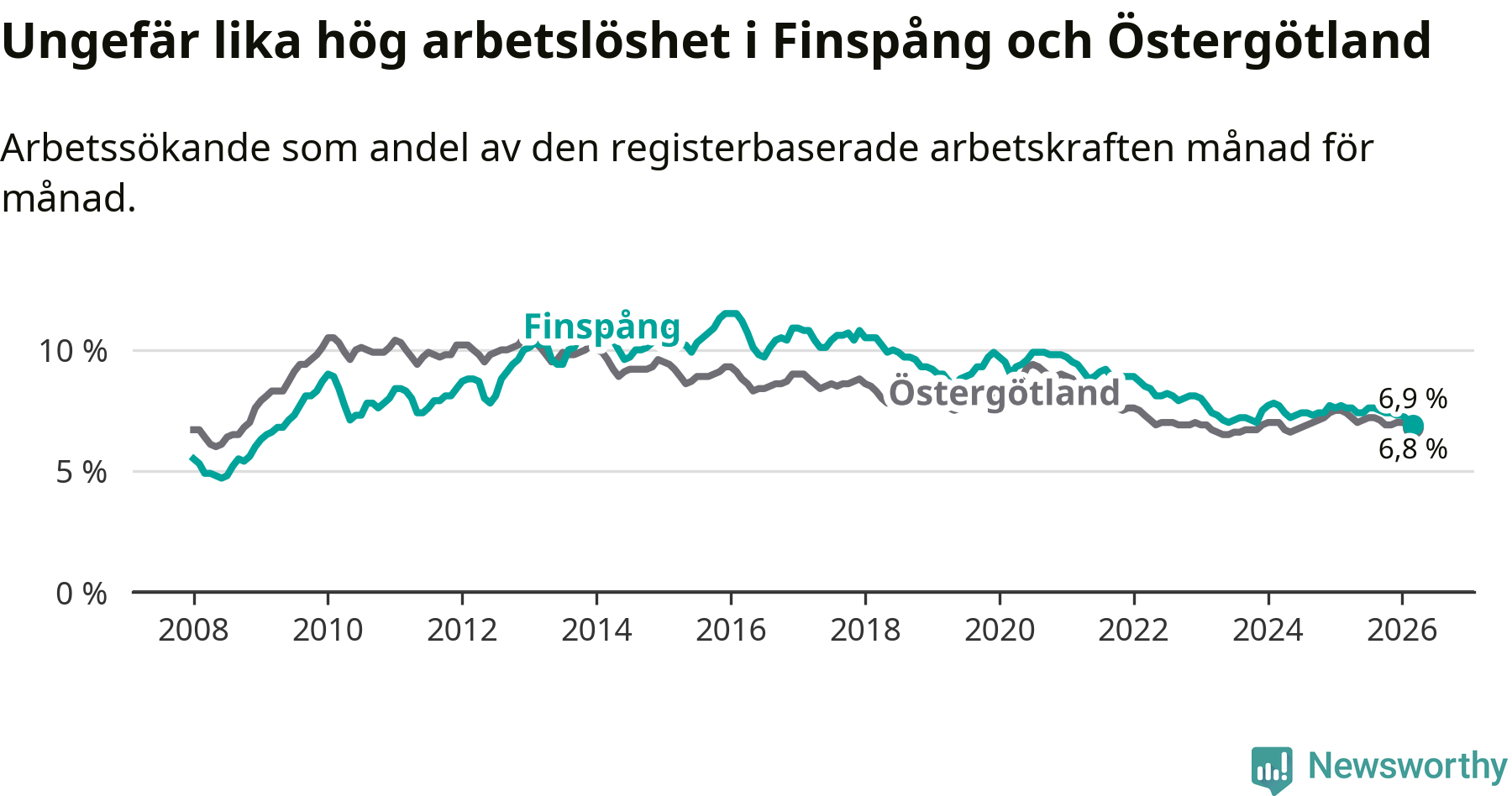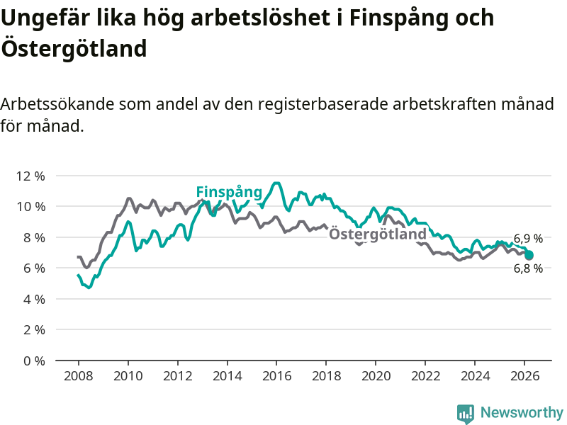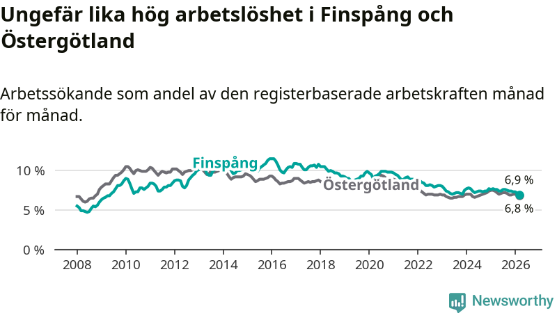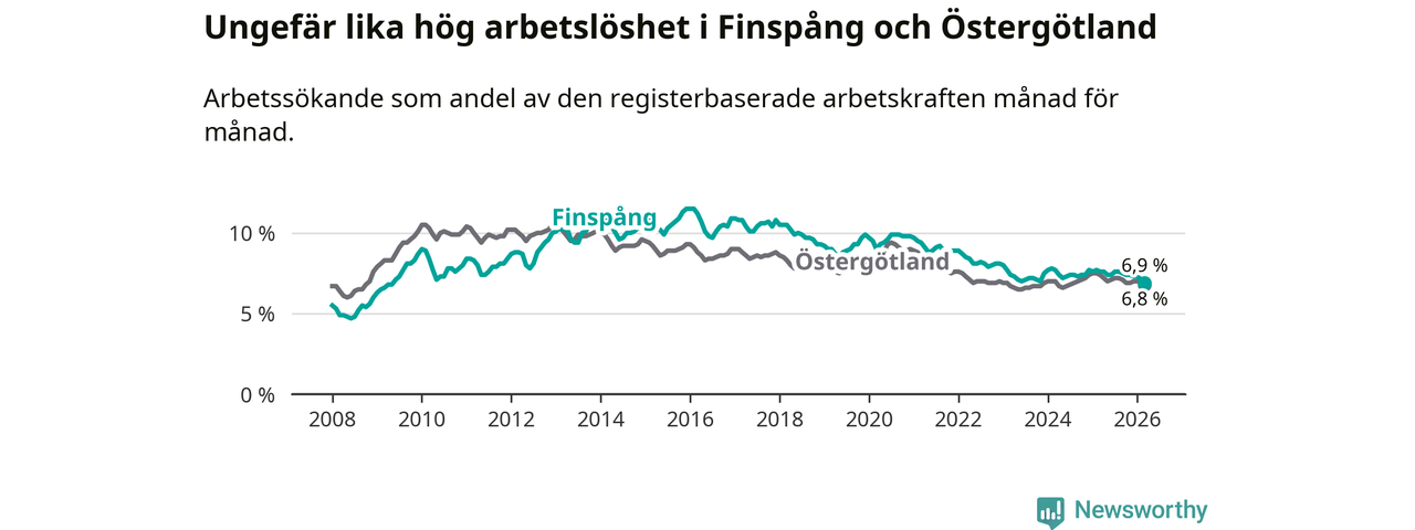 Under mars månad rapporterade Finspångs kommun en total arbetslöshet på 6,9 procent. Det är en minskning jämfört med samma tidpunkt i fjol (−0,7 procentenheter). Även i Östergötlands län sjunker arbetslösheten .