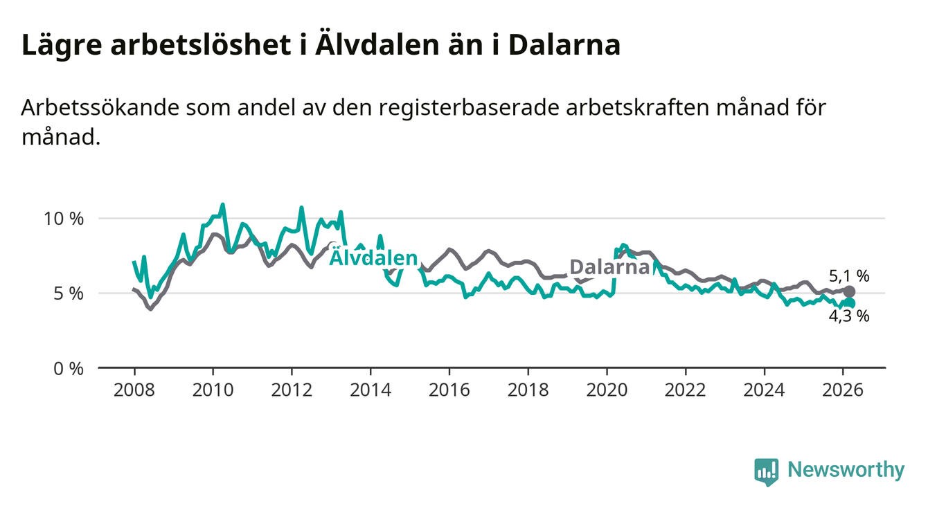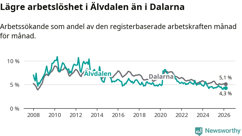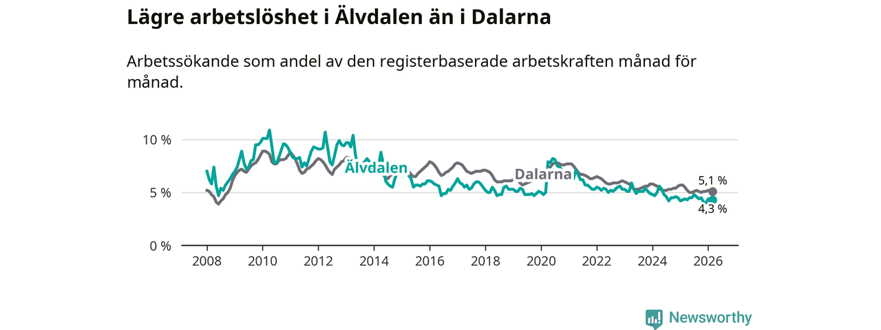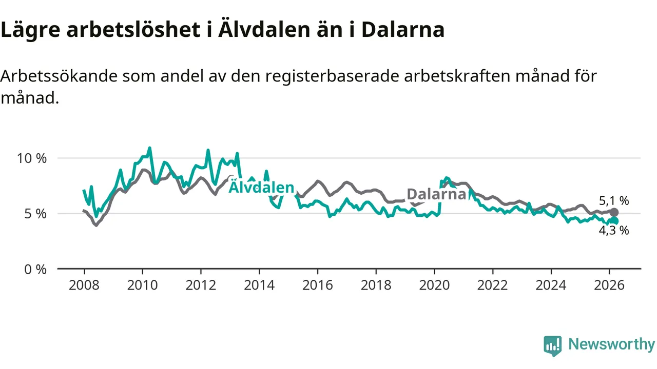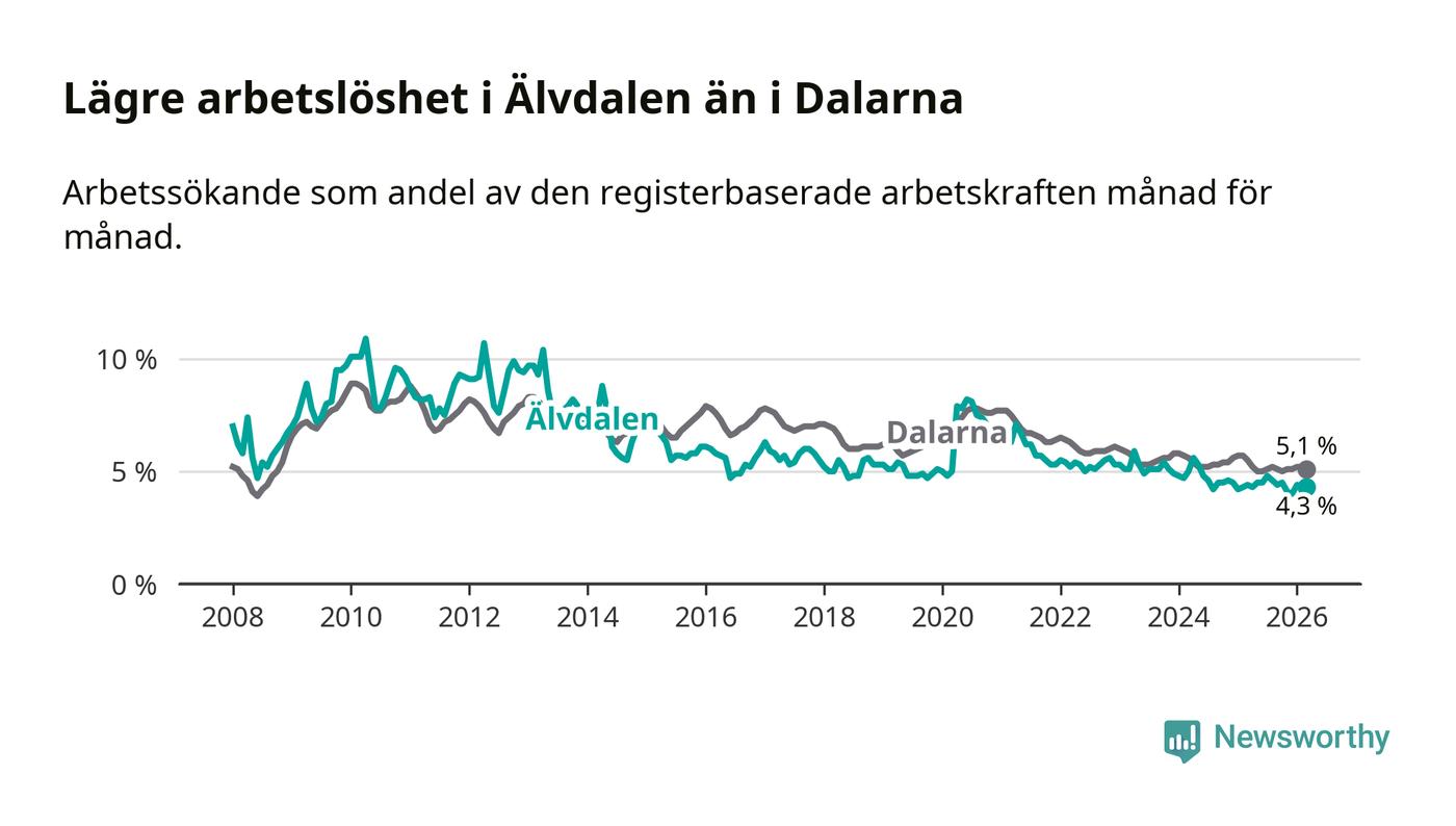 Under mars månad rapporterade Älvdalens kommun en total arbetslöshet på 4,3 procent. Det är en minskning jämfört med samma tidpunkt i fjol (−0,1 procentenheter). Även i Dalarnas län sjunker arbetslösheten .