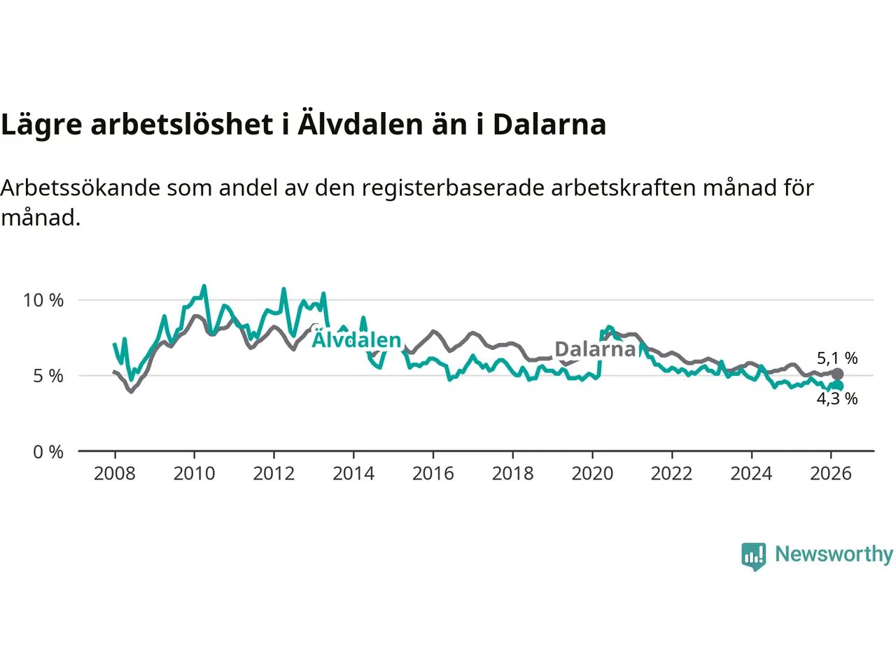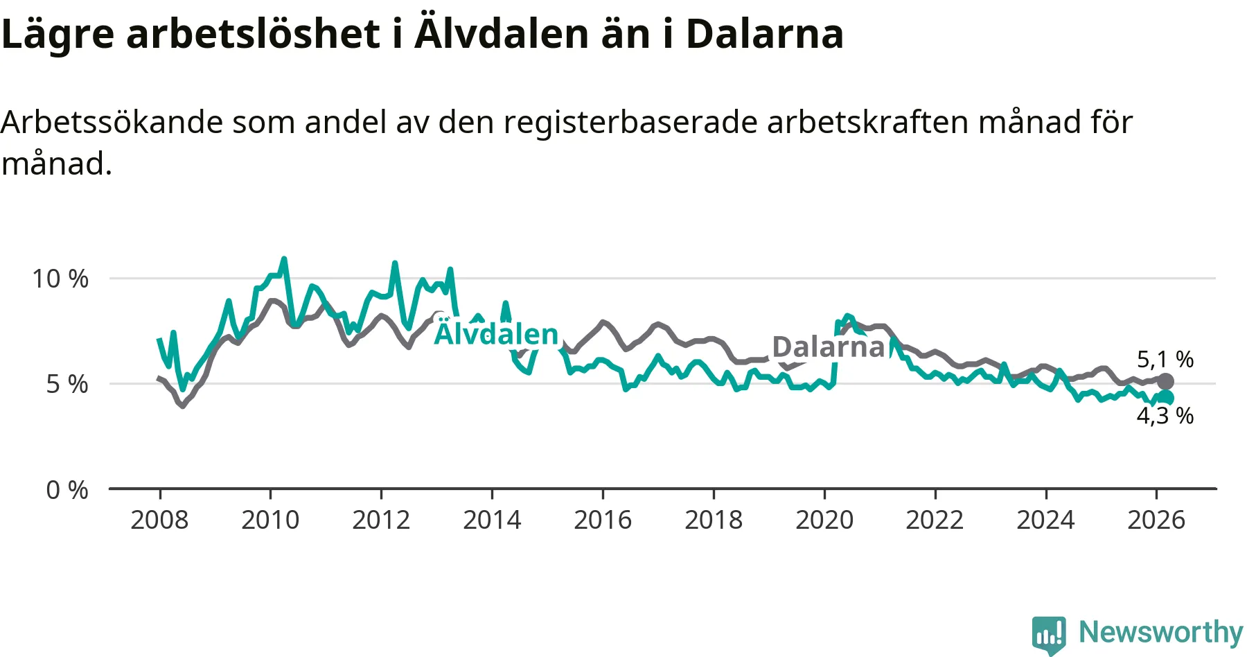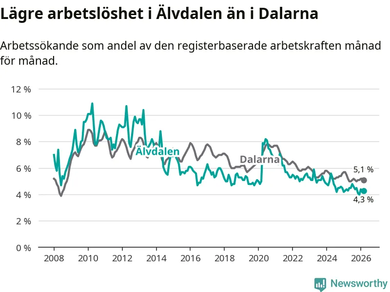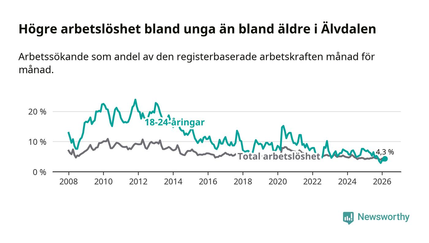 Under mars månad rapporterade Älvdalens kommun en total arbetslöshet på 4,3 procent. Det är en minskning jämfört med samma tidpunkt i fjol (−0,1 procentenheter). Även i Dalarnas län sjunker arbetslösheten .