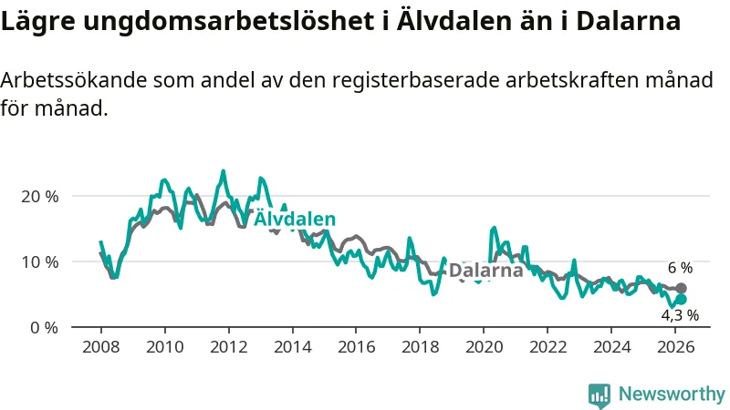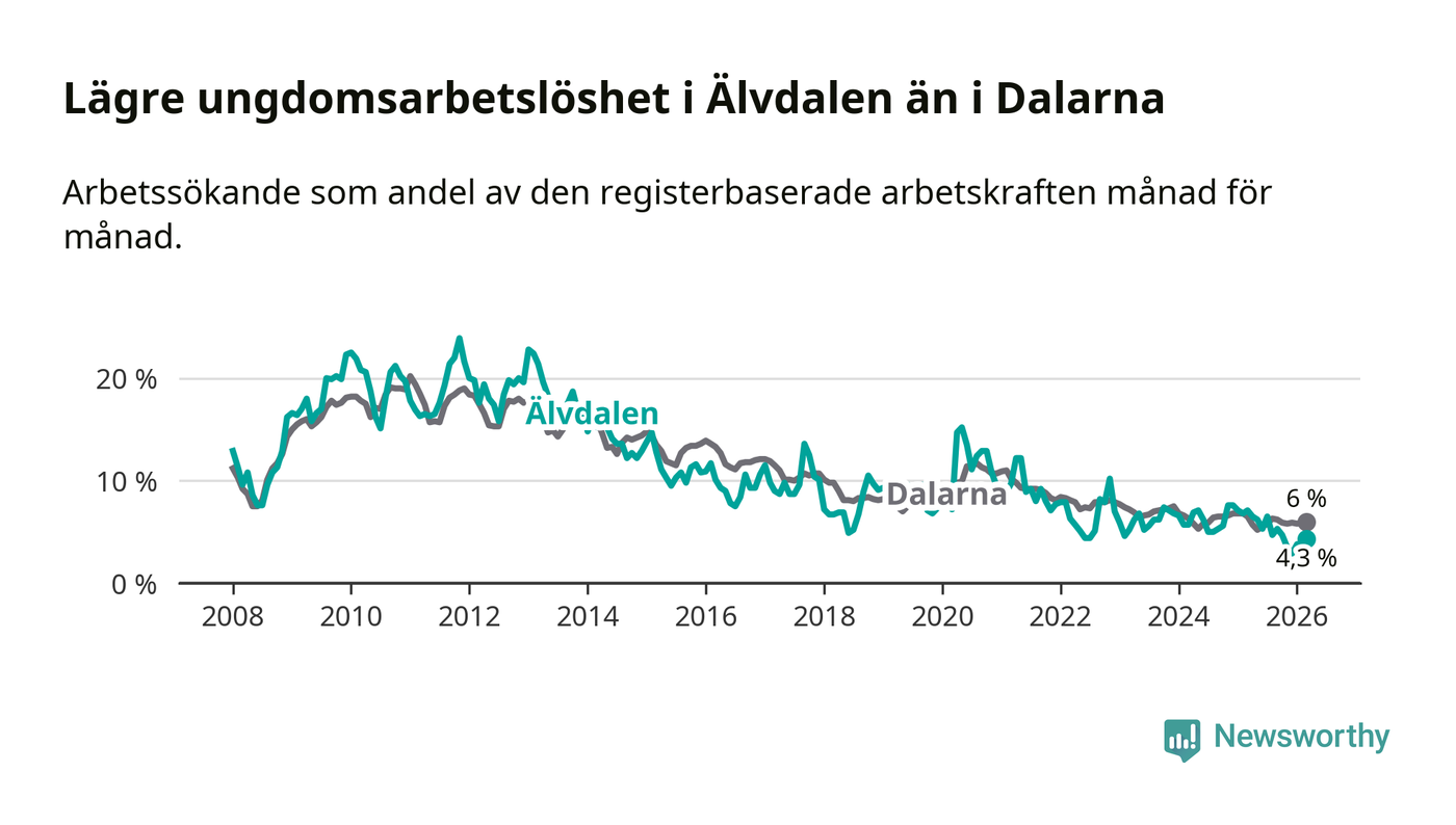 Precis som den totala arbetslösheten ligger ungdomsarbetslösheten i Älvdalen lägre än i Dalarna som helhet. Skillnaden mellan kommunen och länet är 1,7 procentenheter.