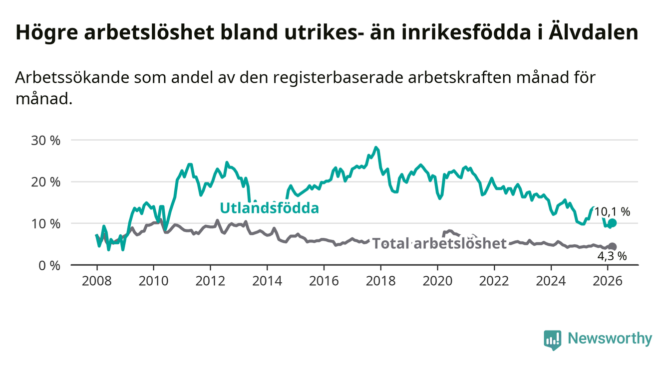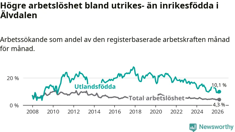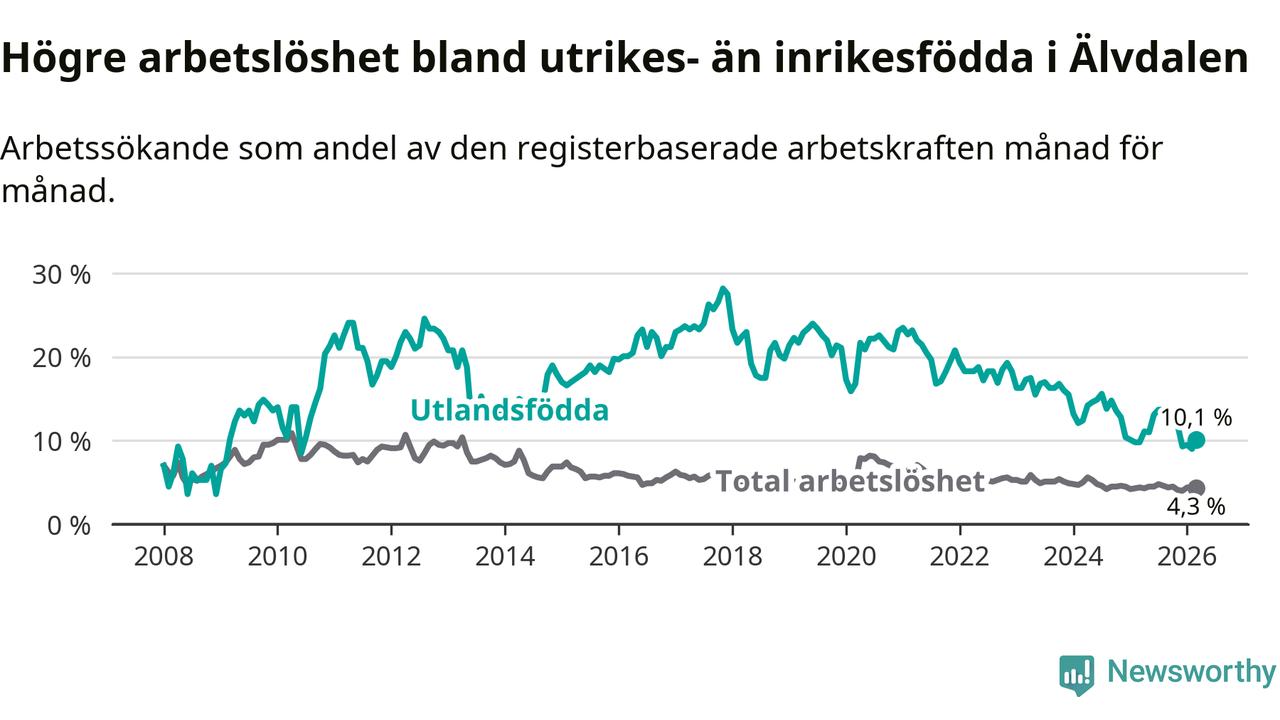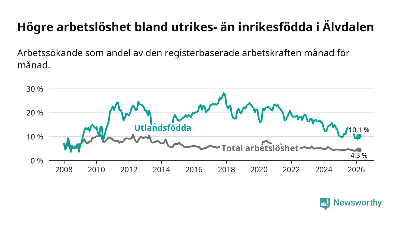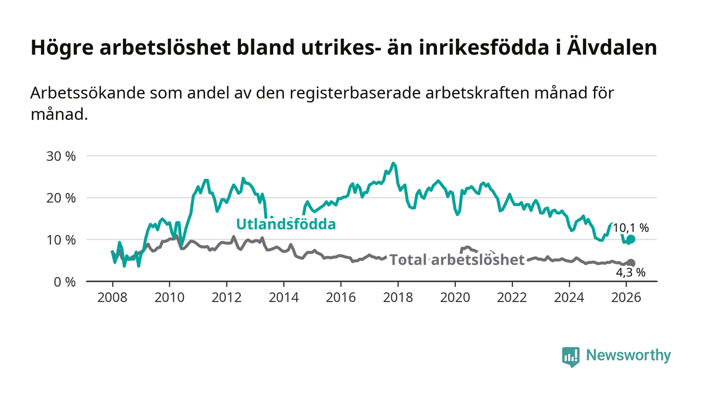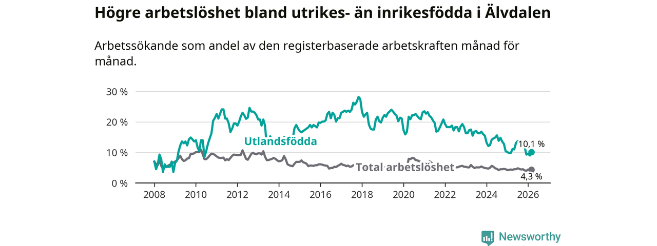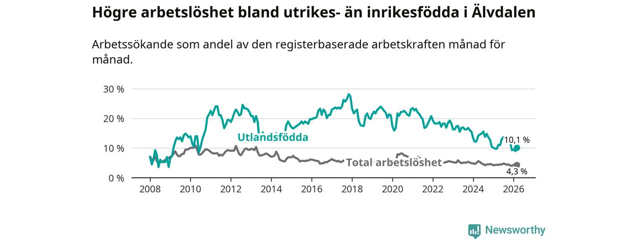 Arbetslösheten bland utlandsfödda var 10,1 procent i Älvdalen under mars månad, motsvarande 34 av 337 personer. Det är 0,3 procentenheter fler än vid samma tidpunkt i fjol (+2 om man räknar personer). Den senaste månadens uppgång innebär ett trendbrott. Under de 40 föregående månaderna hade arbetslösheten bland utlandsfödda varit lägre än motsvarande tidpunkt året innan.