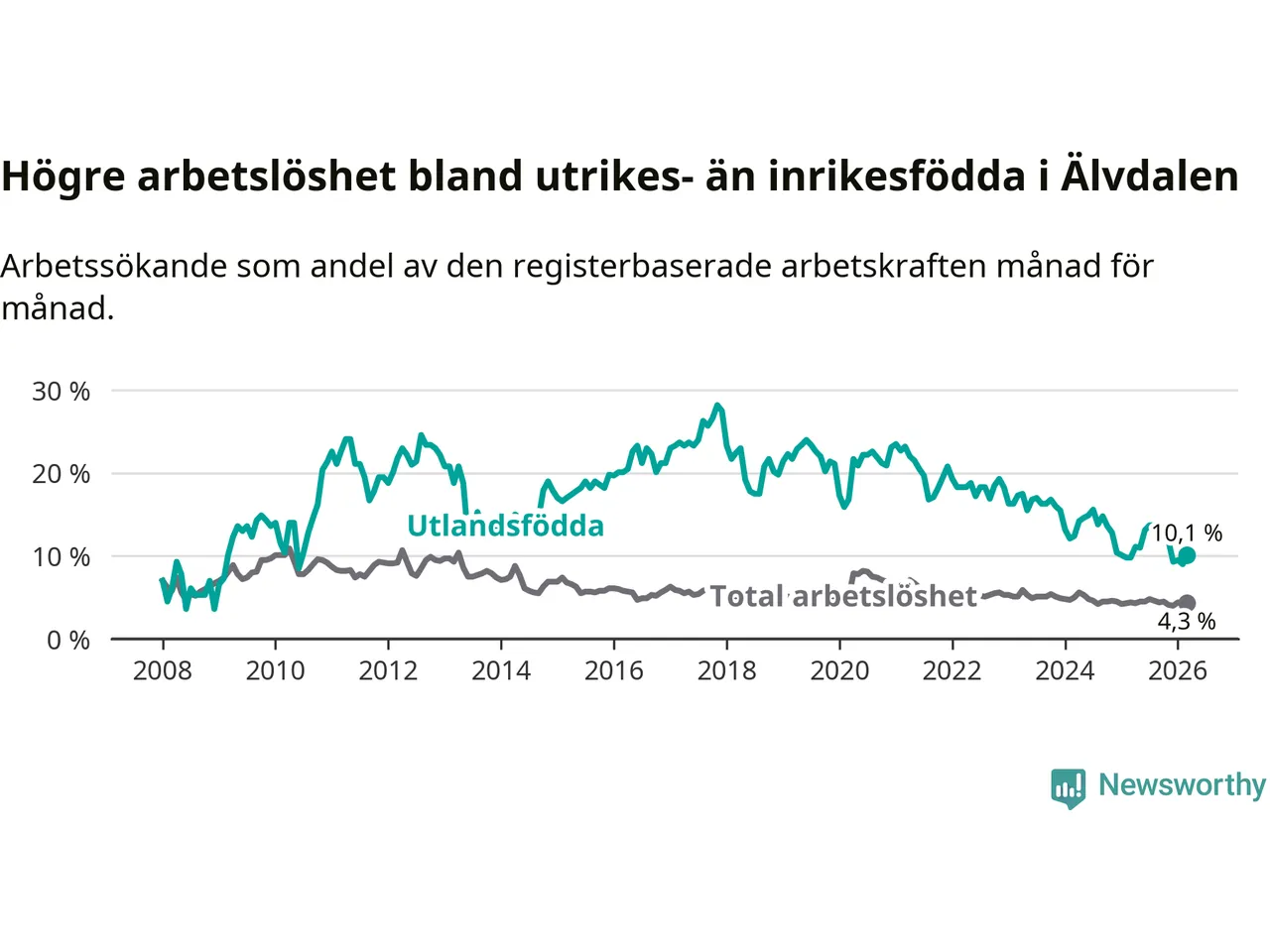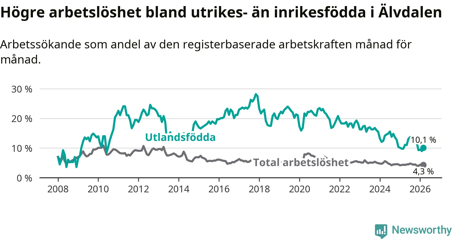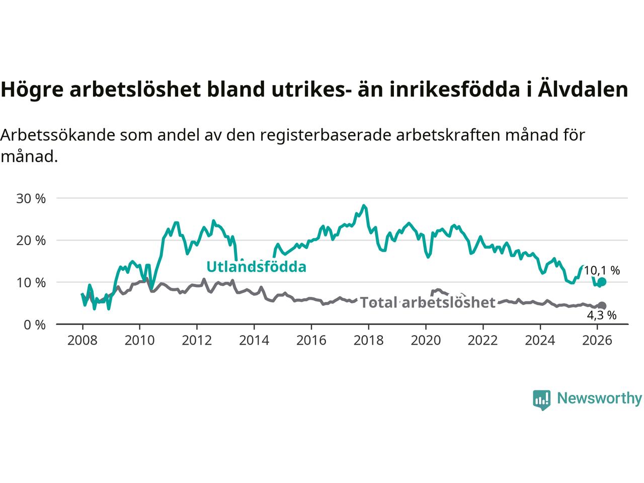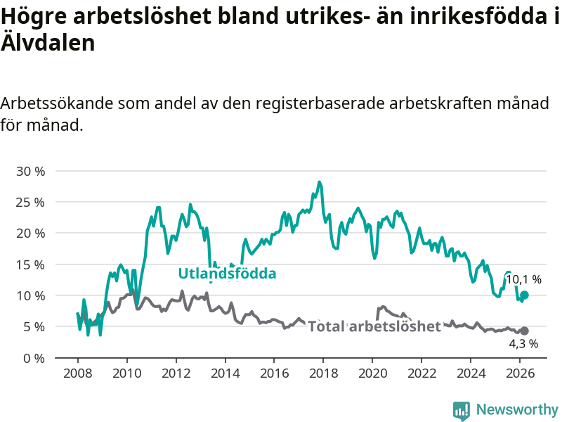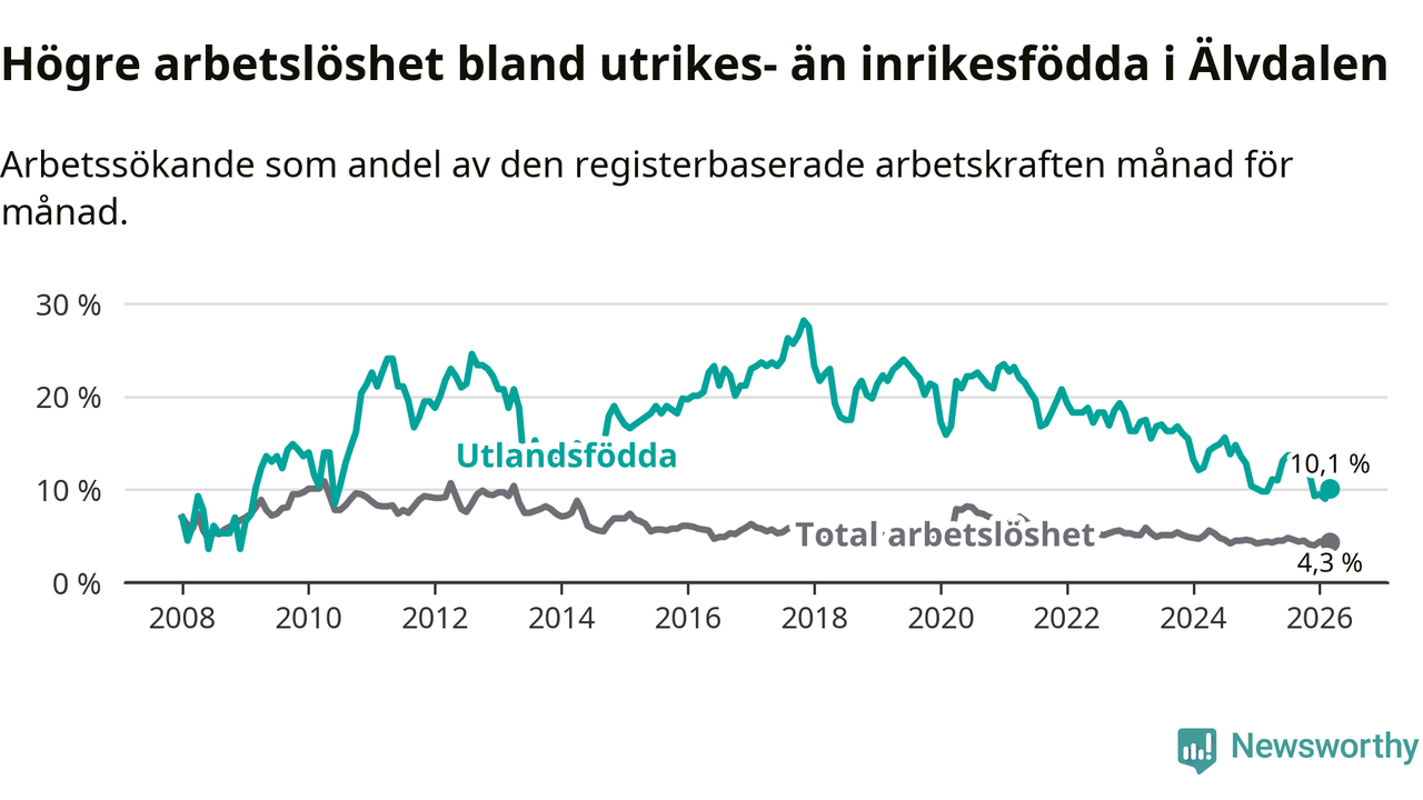 Arbetslösheten bland utlandsfödda var 10,1 procent i Älvdalen under mars månad, motsvarande 34 av 337 personer. Det är 0,3 procentenheter fler än vid samma tidpunkt i fjol (+2 om man räknar personer). Den senaste månadens uppgång innebär ett trendbrott. Under de 40 föregående månaderna hade arbetslösheten bland utlandsfödda varit lägre än motsvarande tidpunkt året innan.