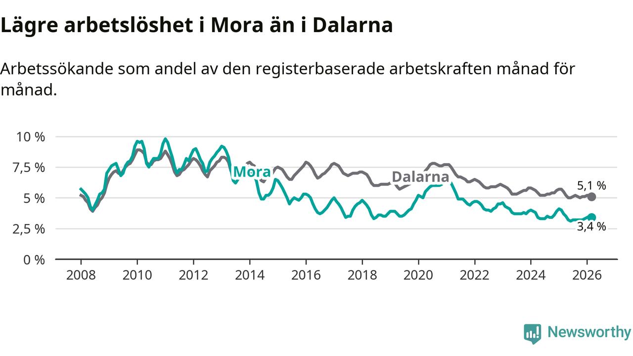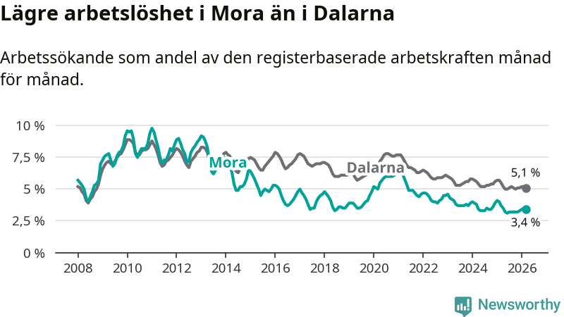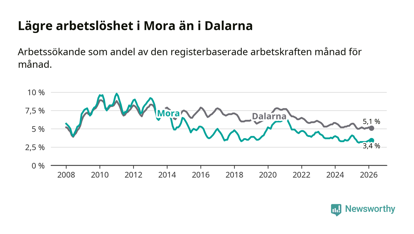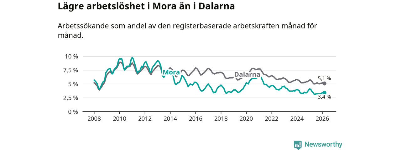 Under mars månad rapporterade Mora kommun en total arbetslöshet på 3,4 procent. Det är en minskning jämfört med samma tidpunkt i fjol (−0,3 procentenheter). Även i Dalarnas län sjunker arbetslösheten .