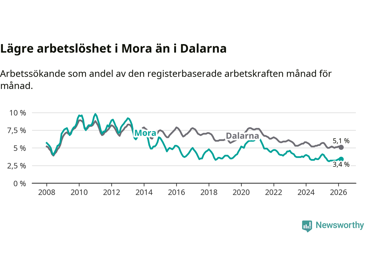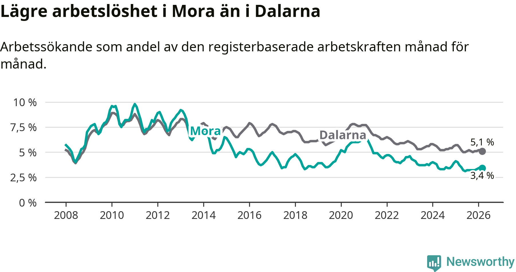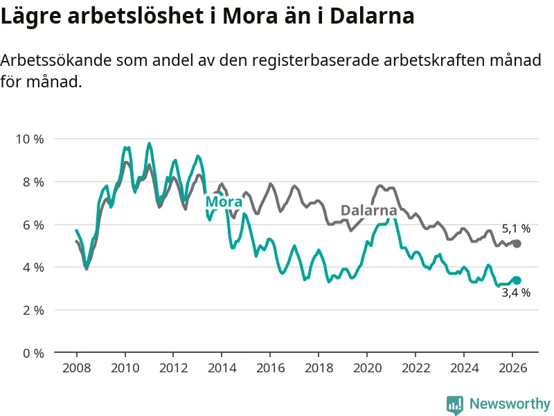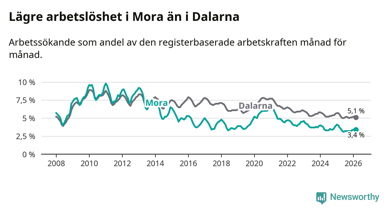 Under mars månad rapporterade Mora kommun en total arbetslöshet på 3,4 procent. Det är en minskning jämfört med samma tidpunkt i fjol (−0,3 procentenheter). Även i Dalarnas län sjunker arbetslösheten .