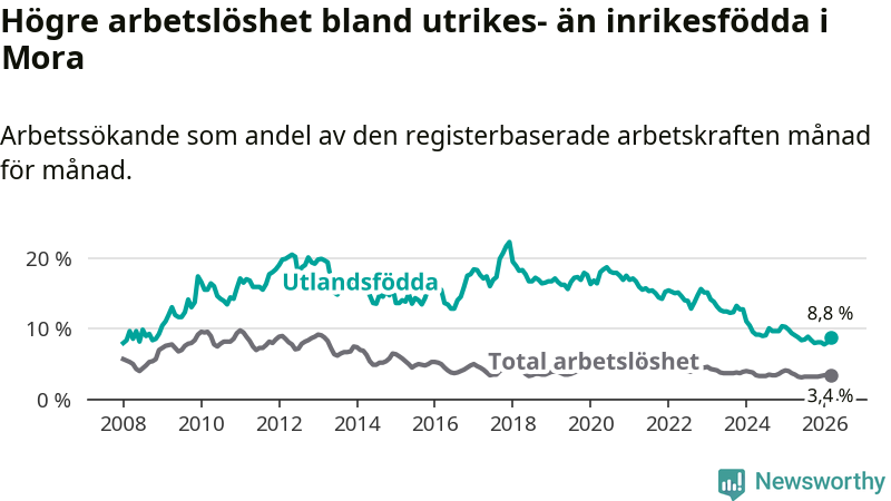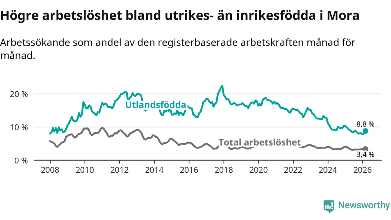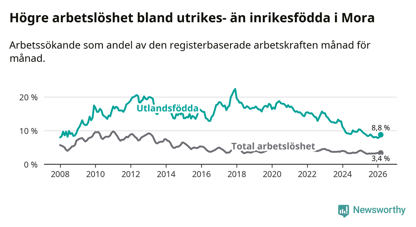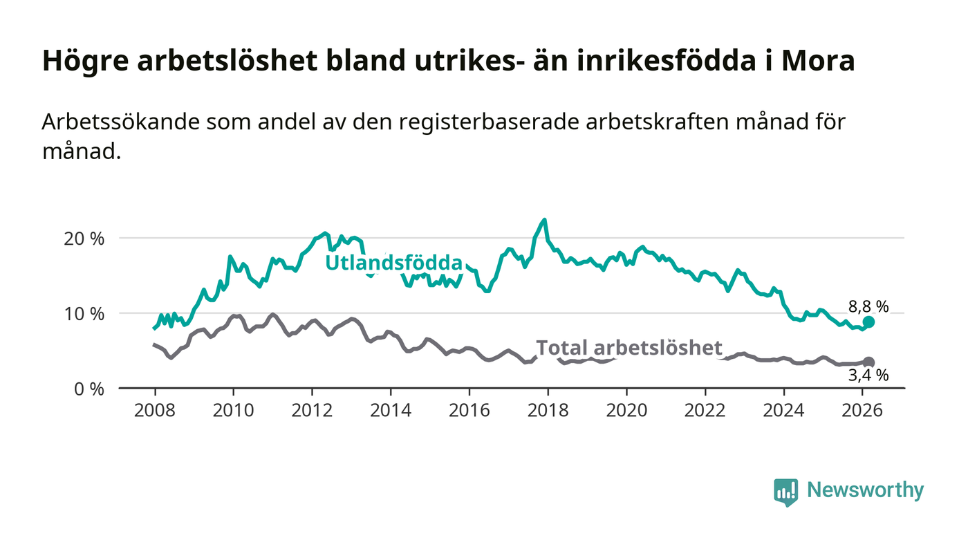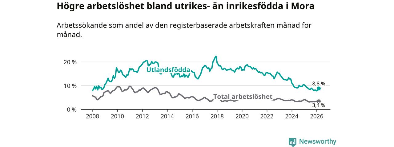 Arbetslösheten bland utlandsfödda var 8,8 procent i Mora under mars månad, motsvarande 100 av 1 136 personer. Det är 0,6 procentenheter färre än vid samma tidpunkt i fjol (−5 om man räknar personer). Därmed har de utlandsföddas arbetslöshet varit lägre än vid samma tidpunkt i fjol i över tre år i sträck. Sedan november 2022 har arbetslösheten bland utlandsfödda minskat från 15,7 till 8,8 procent.