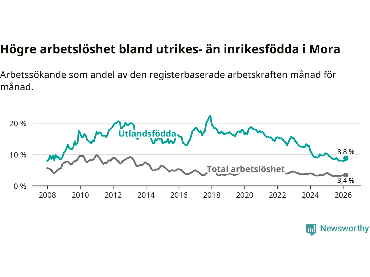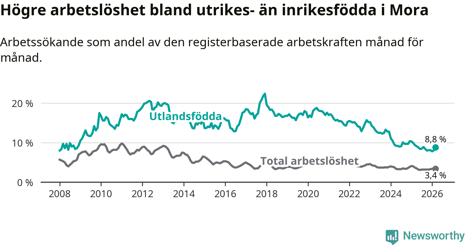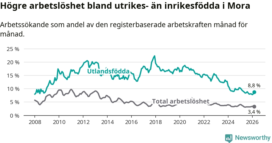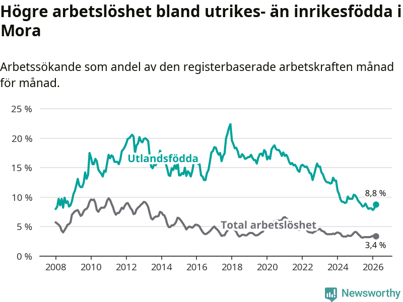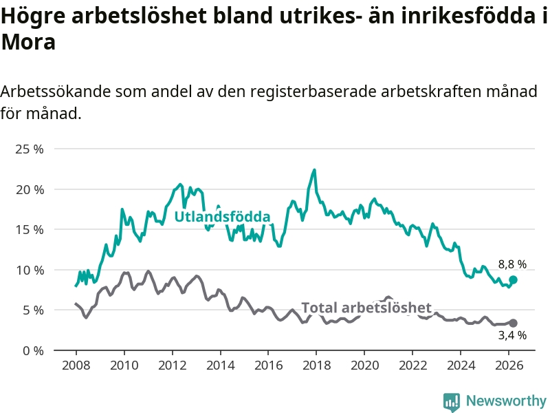 Arbetslösheten bland utlandsfödda var 8,8 procent i Mora under mars månad, motsvarande 100 av 1 136 personer. Det är 0,6 procentenheter färre än vid samma tidpunkt i fjol (−5 om man räknar personer). Därmed har de utlandsföddas arbetslöshet varit lägre än vid samma tidpunkt i fjol i över tre år i sträck. Sedan november 2022 har arbetslösheten bland utlandsfödda minskat från 15,7 till 8,8 procent.