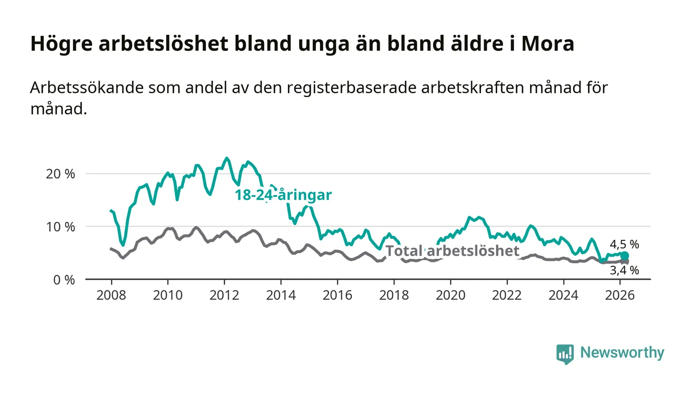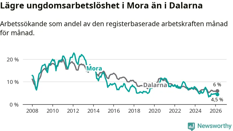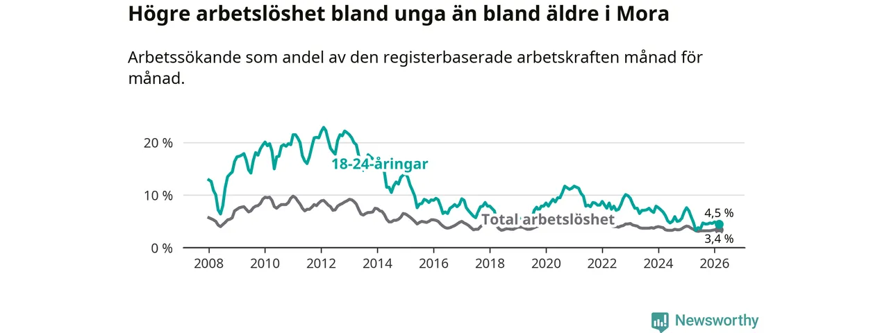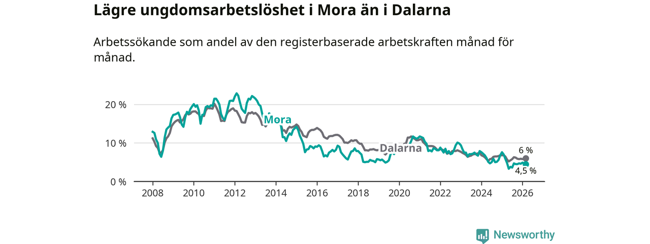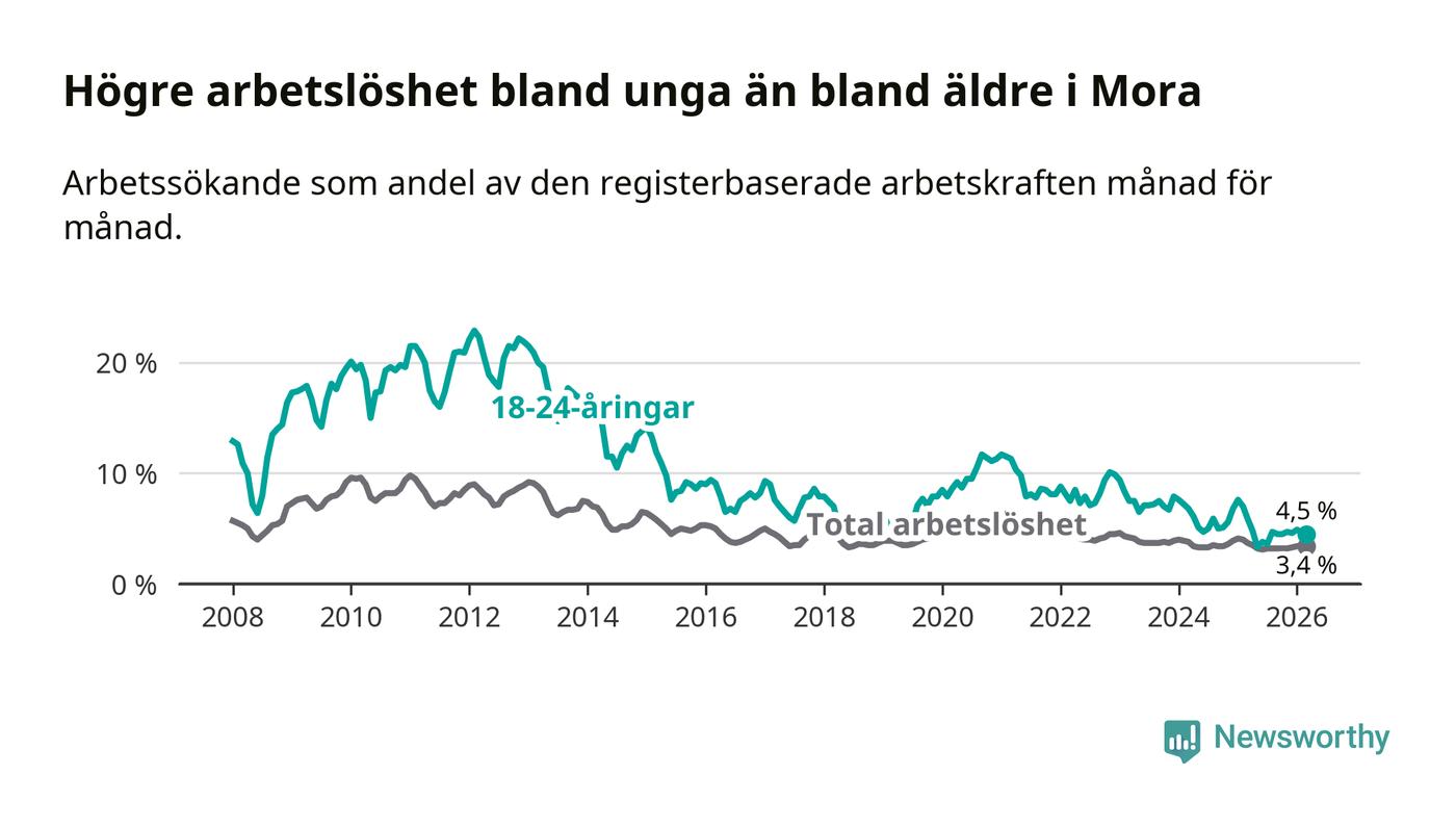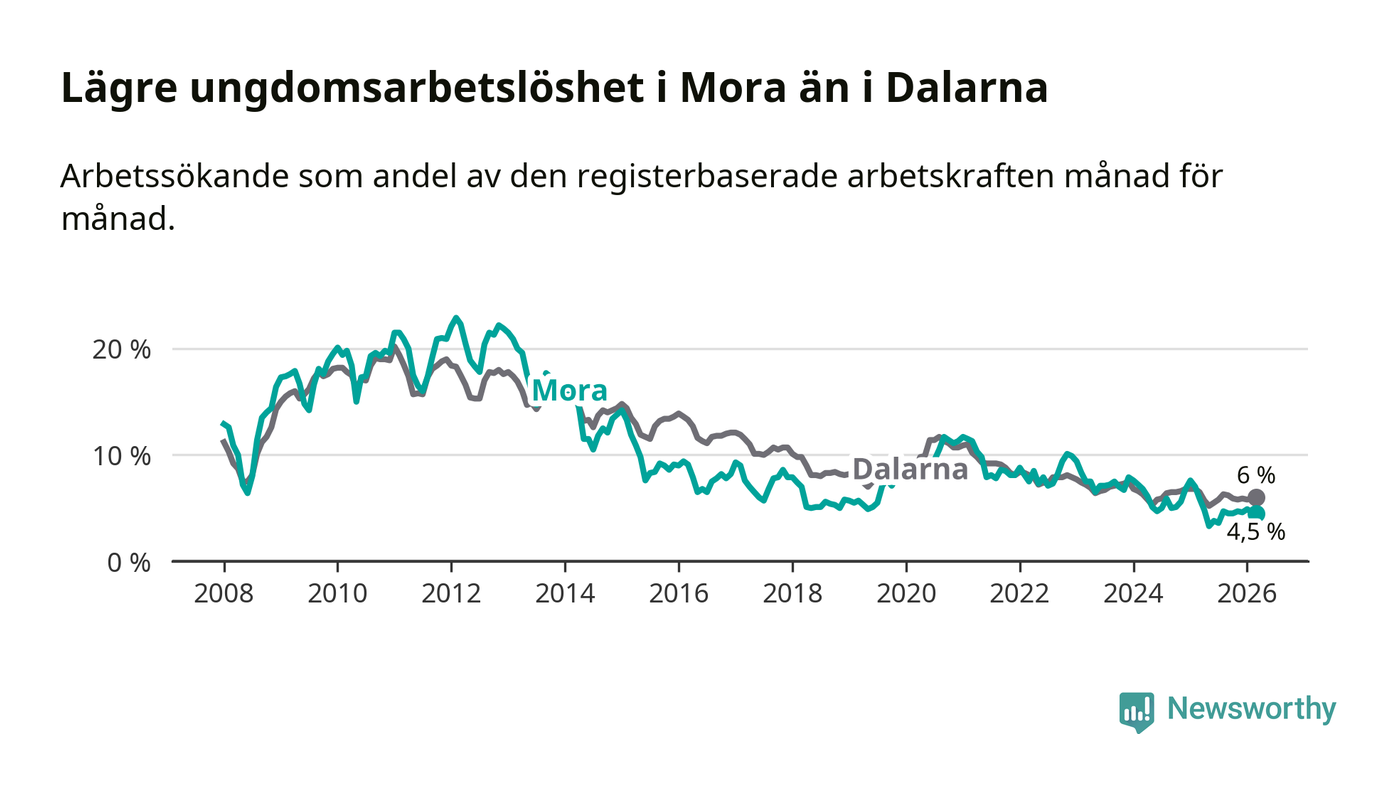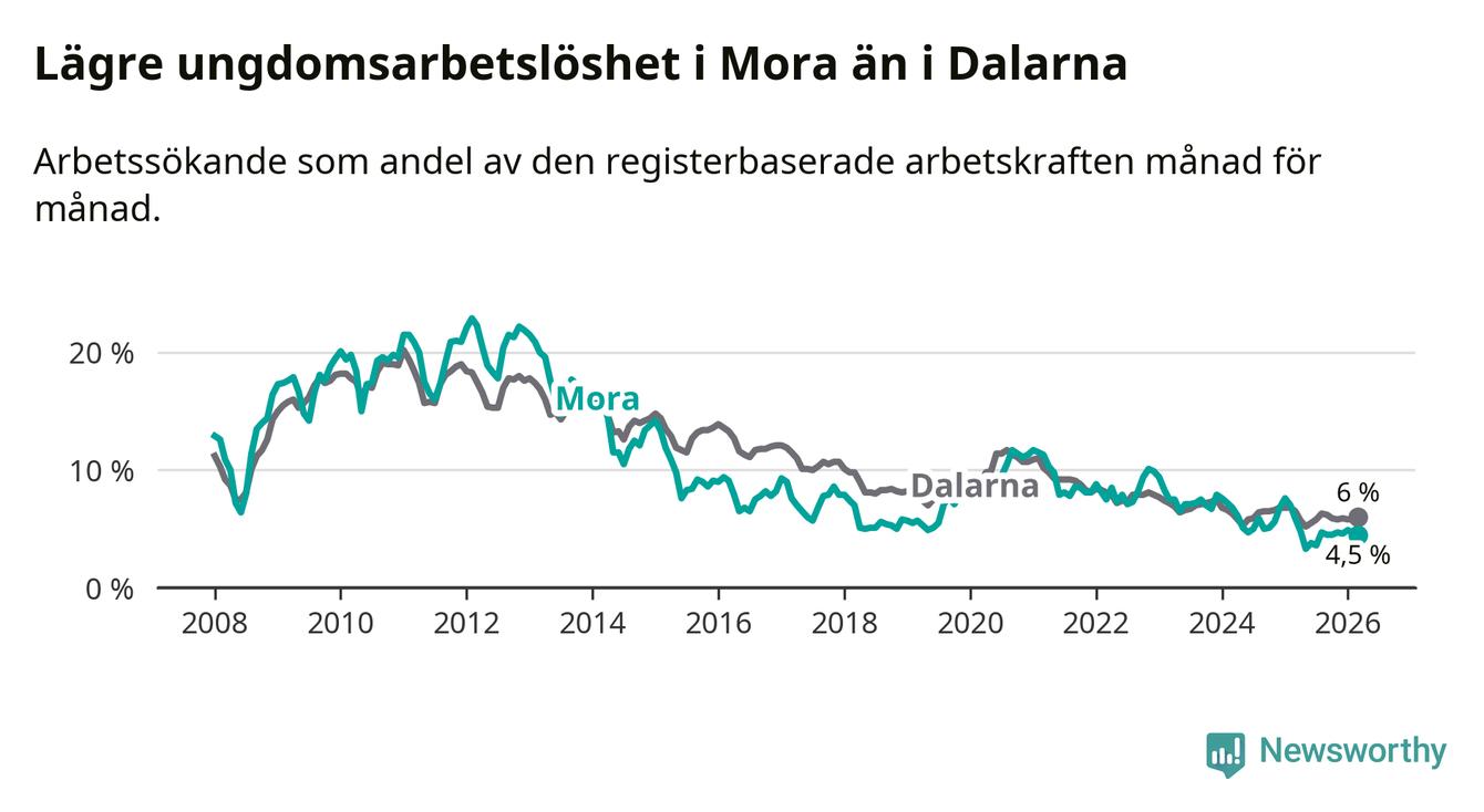 I och med den senaste månadens nedgång har de ungas arbetslöshet i Mora sjunkit 14 månader i följd (ner från 7,6 procent i januari 2025 till 4,5 procent nu).