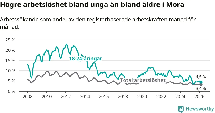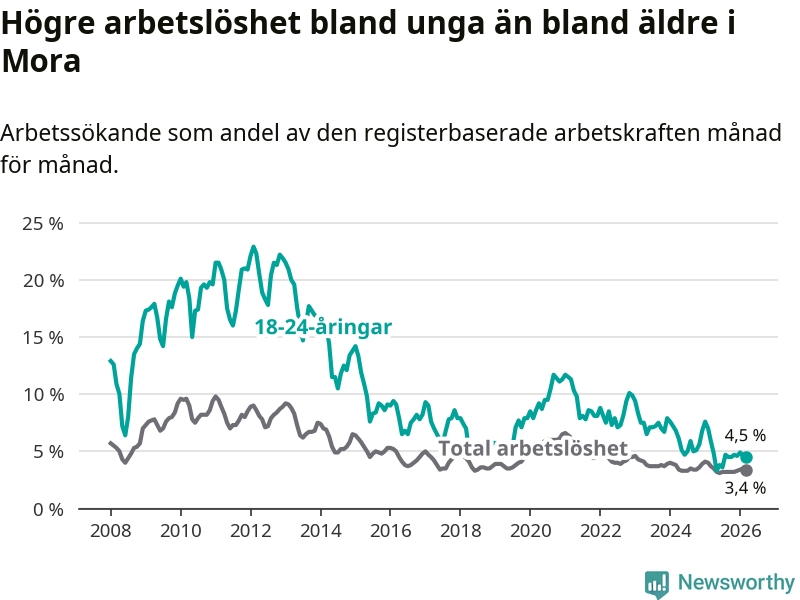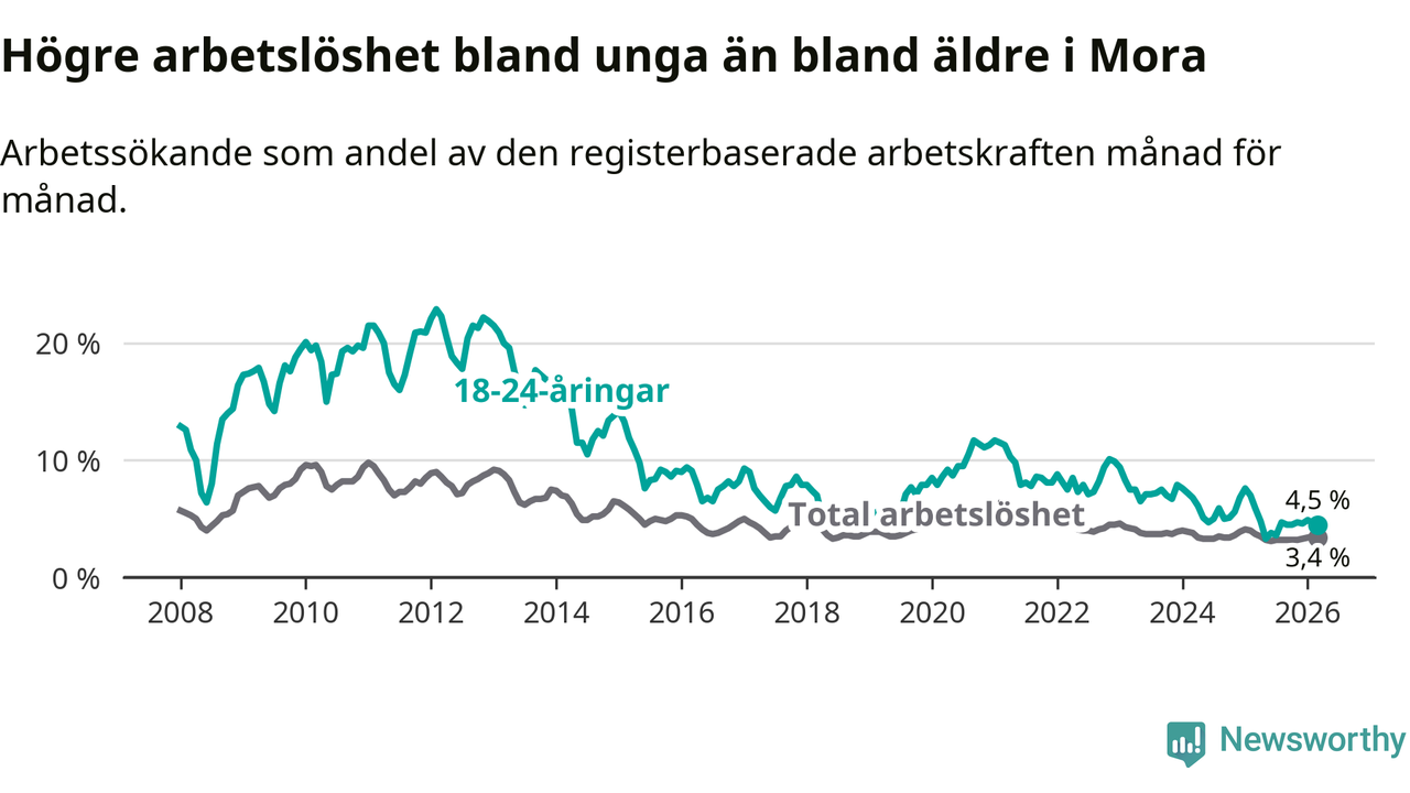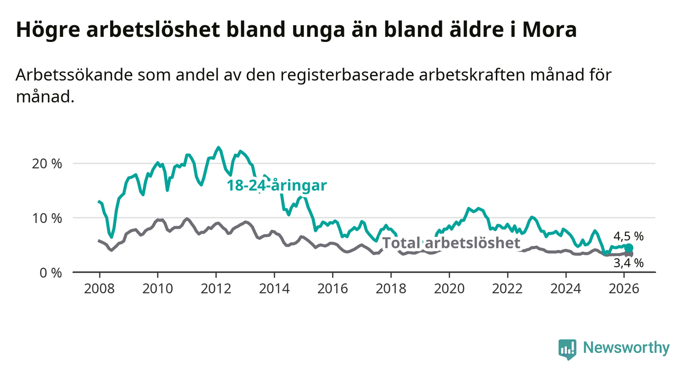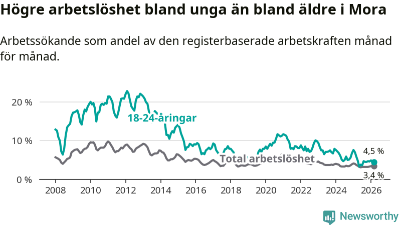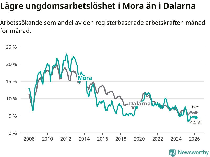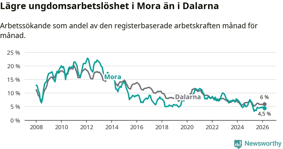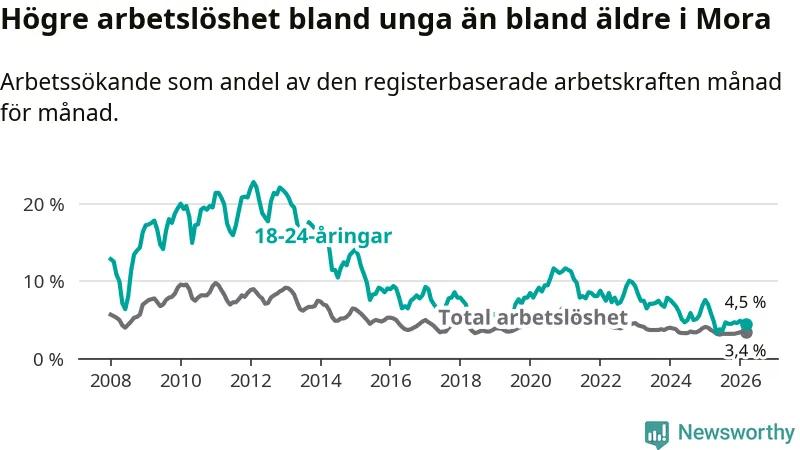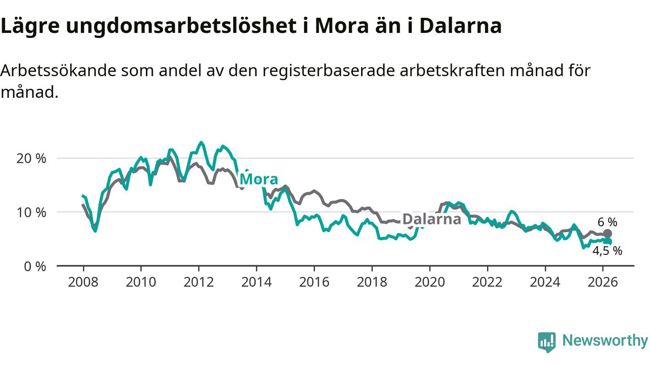 I och med den senaste månadens nedgång har de ungas arbetslöshet i Mora sjunkit 14 månader i följd (ner från 7,6 procent i januari 2025 till 4,5 procent nu).