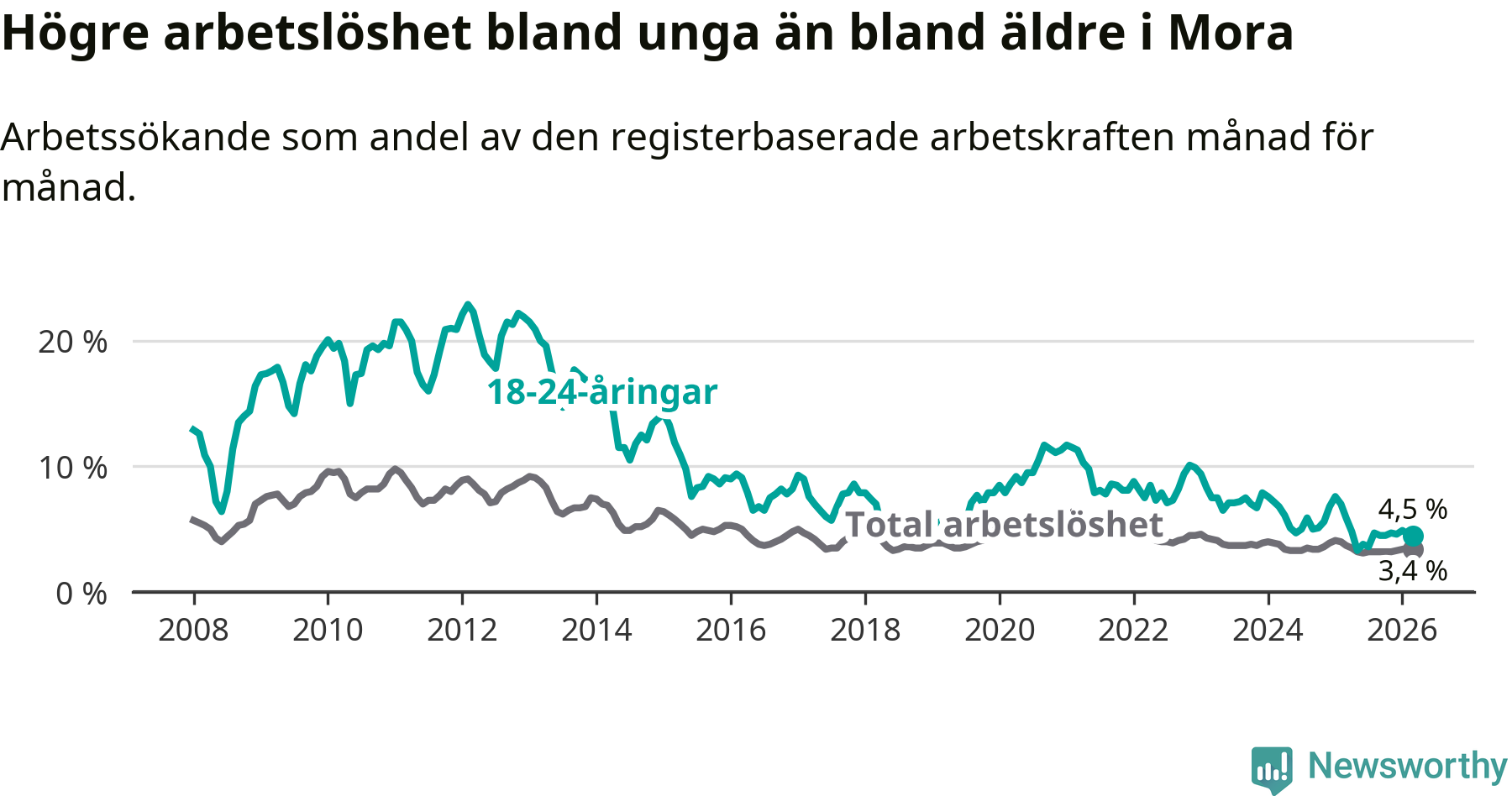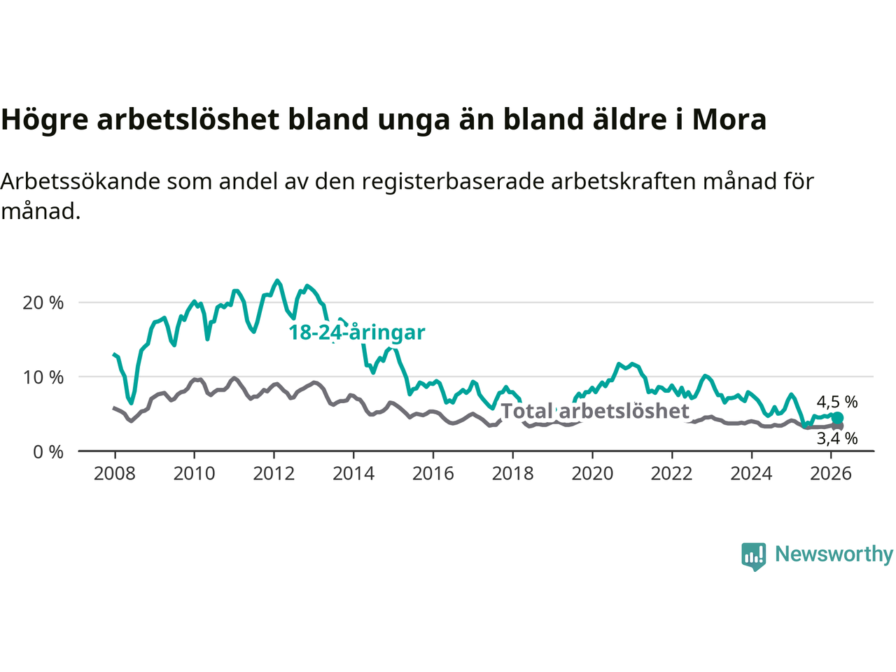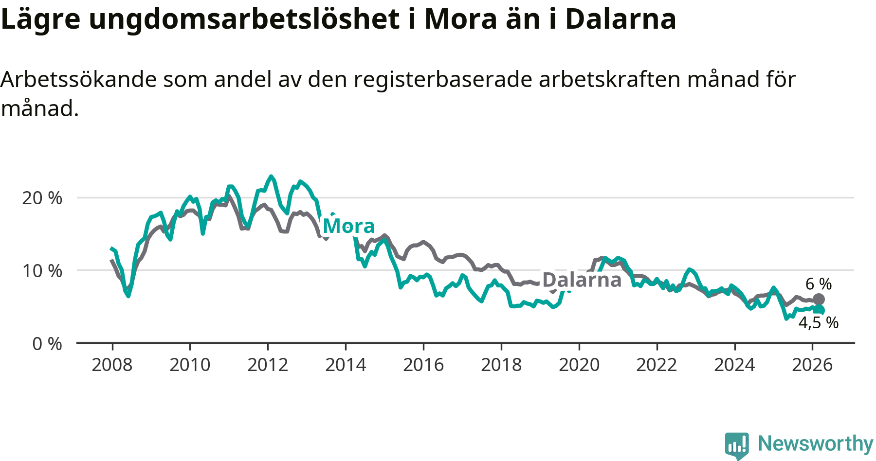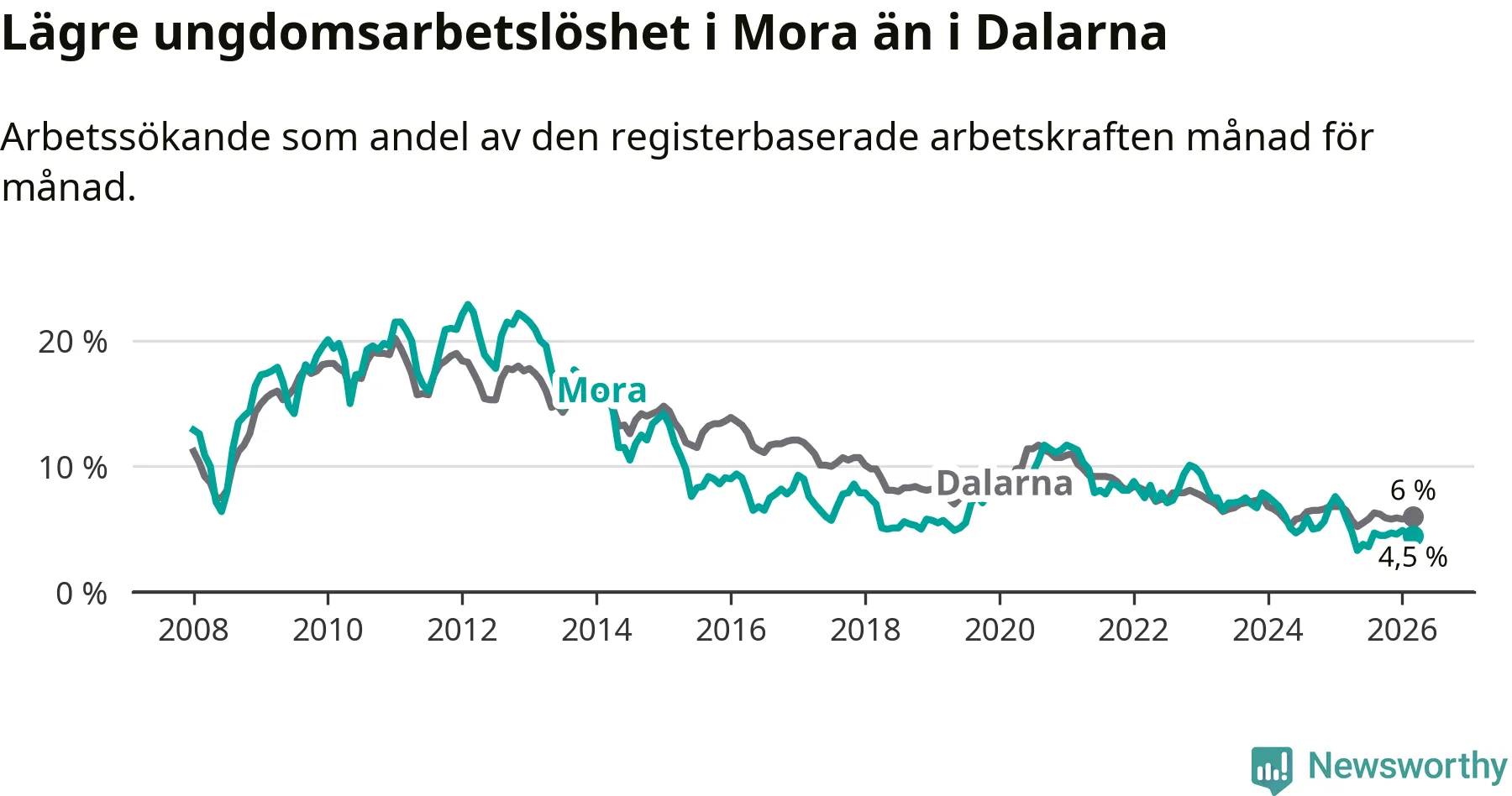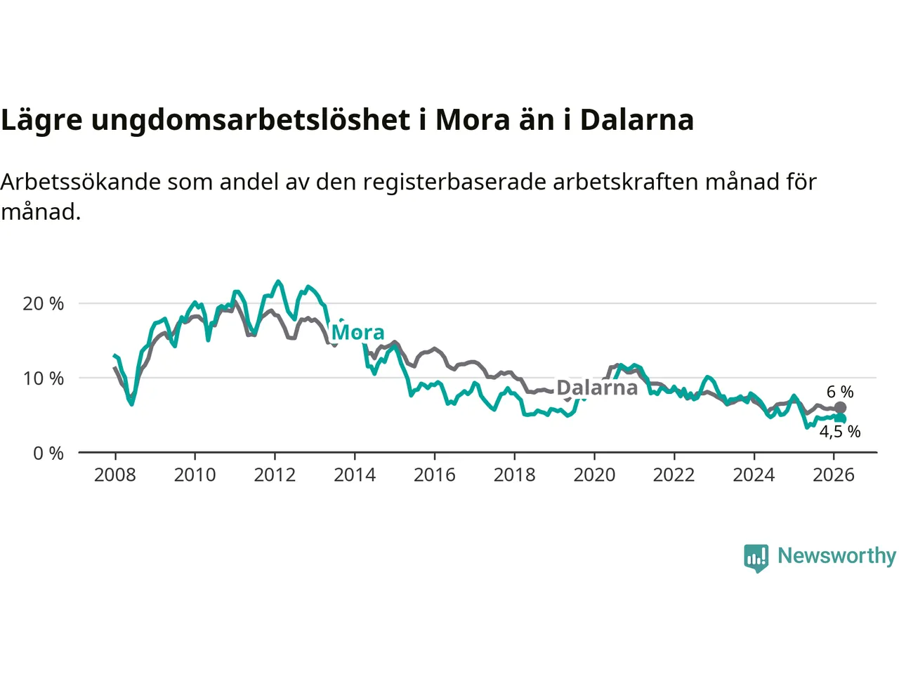 I och med den senaste månadens nedgång har de ungas arbetslöshet i Mora sjunkit 14 månader i följd (ner från 7,6 procent i januari 2025 till 4,5 procent nu).