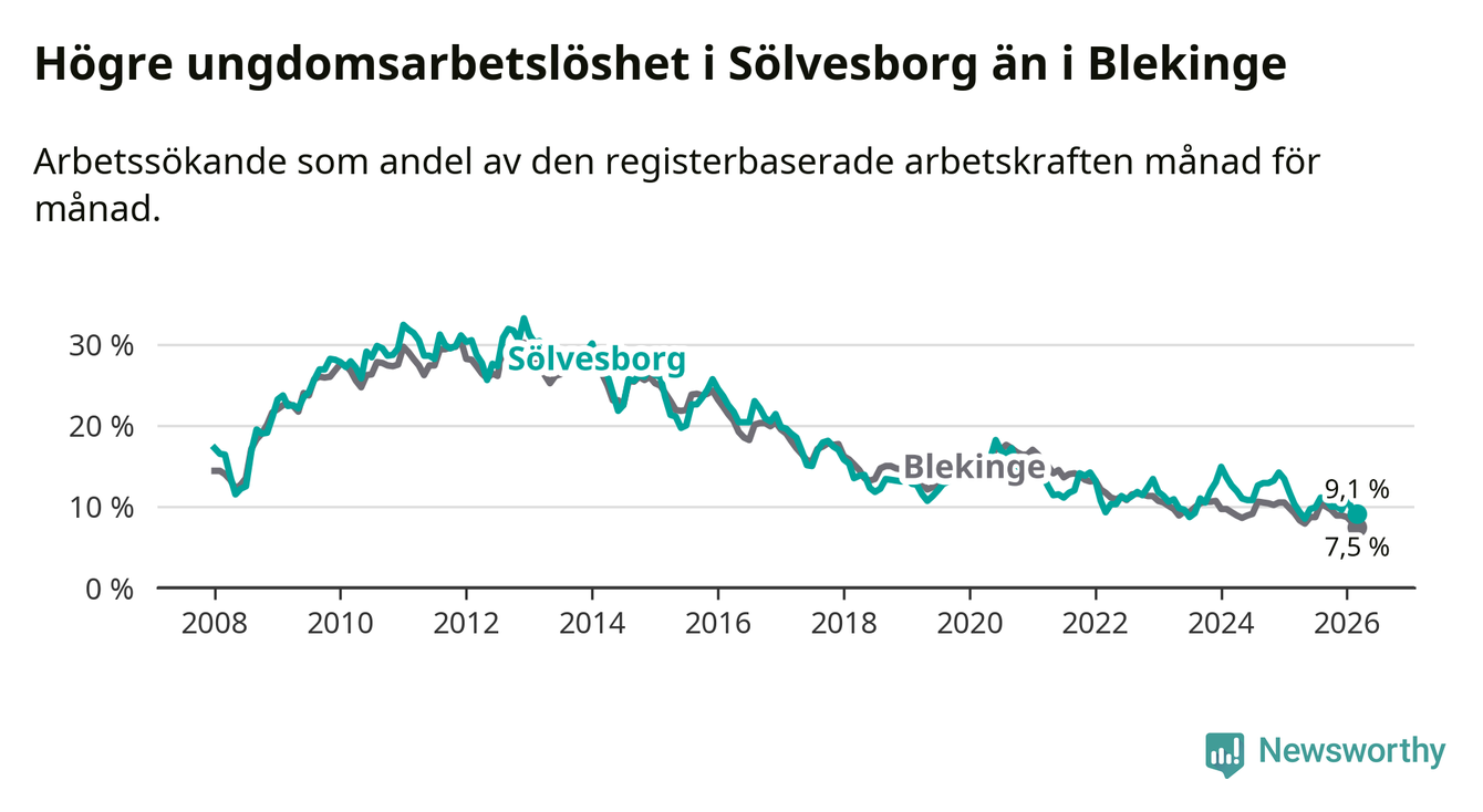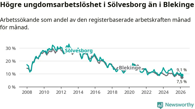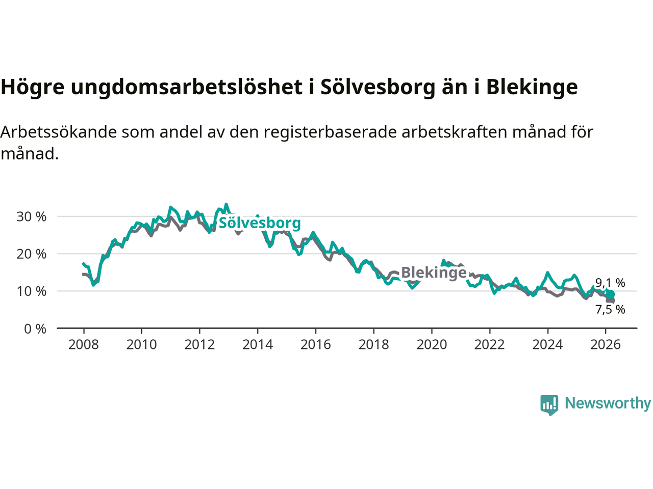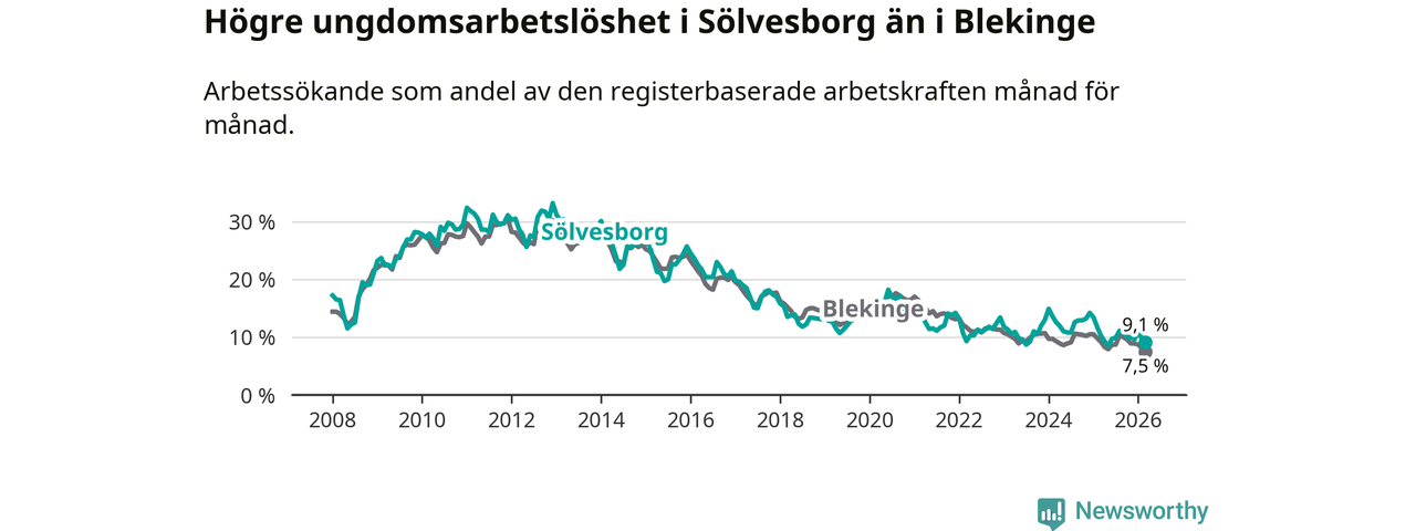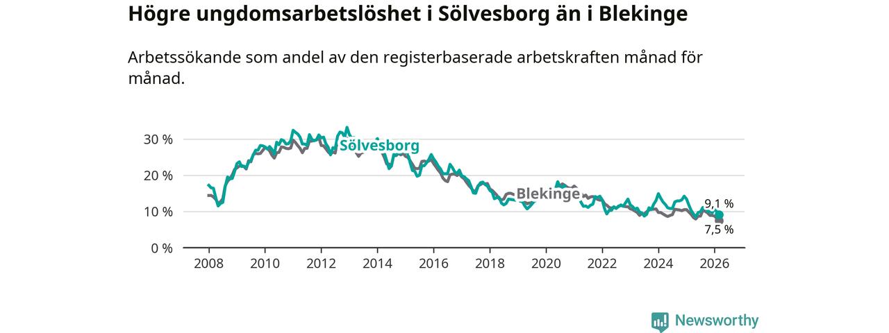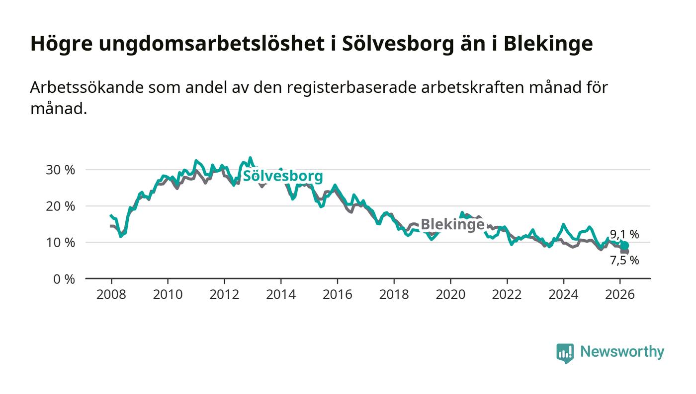 Medan Sölvesborg har lägre total arbetslöshet än Blekinge, ligger ungdomsarbetslösheten 1,6 procentenheter högre i Sölvesborg.