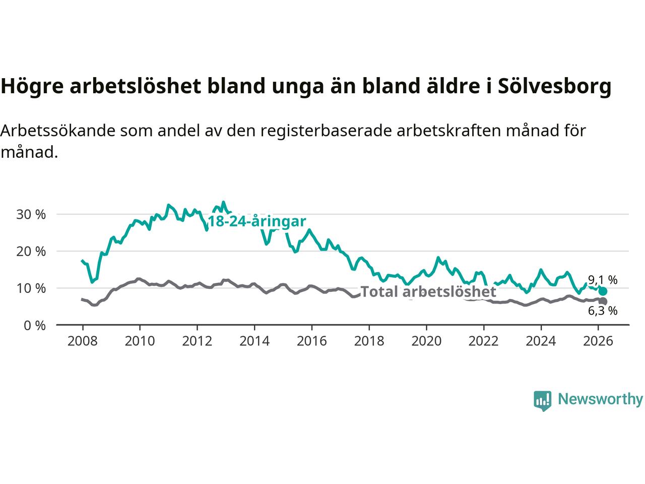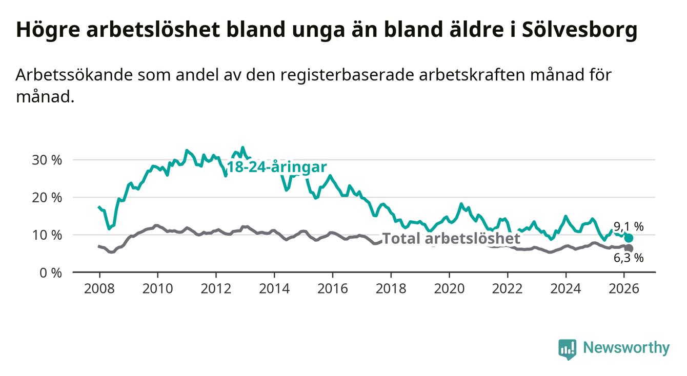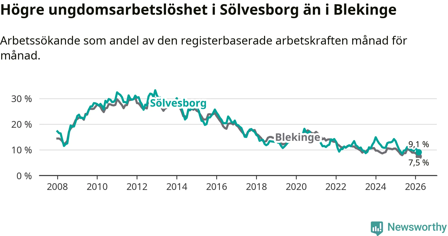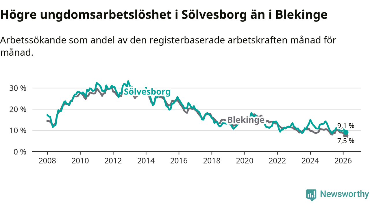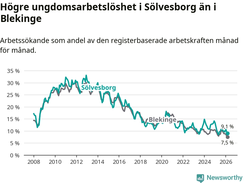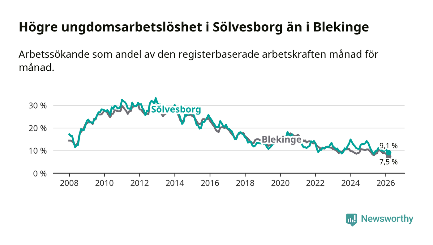 Medan Sölvesborg har lägre total arbetslöshet än Blekinge, ligger ungdomsarbetslösheten 1,6 procentenheter högre i Sölvesborg.
