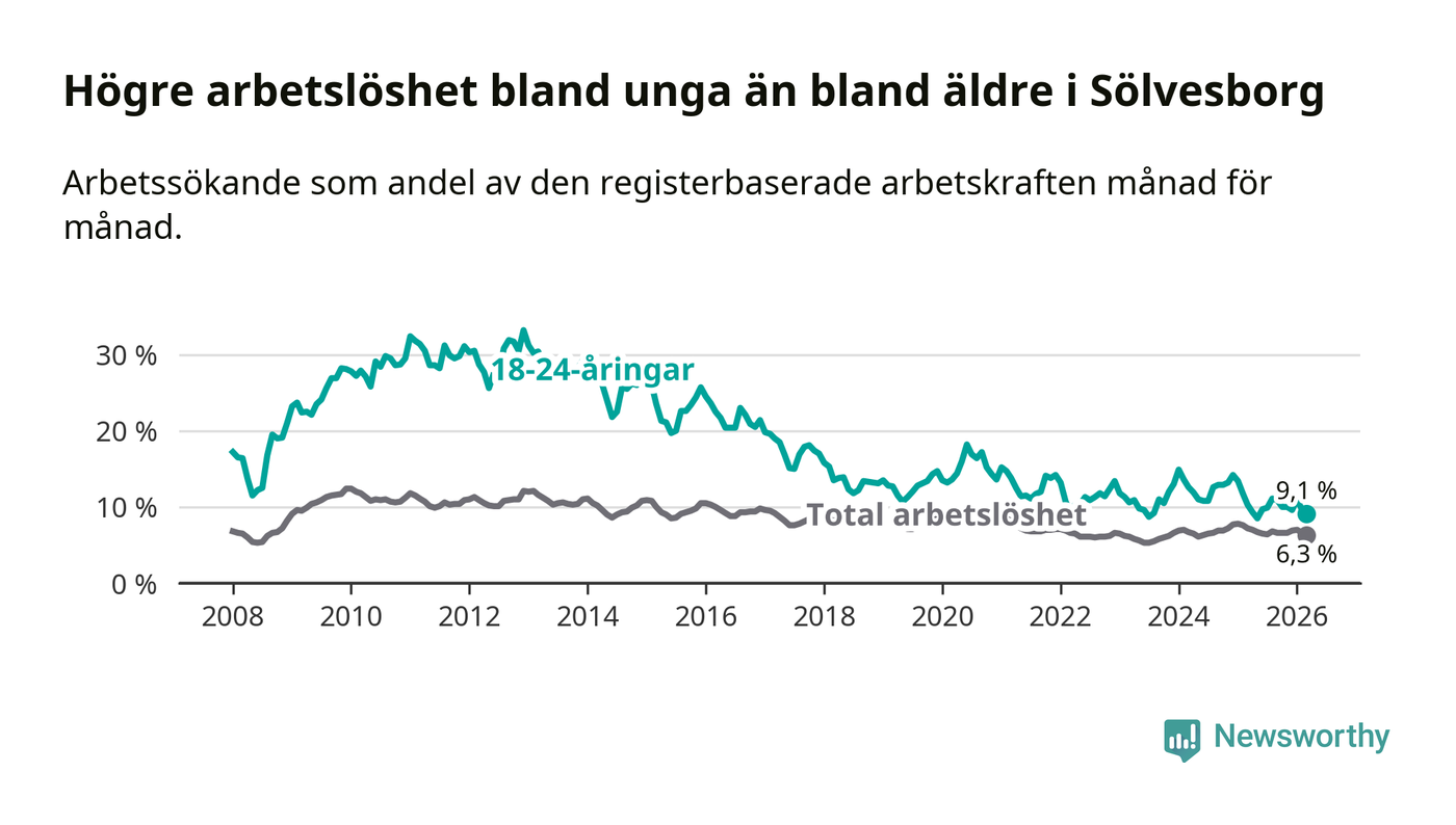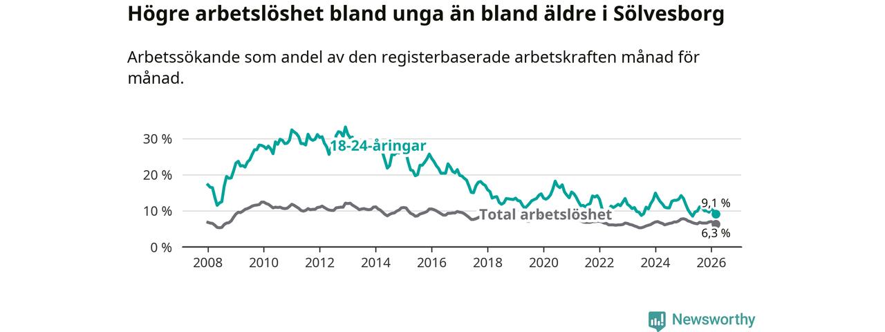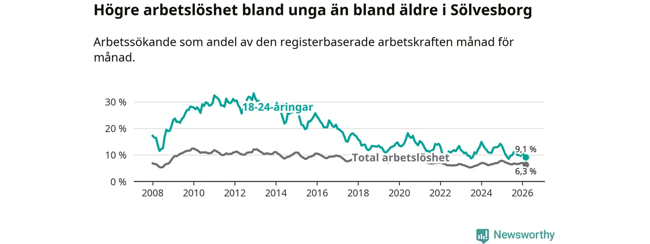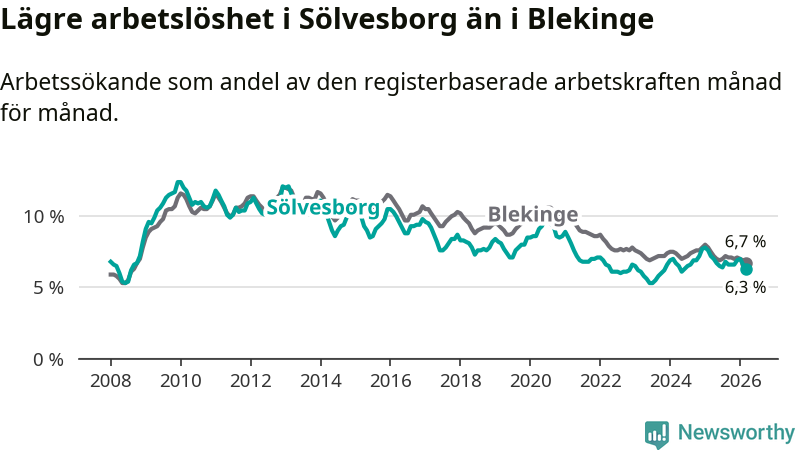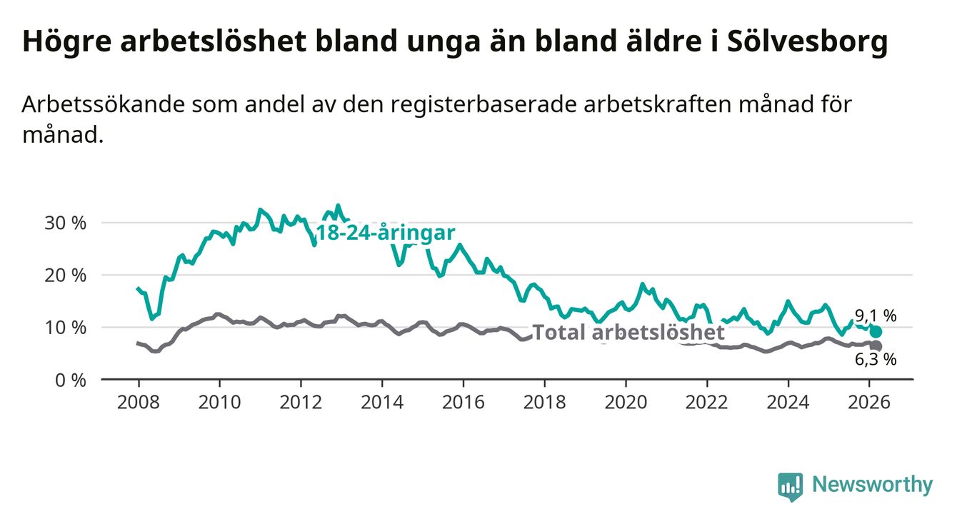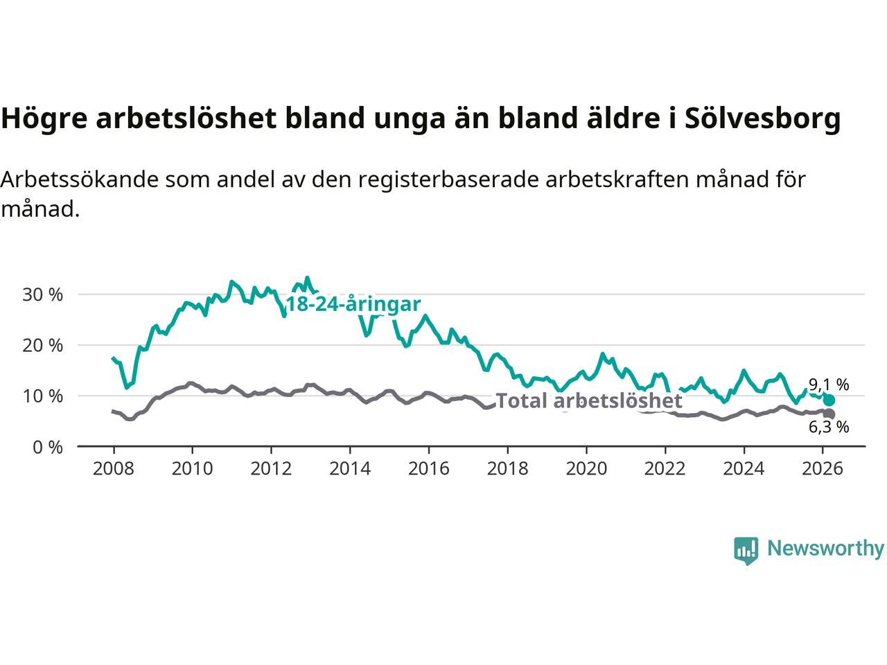 Medan Sölvesborg har lägre total arbetslöshet än Blekinge, ligger ungdomsarbetslösheten 1,6 procentenheter högre i Sölvesborg.