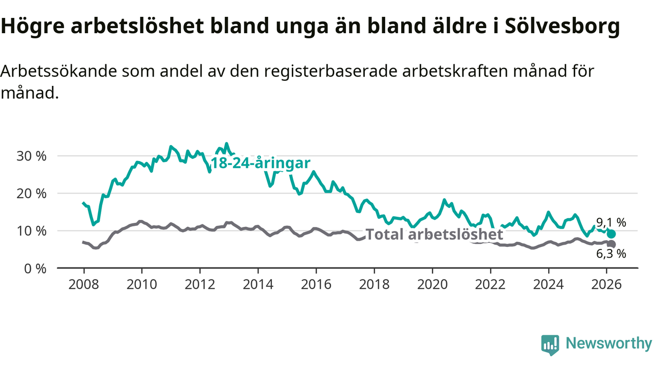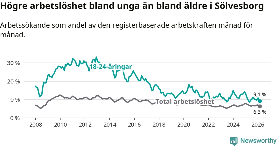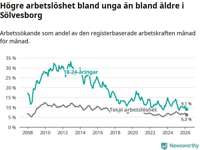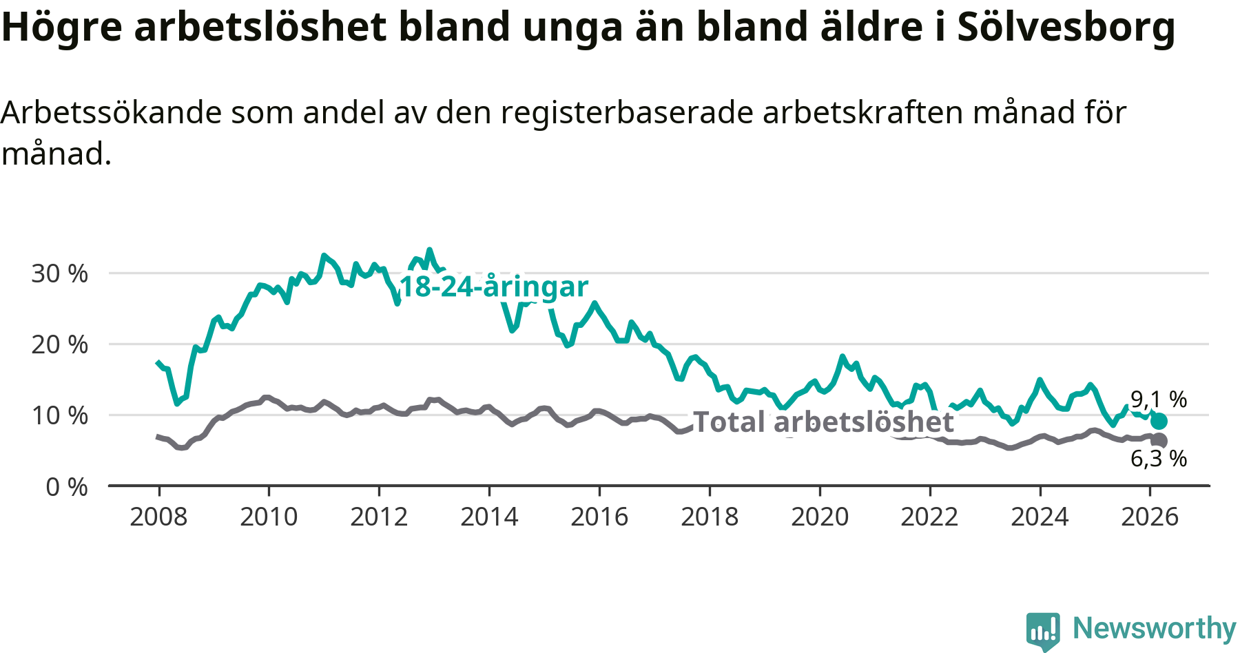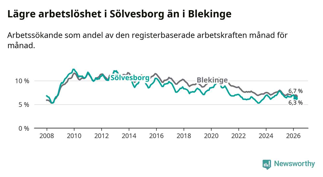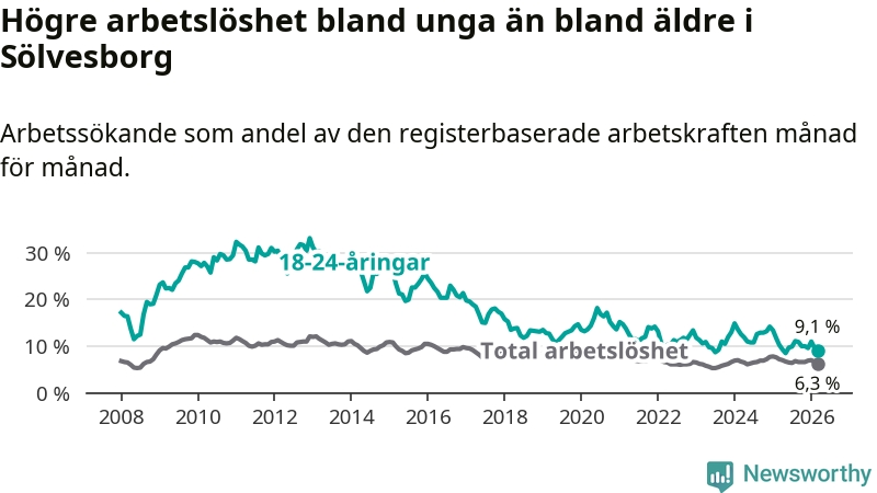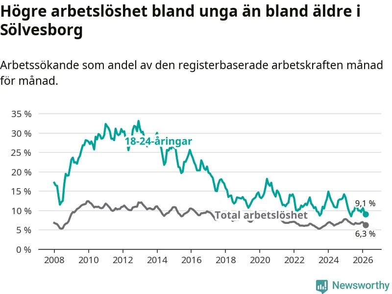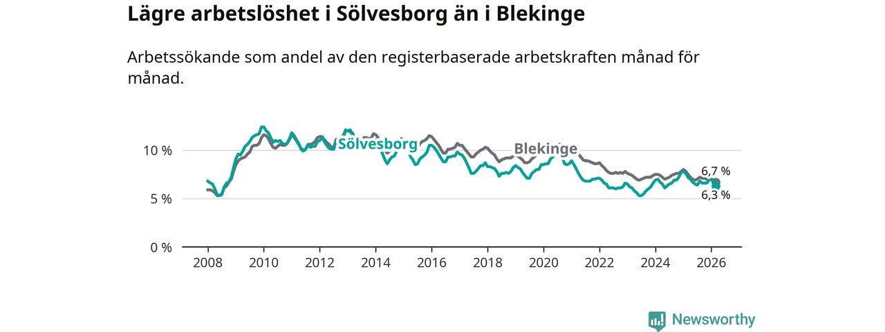 Medan Sölvesborg har lägre total arbetslöshet än Blekinge, ligger ungdomsarbetslösheten 1,6 procentenheter högre i Sölvesborg.