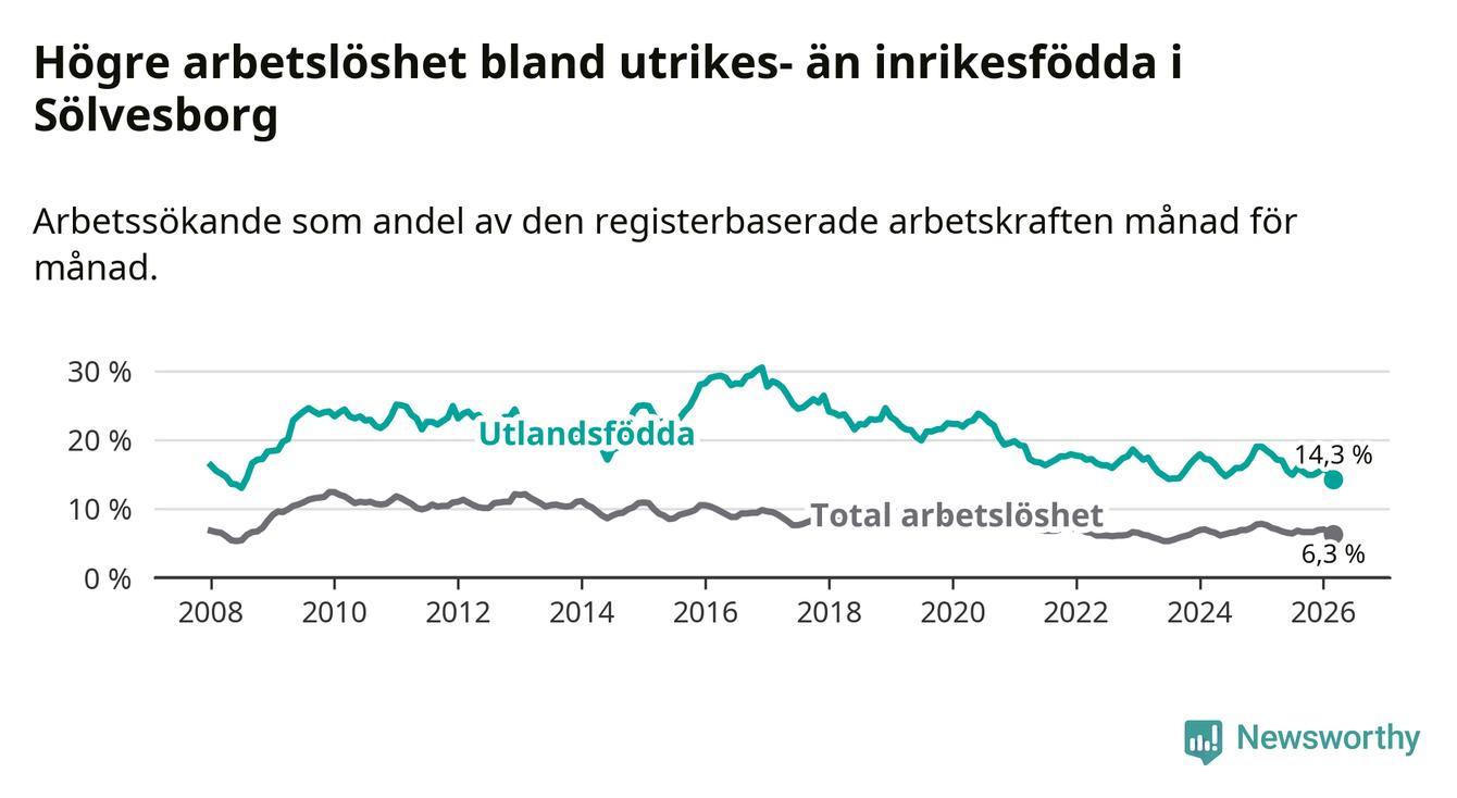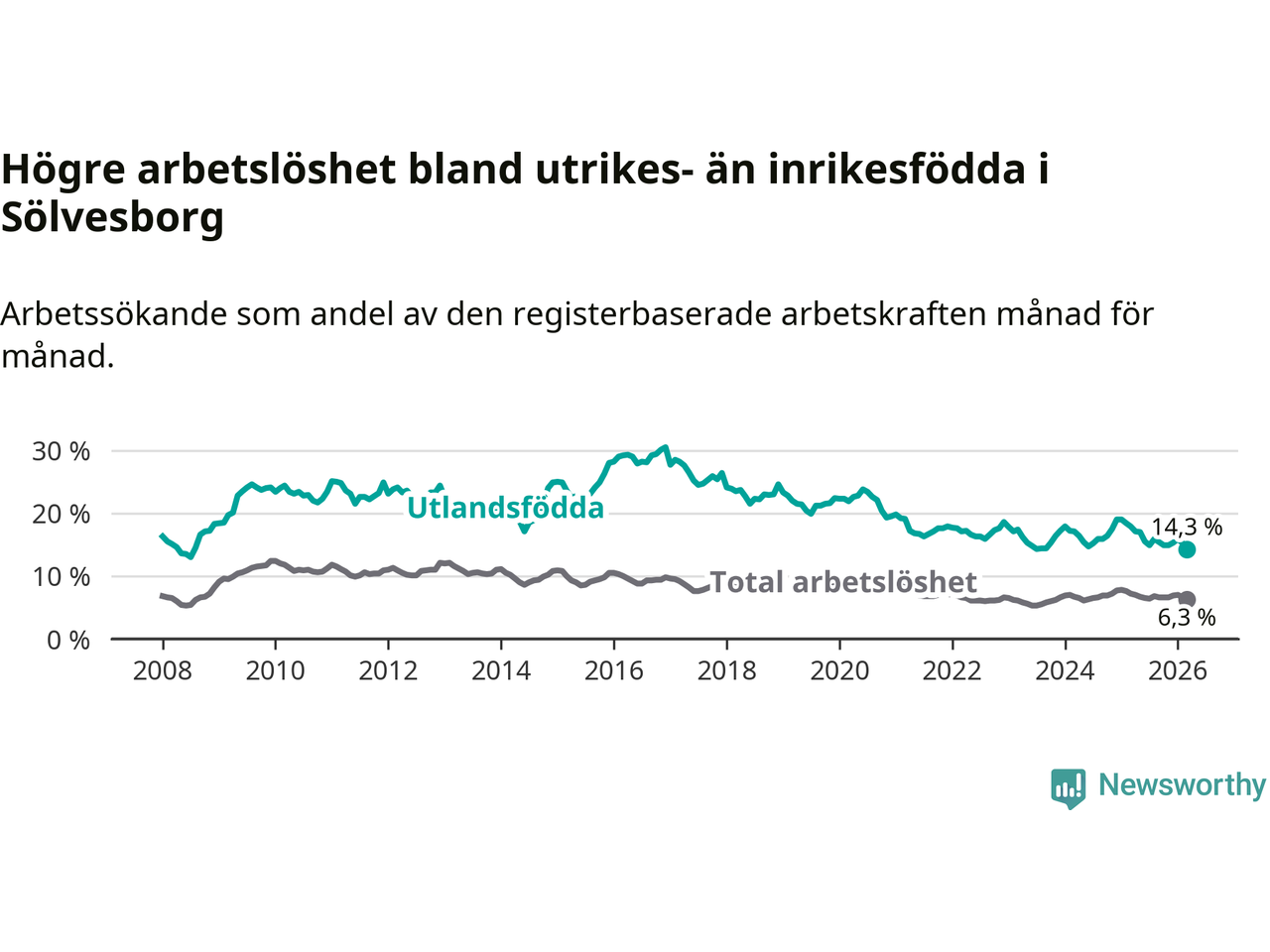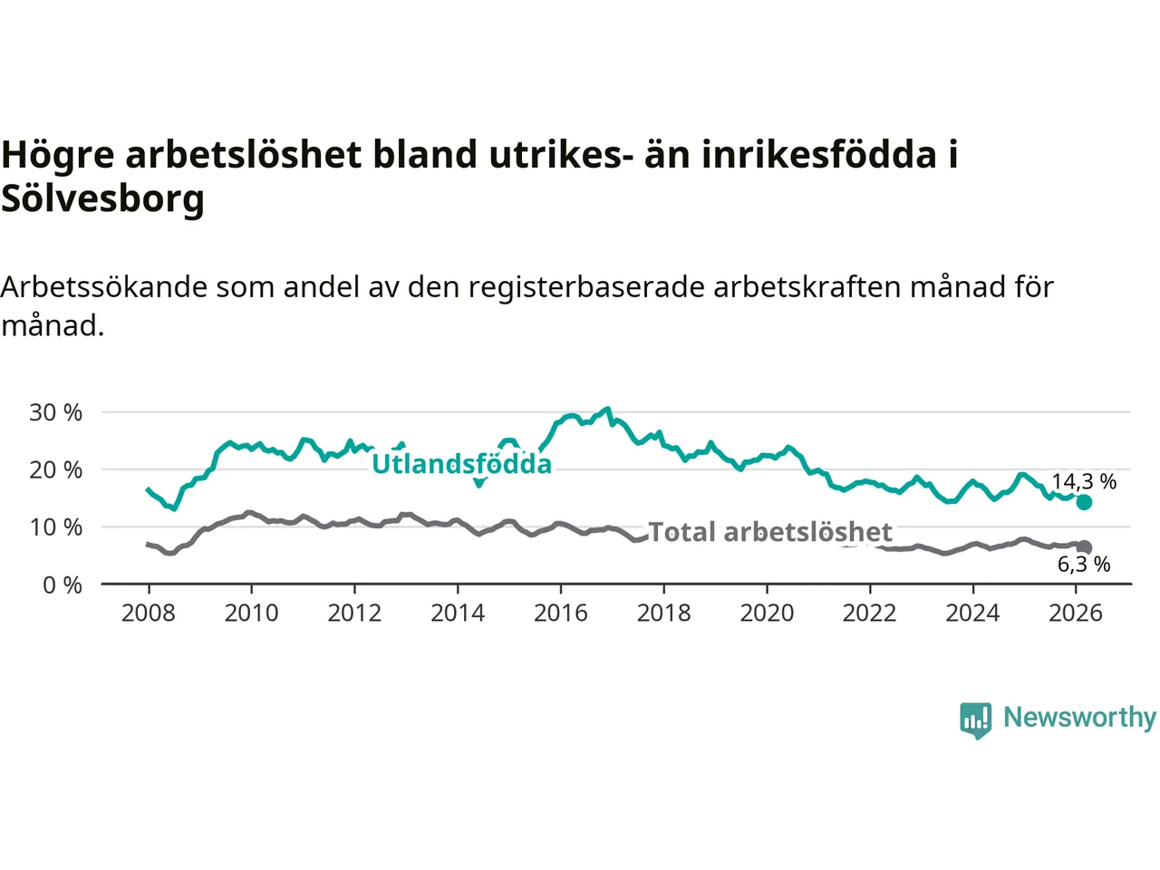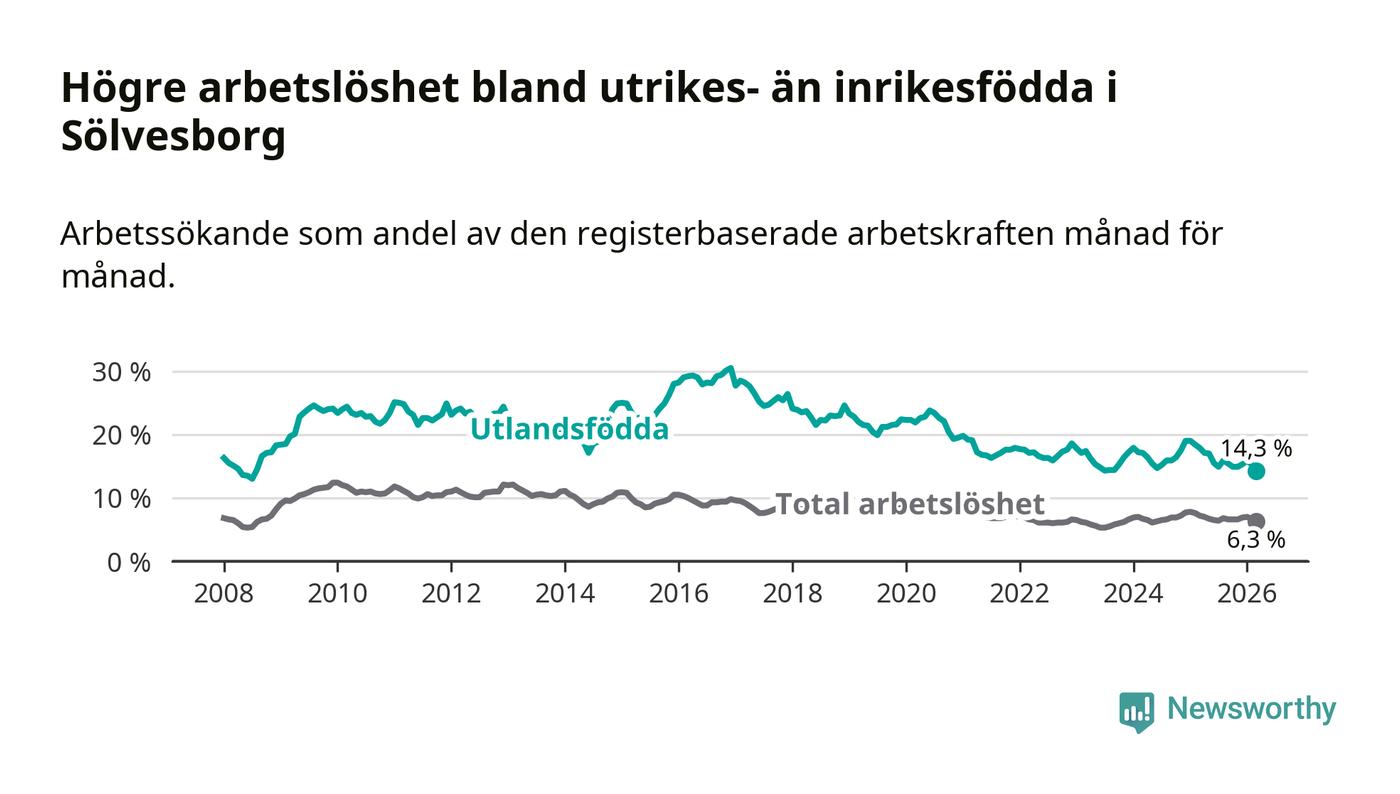 Arbetslösheten bland utlandsfödda var 14,3 procent i Sölvesborg under mars månad, motsvarande 166 av 1 161 personer. Det är 3,6 procentenheter färre än vid samma tidpunkt i fjol (−41 om man räknar personer). Därmed är de utlandsföddas arbetslöshet lägre än vid samma tidpunkt i fjol för sjunde månaden i följd. Sedan augusti 2025 har arbetslösheten bland utlandsfödda minskat från 15,9 till 14,3 procent.