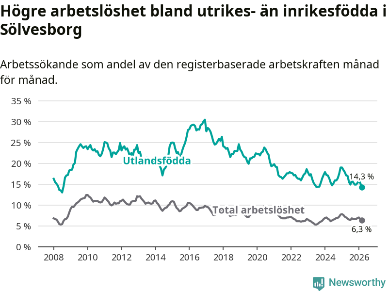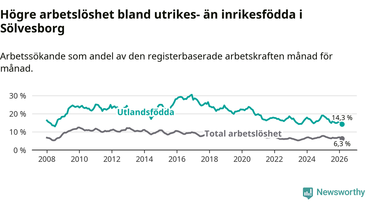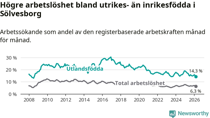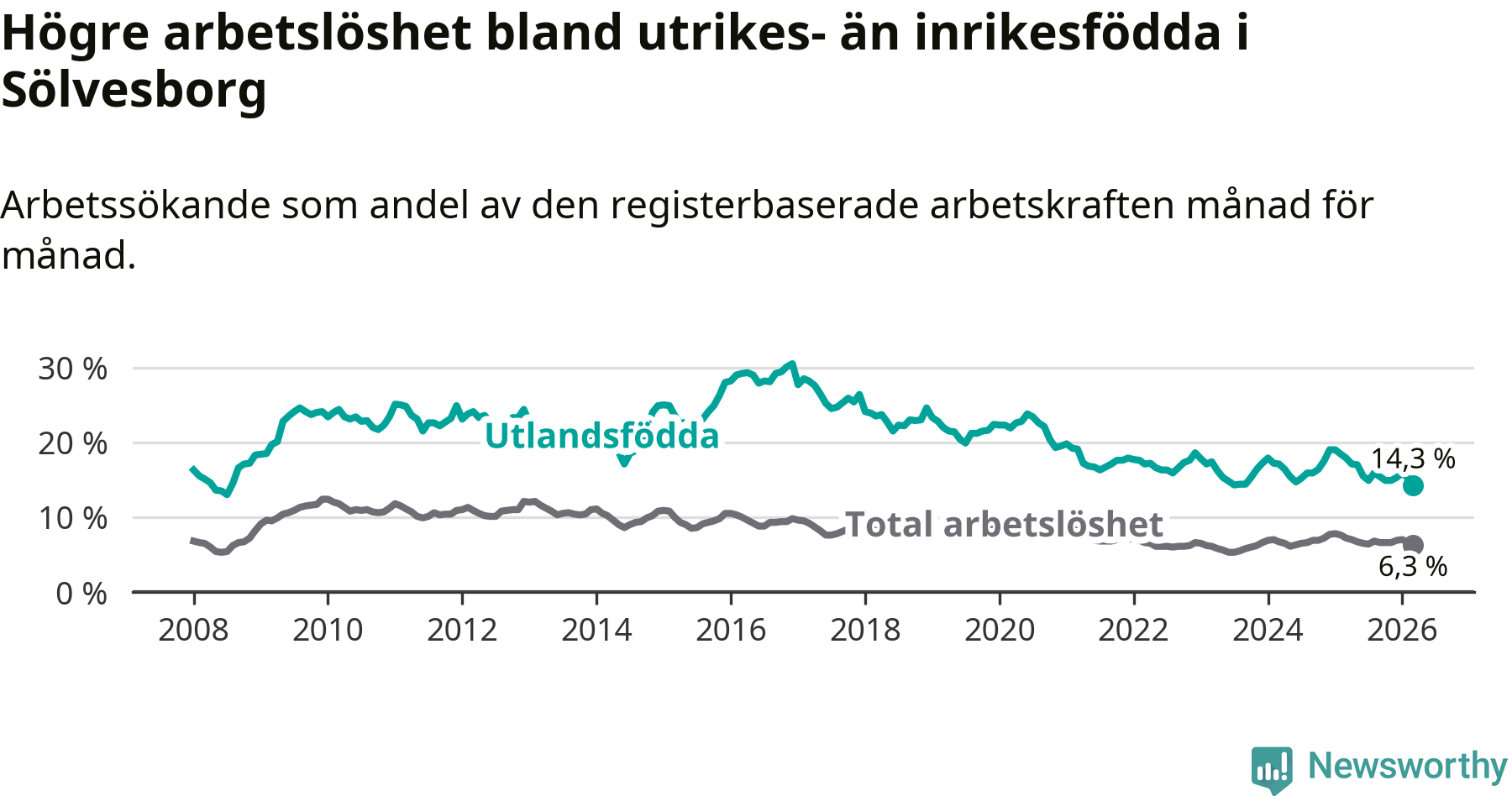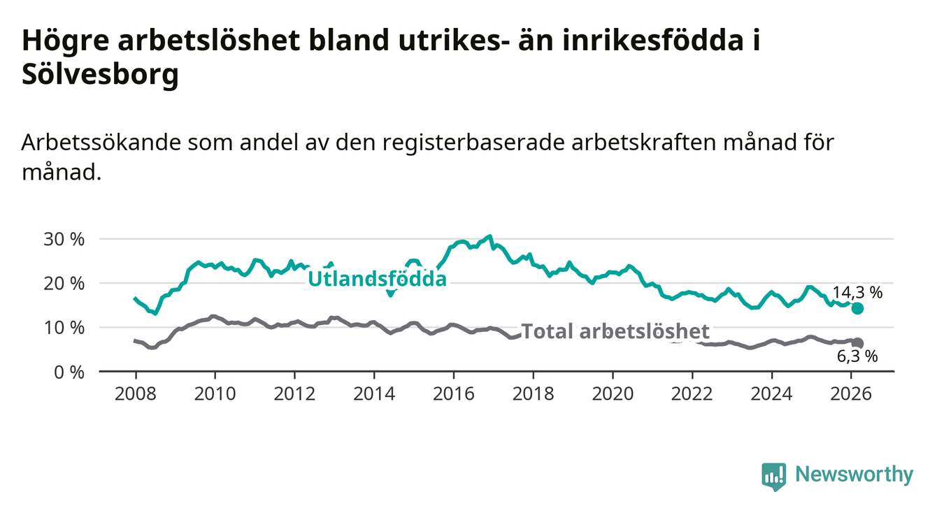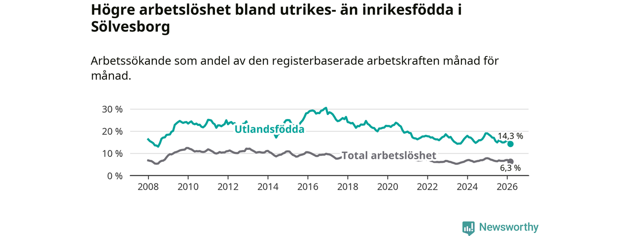 Arbetslösheten bland utlandsfödda var 14,3 procent i Sölvesborg under mars månad, motsvarande 166 av 1 161 personer. Det är 3,6 procentenheter färre än vid samma tidpunkt i fjol (−41 om man räknar personer). Därmed är de utlandsföddas arbetslöshet lägre än vid samma tidpunkt i fjol för sjunde månaden i följd. Sedan augusti 2025 har arbetslösheten bland utlandsfödda minskat från 15,9 till 14,3 procent.