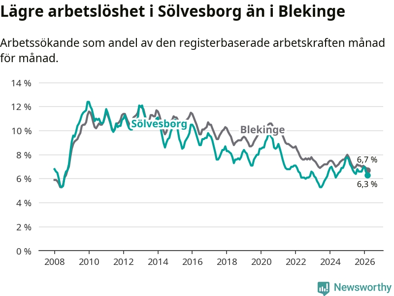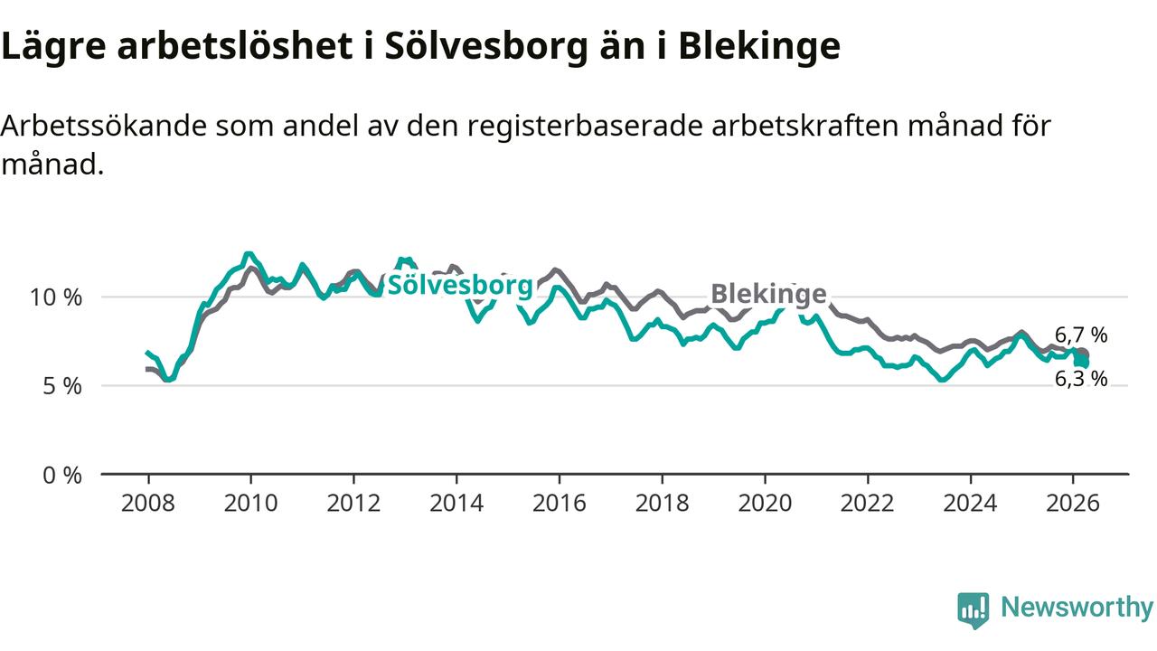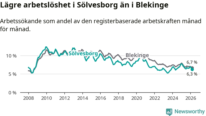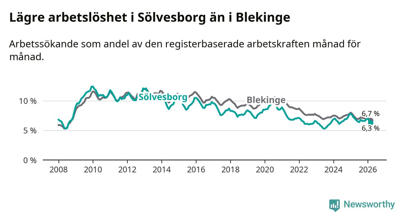Sölvesborg hade redan tidigare lägre arbetslöshet än snittet i hela Blekinge län och nu växer klyftan (6,3 procent i kommunen, jämfört med 6,7 procent i hela länet). Karlskrona har den lägsta arbetslösheten i länet (5,1 procent), medan Ronneby har den högsta (9,3 procent). För att Sölvesborg skulle komma ner i samma arbetslöshetsnivå som Karlskrona skulle 100 personer behöva sysselsättas.
