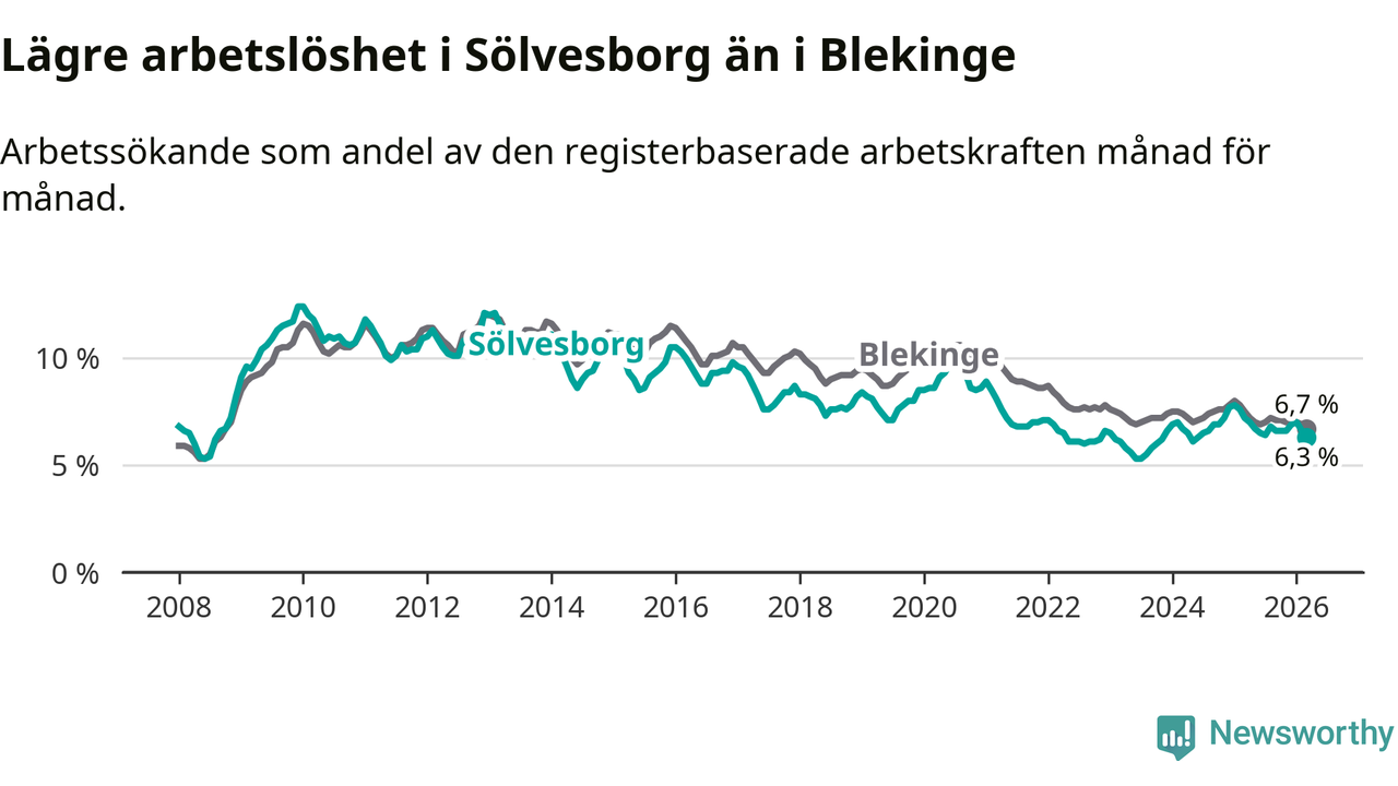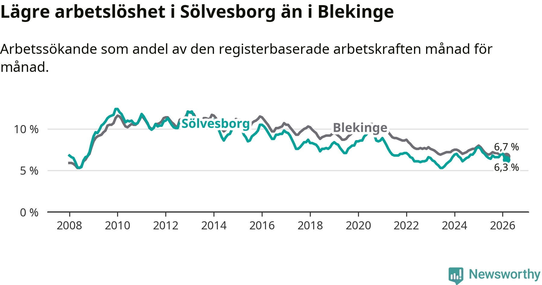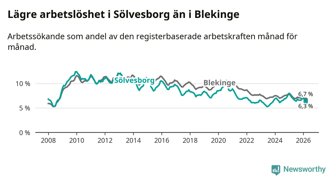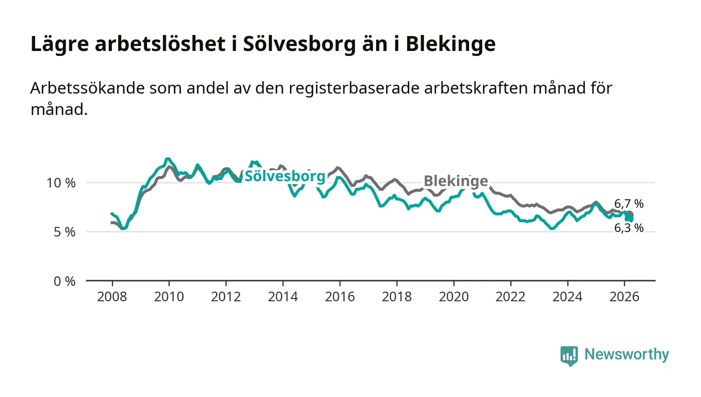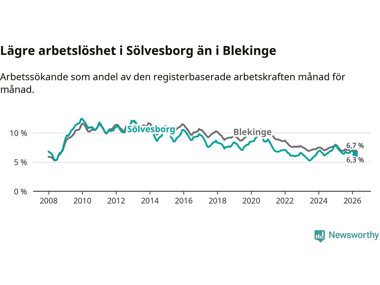 Under mars månad rapporterade Sölvesborgs kommun en total arbetslöshet på 6,3 procent. Det är en minskning jämfört med samma tidpunkt i fjol (−0,9 procentenheter). Även i Blekinge län sjunker arbetslösheten .