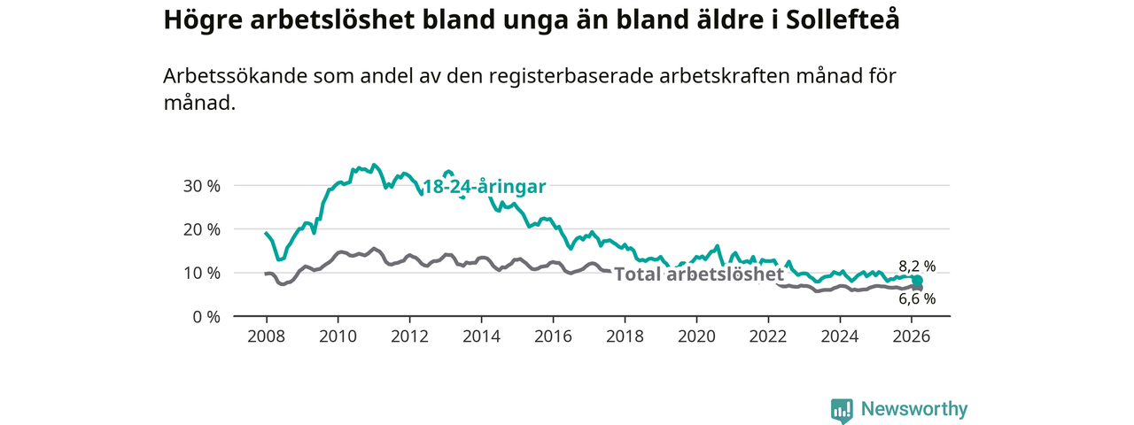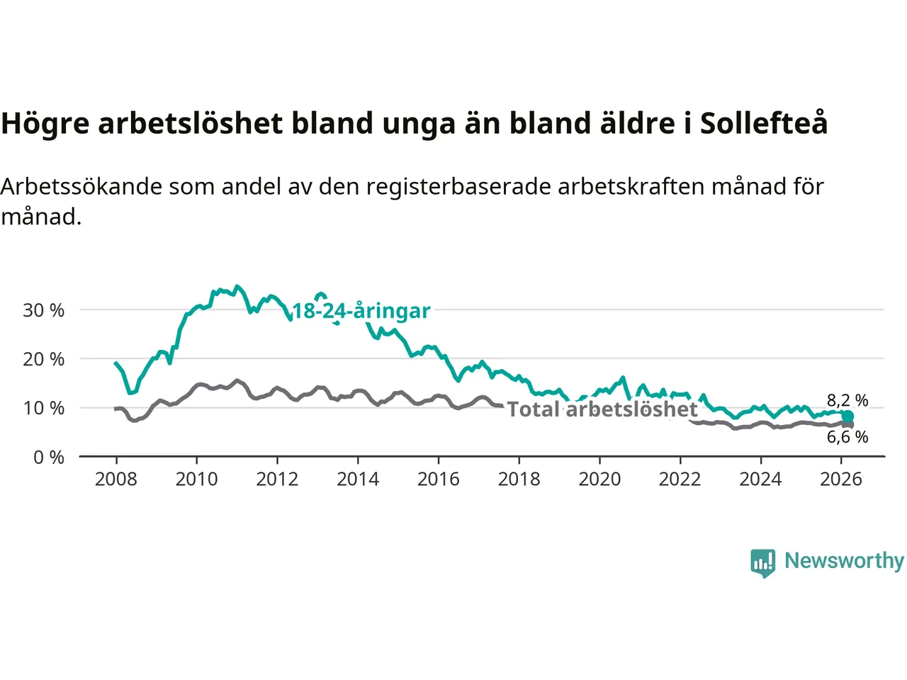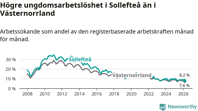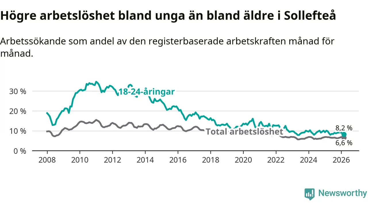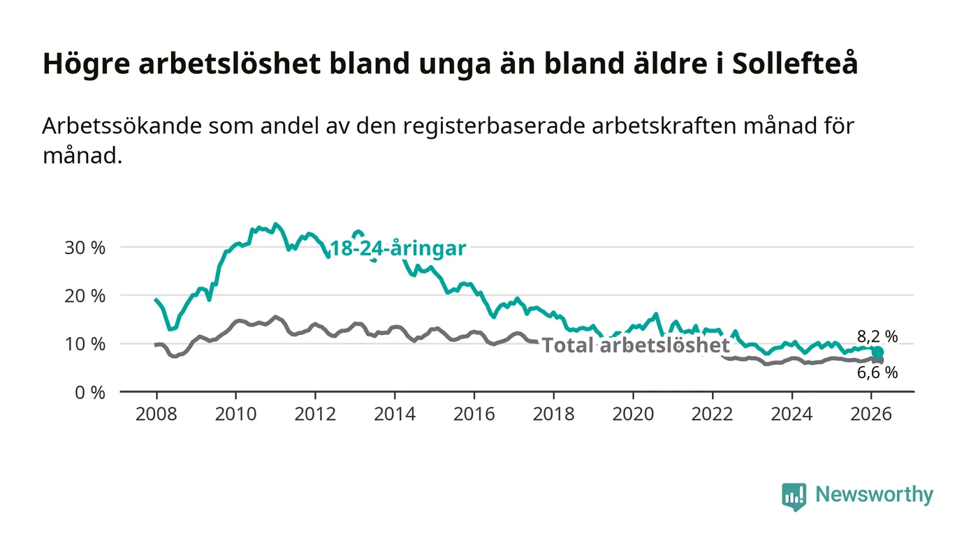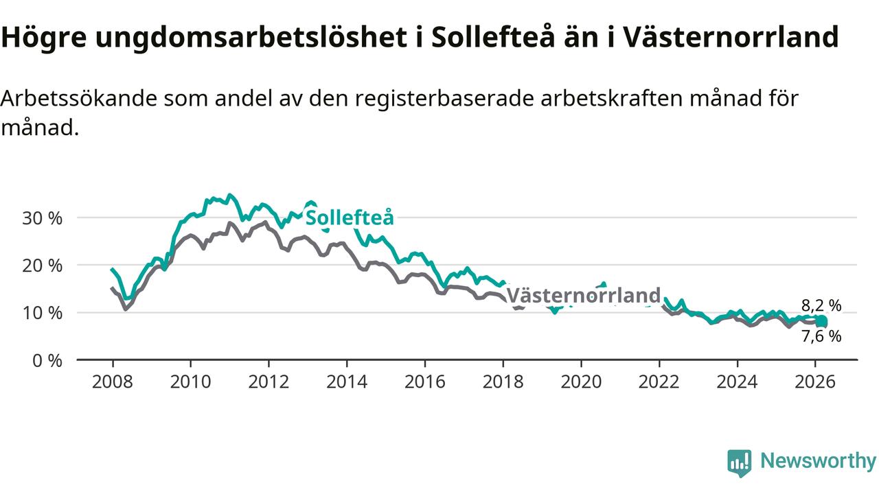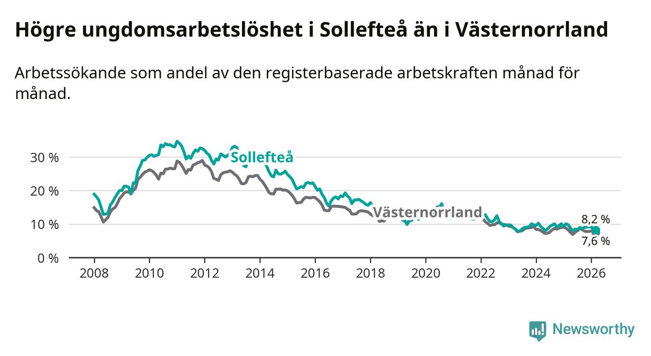 I och med den senaste månadens nedgång har de ungas arbetslöshet i Sollefteå sjunkit tio månader i följd (ner från 8,0 procent i maj 2025 till 8,2 procent nu).