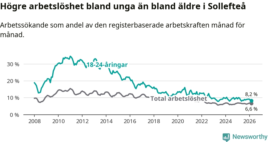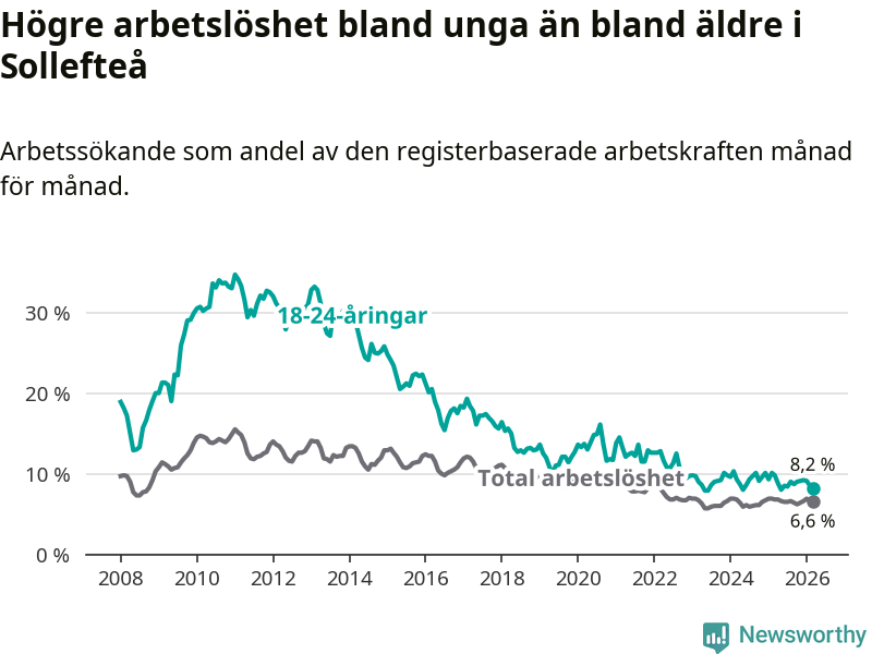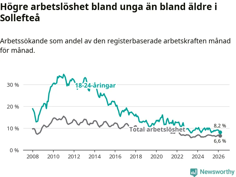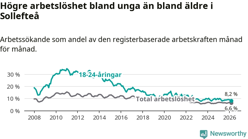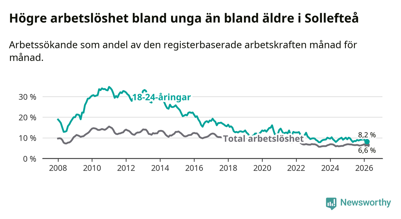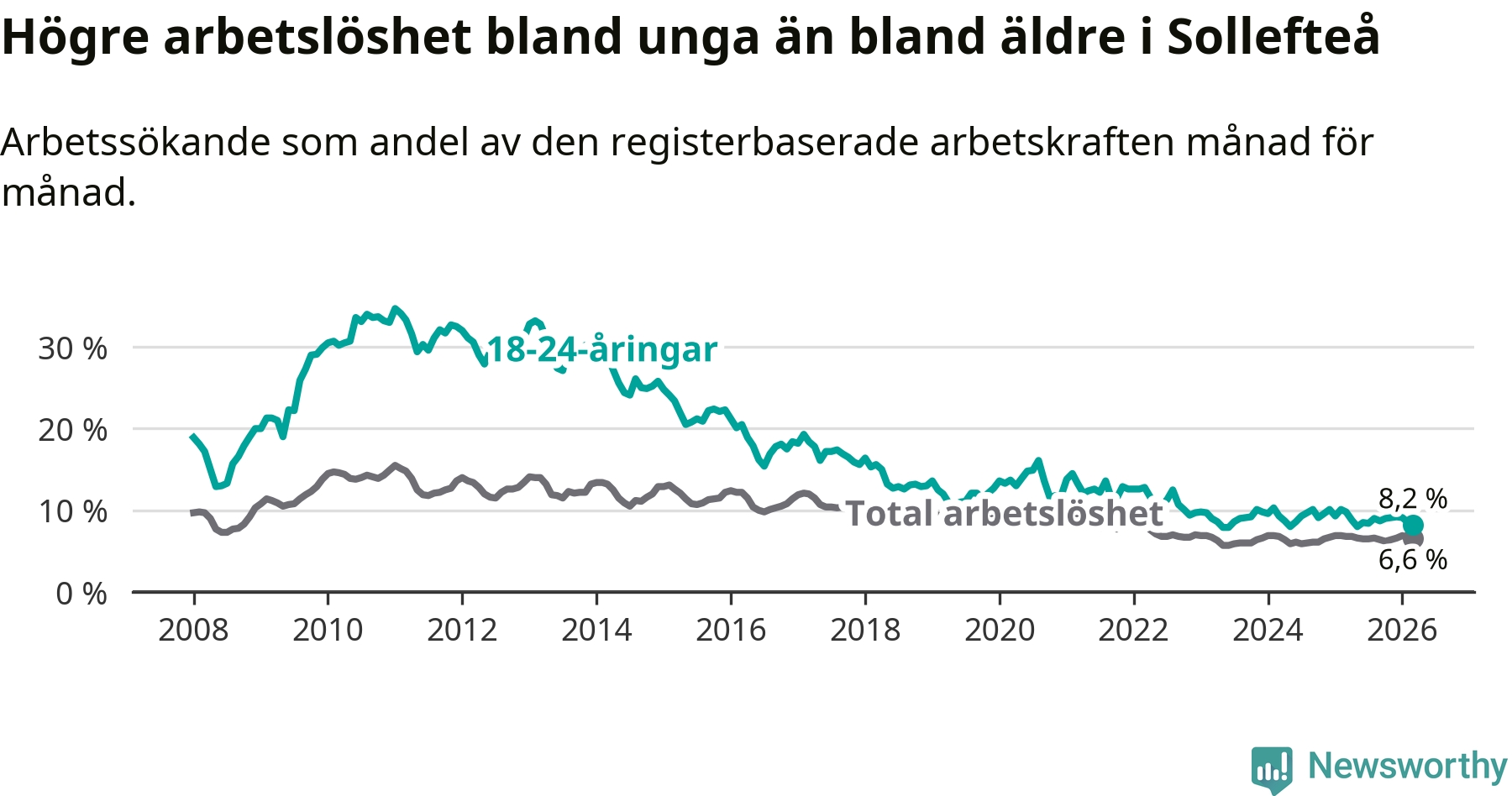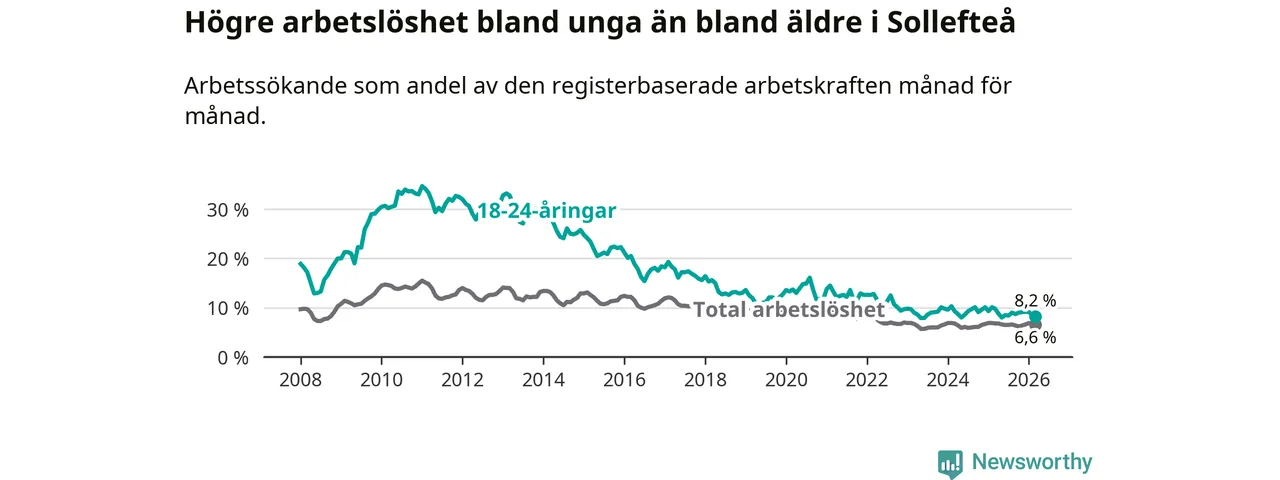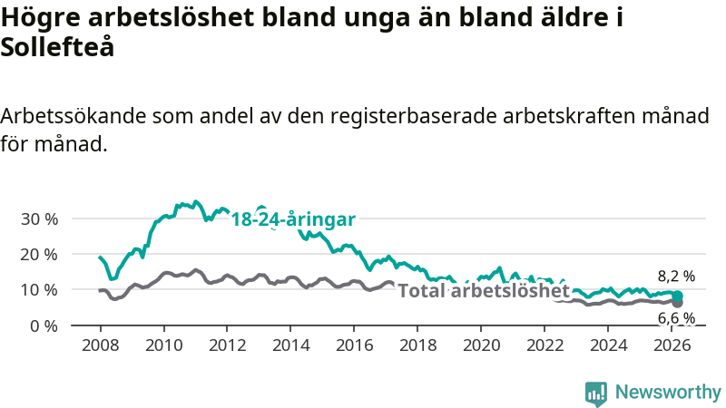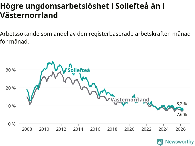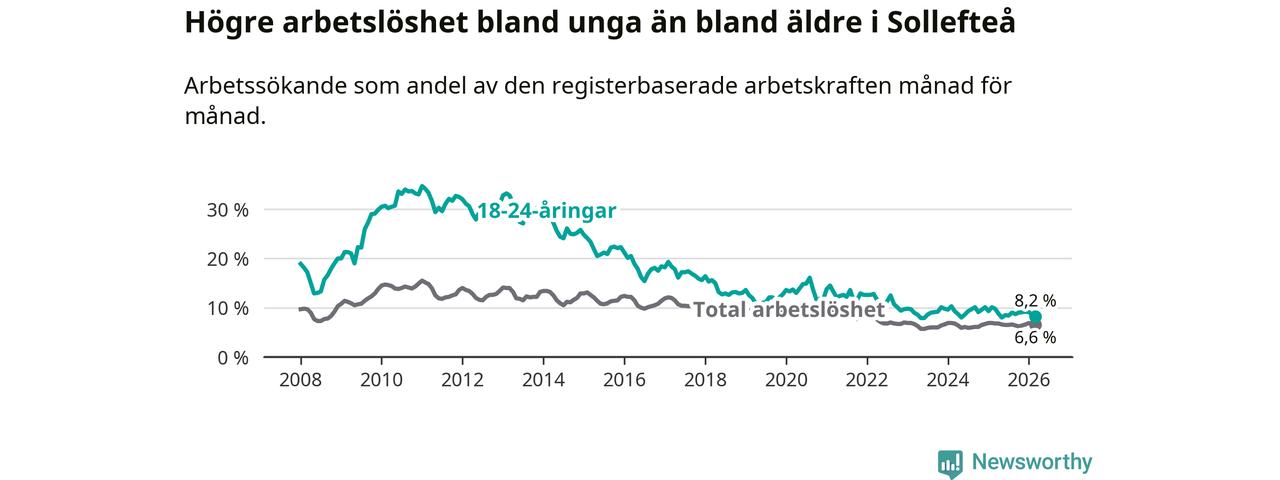 I och med den senaste månadens nedgång har de ungas arbetslöshet i Sollefteå sjunkit tio månader i följd (ner från 8,0 procent i maj 2025 till 8,2 procent nu).
