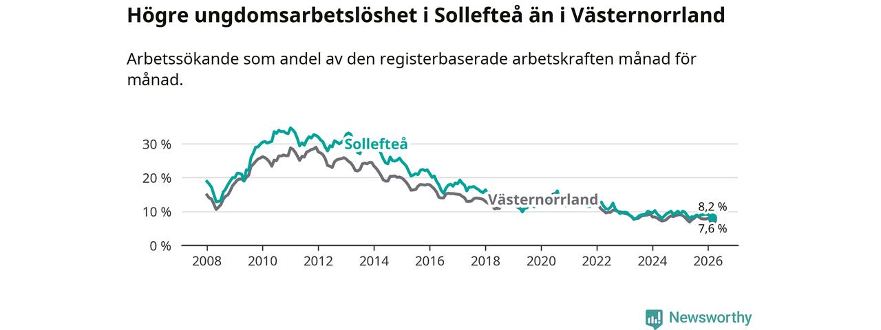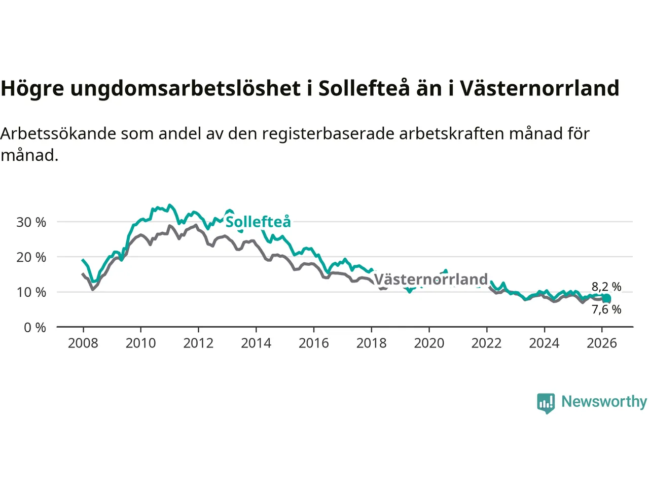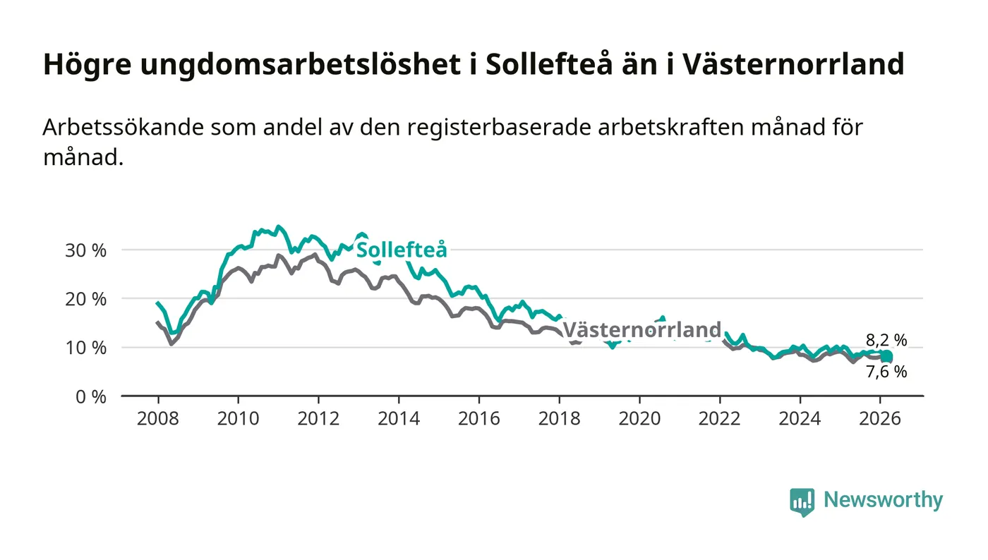 Precis som den totala arbetslösheten ligger ungdomsarbetslösheten i Sollefteå högre än i Västernorrland som helhet. Skillnaden mellan kommunen och länet är 0,6 procentenheter.