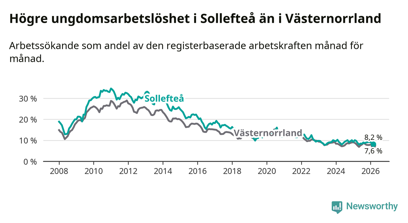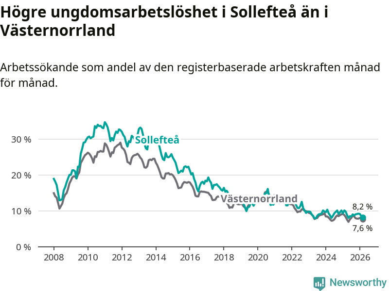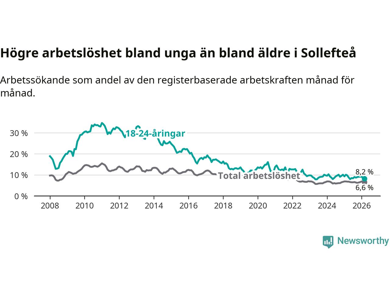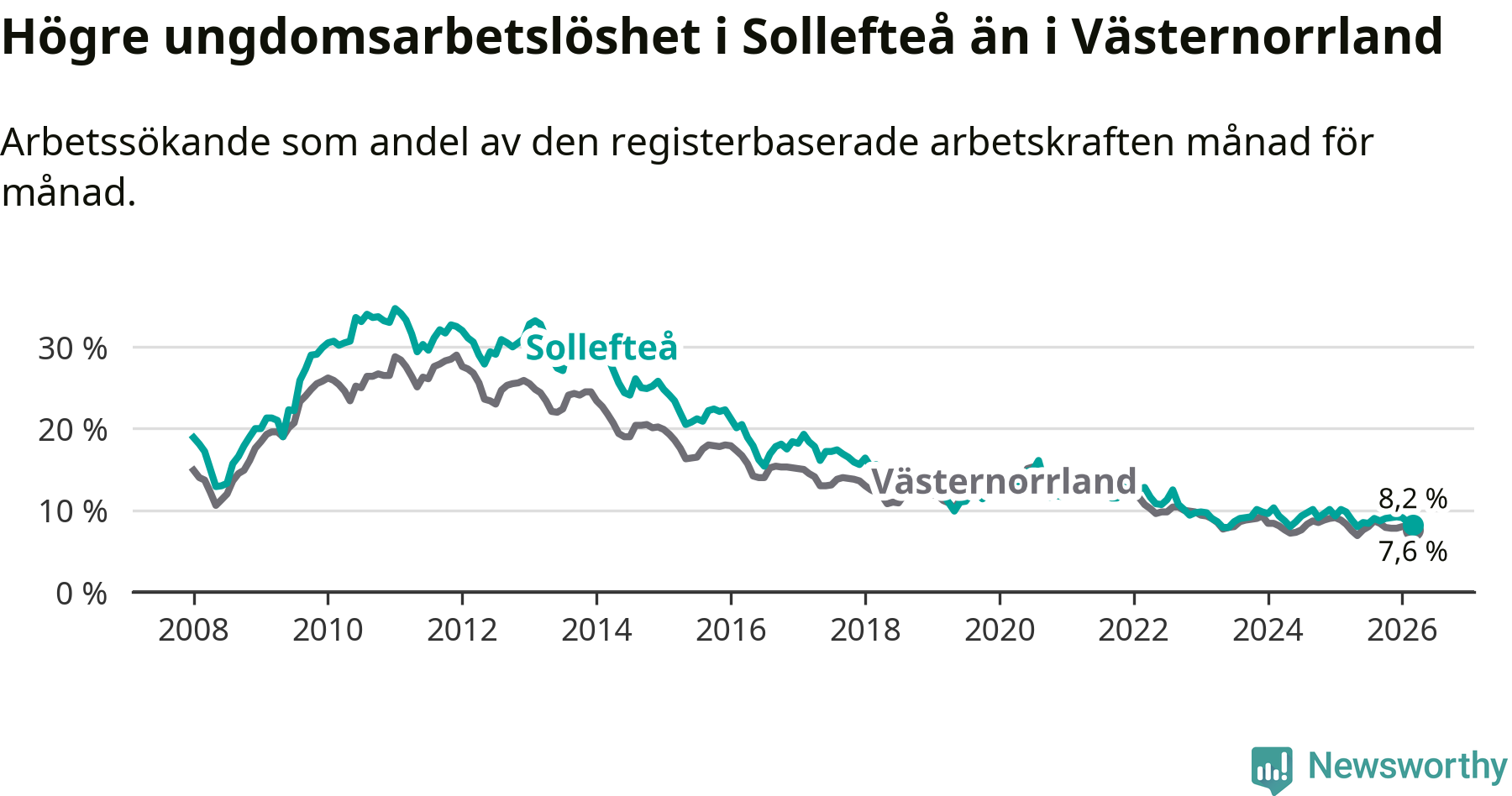 Precis som den totala arbetslösheten ligger ungdomsarbetslösheten i Sollefteå högre än i Västernorrland som helhet. Skillnaden mellan kommunen och länet är 0,6 procentenheter.