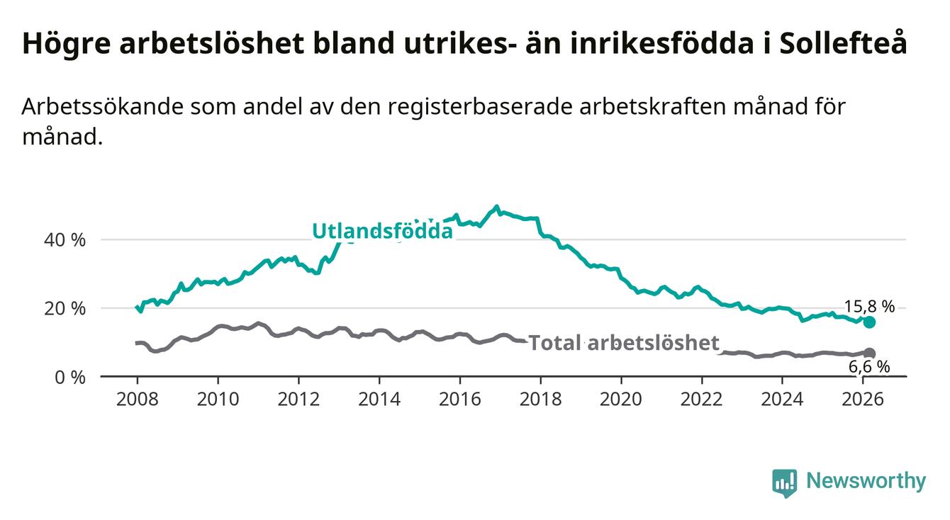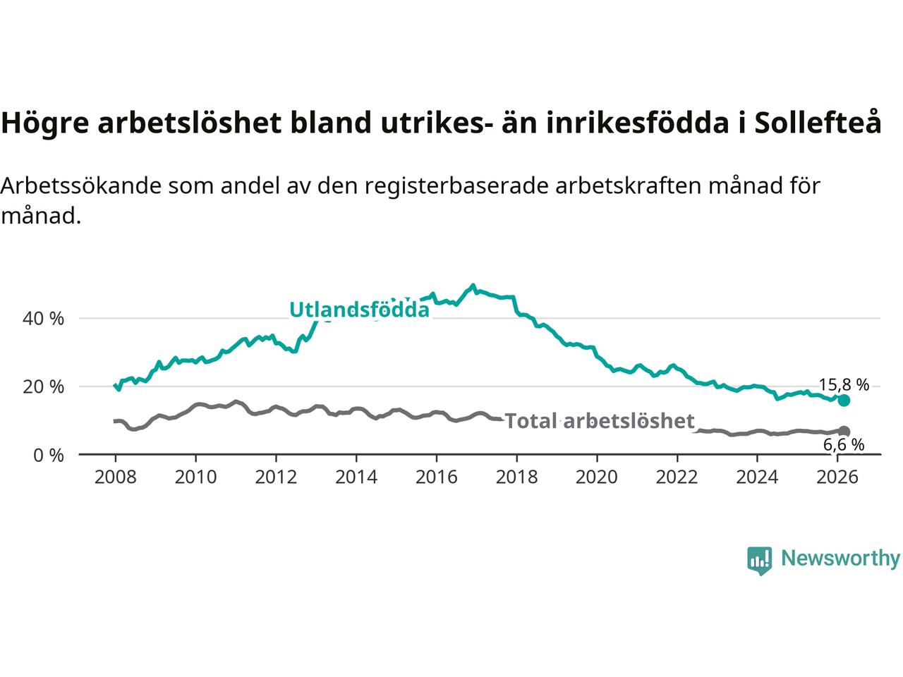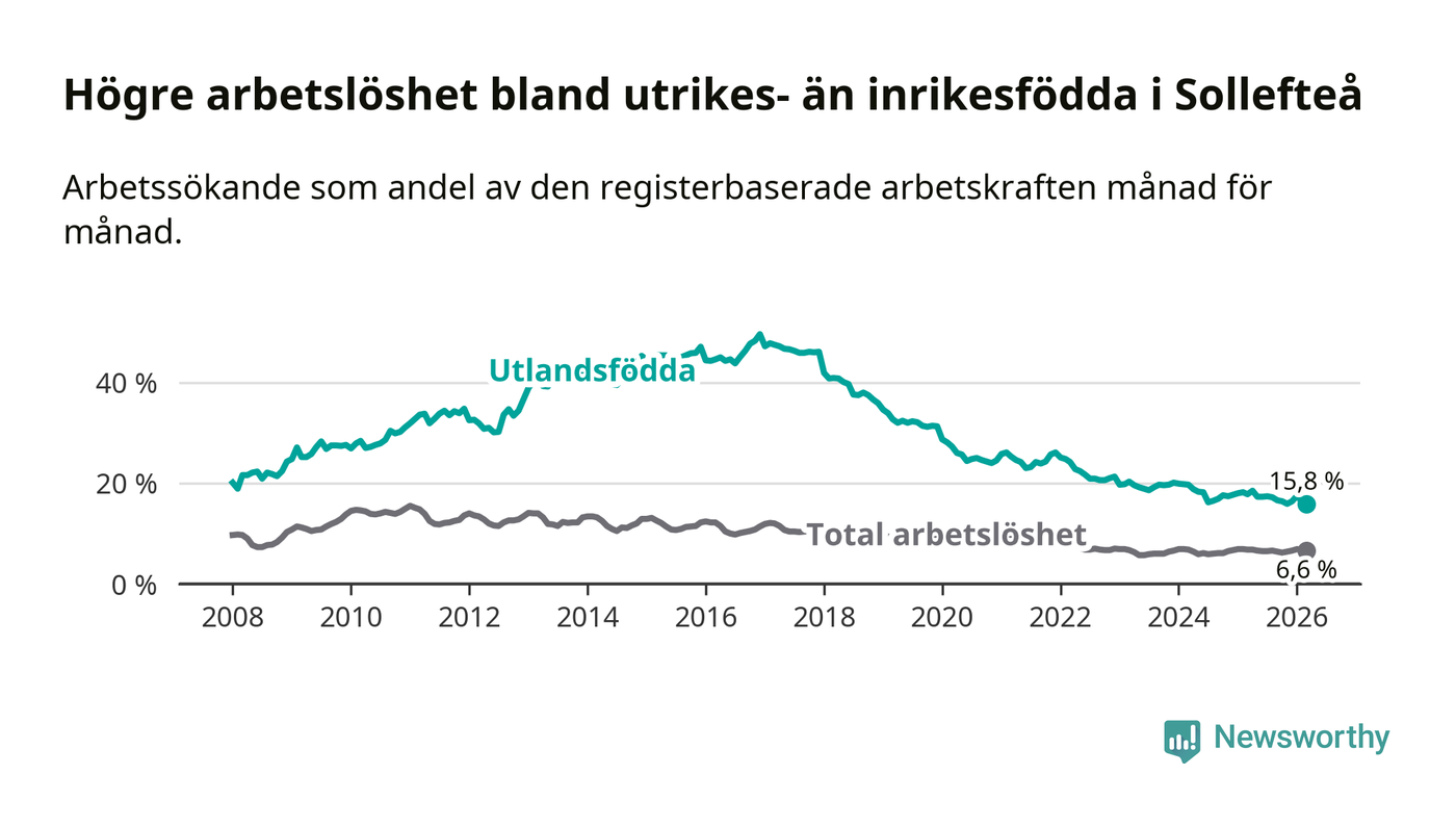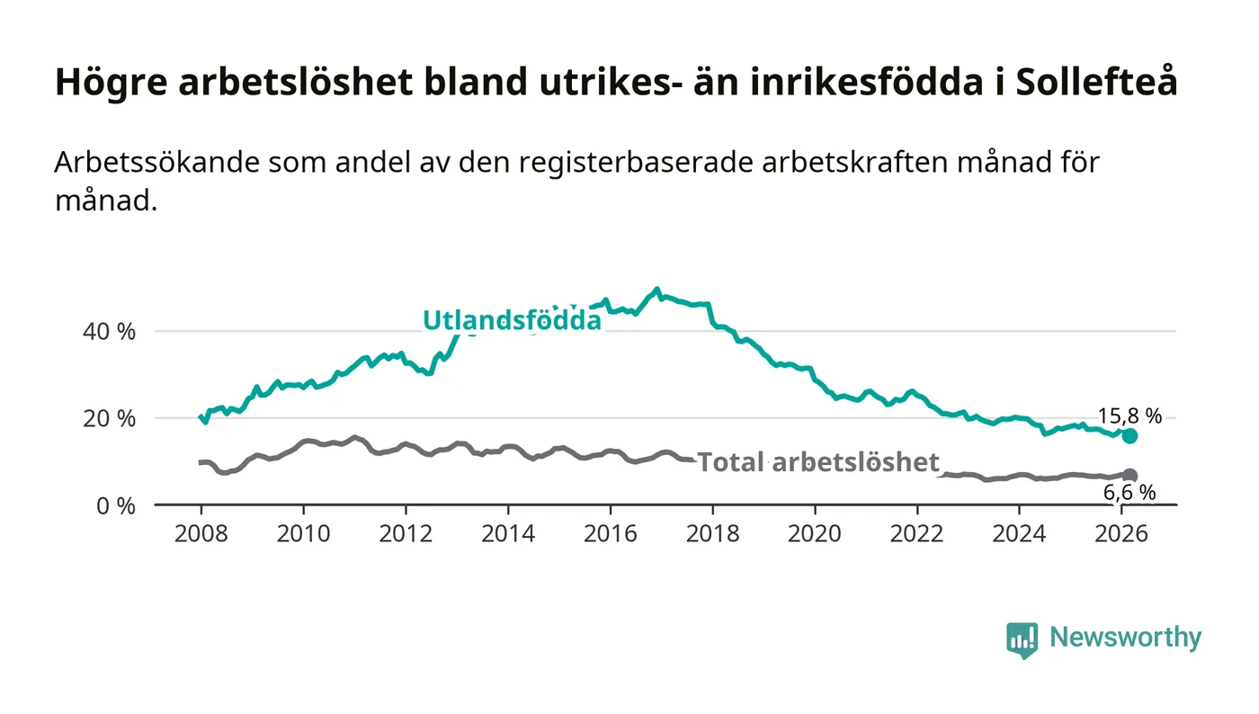 Arbetslösheten bland utlandsfödda var 15,8 procent i Sollefteå under mars månad, motsvarande 195 av 1 234 personer. Det är 2,0 procentenheter färre än vid samma tidpunkt i fjol (−24 om man räknar personer). Därmed är de utlandsföddas arbetslöshet lägre än vid samma tidpunkt i fjol för sjunde månaden i följd. Sedan augusti 2025 har arbetslösheten bland utlandsfödda minskat från 17,2 till 15,8 procent. Den nuvarande arbetslöshetsnivån är den lägsta sedan januari 2008.