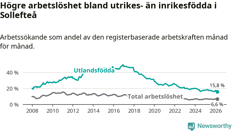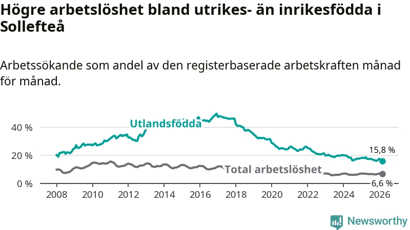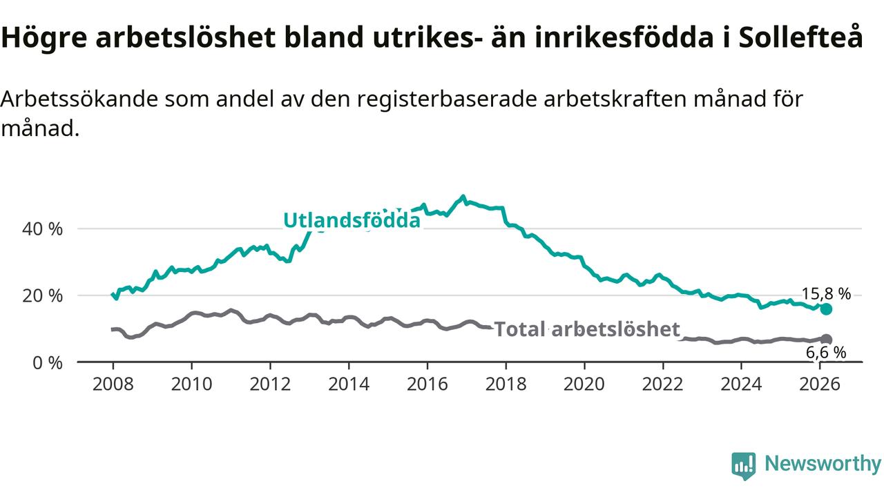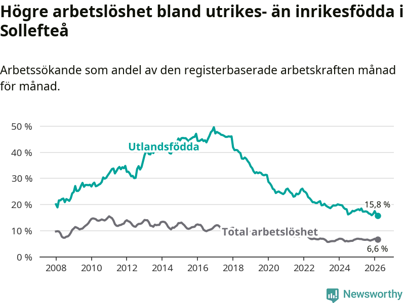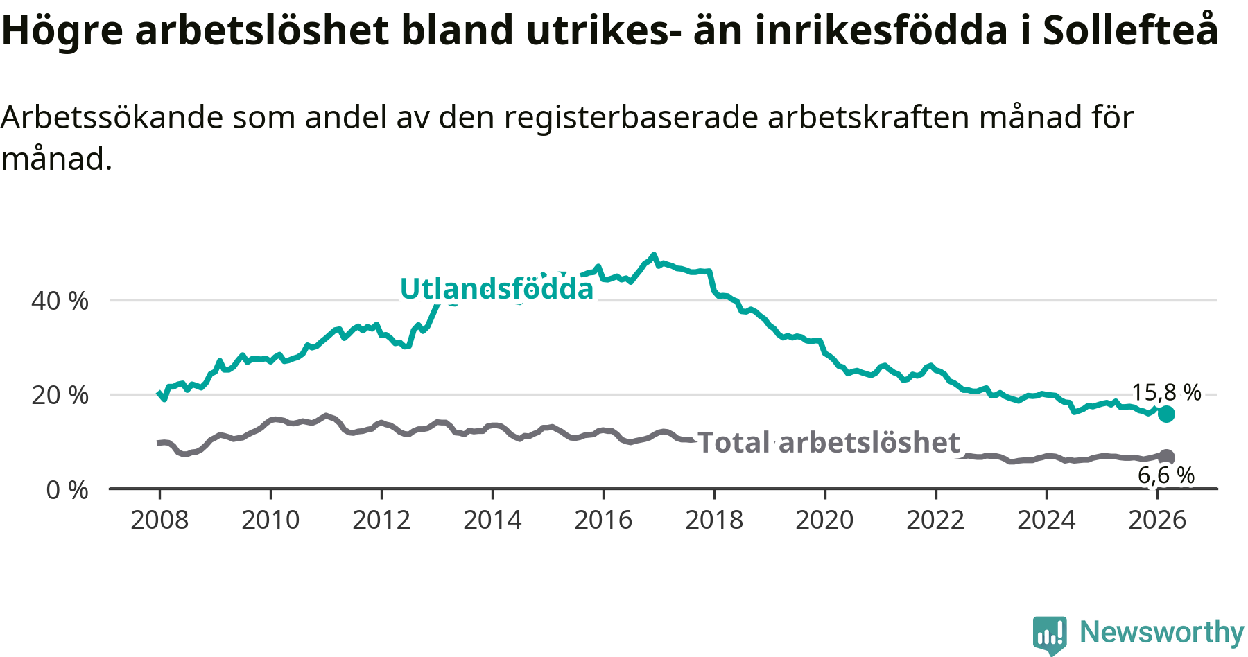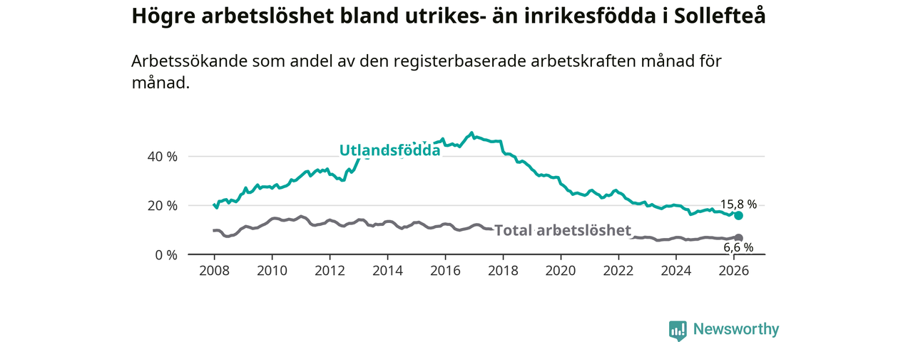 Arbetslösheten bland utlandsfödda var 15,8 procent i Sollefteå under mars månad, motsvarande 195 av 1 234 personer. Det är 2,0 procentenheter färre än vid samma tidpunkt i fjol (−24 om man räknar personer). Därmed är de utlandsföddas arbetslöshet lägre än vid samma tidpunkt i fjol för sjunde månaden i följd. Sedan augusti 2025 har arbetslösheten bland utlandsfödda minskat från 17,2 till 15,8 procent. Den nuvarande arbetslöshetsnivån är den lägsta sedan januari 2008.
