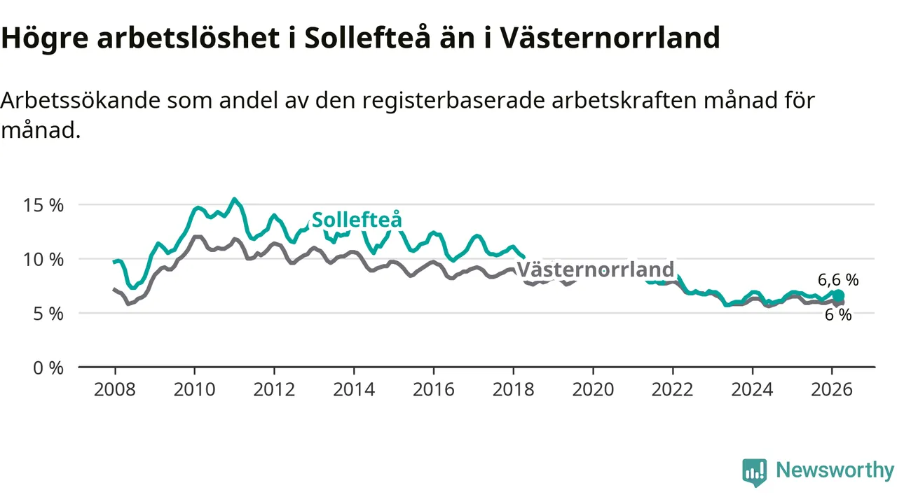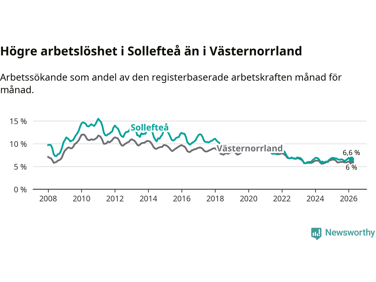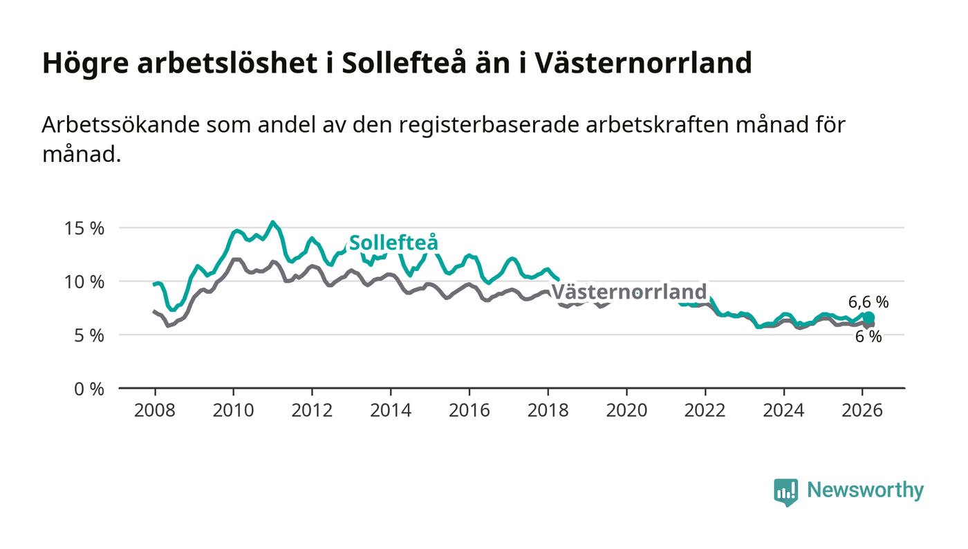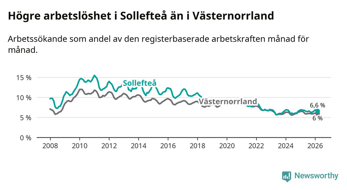 Under mars månad rapporterade Sollefteå kommun en total arbetslöshet på 6,6 procent. Det är en minskning jämfört med samma tidpunkt i fjol (−0,2 procentenheter). Även i Västernorrlands län sjunker arbetslösheten .