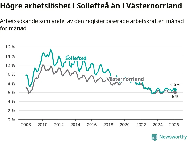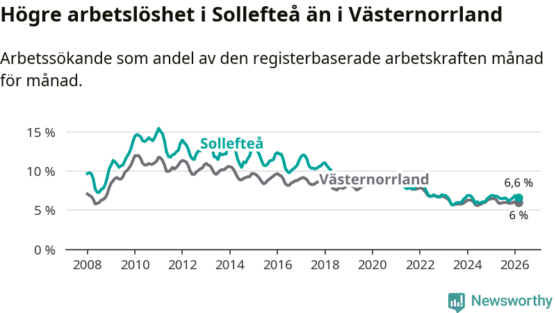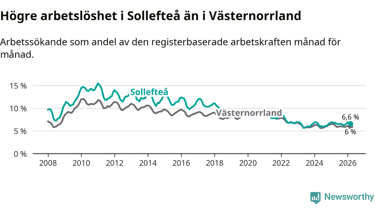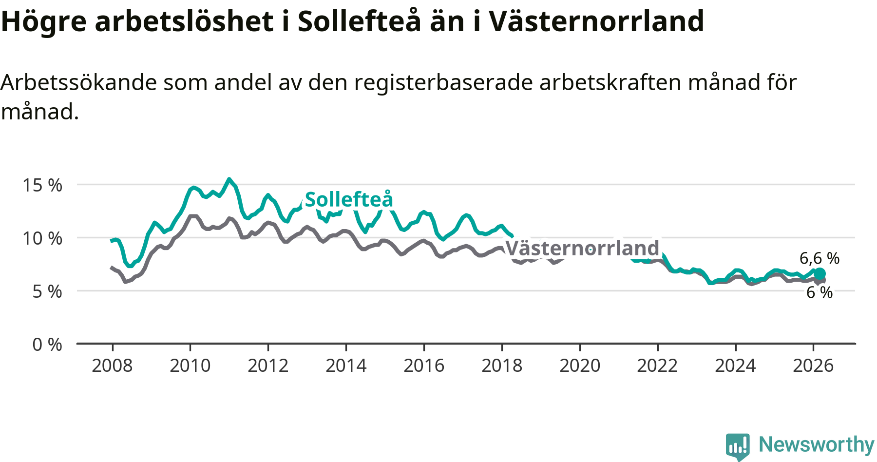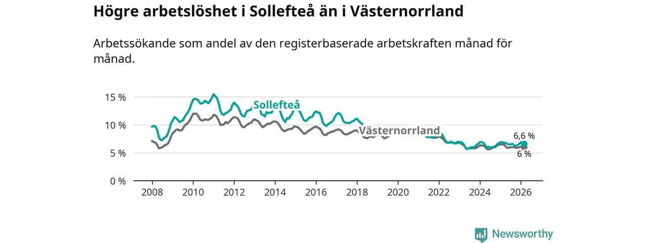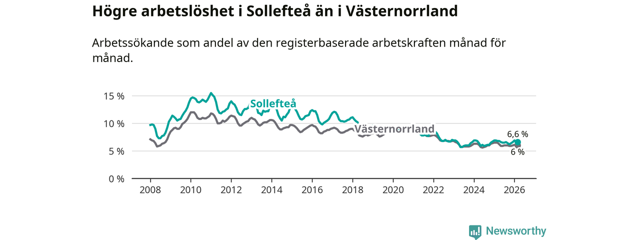 Under mars månad rapporterade Sollefteå kommun en total arbetslöshet på 6,6 procent. Det är en minskning jämfört med samma tidpunkt i fjol (−0,2 procentenheter). Även i Västernorrlands län sjunker arbetslösheten .