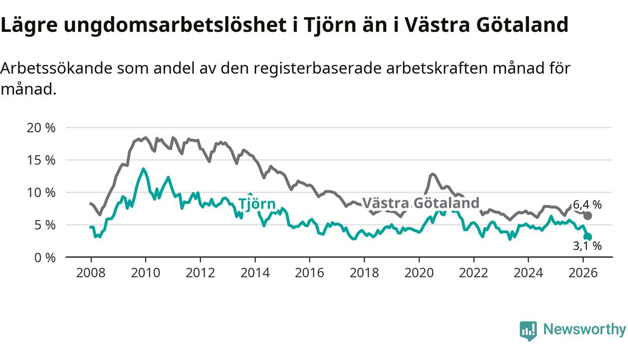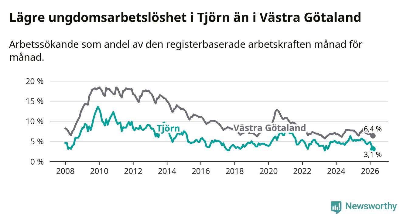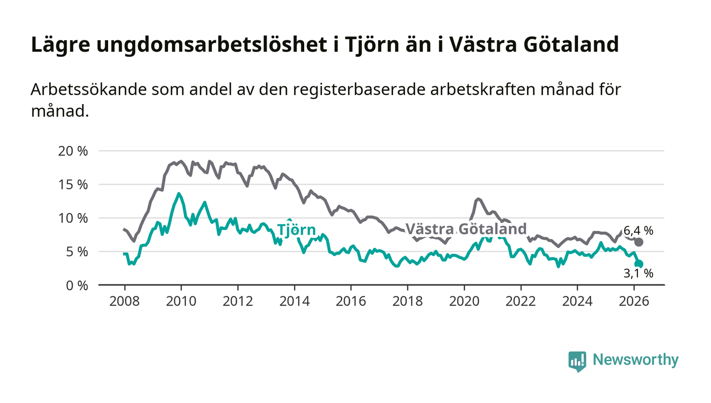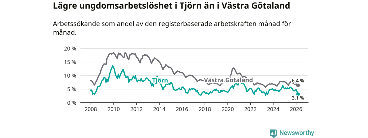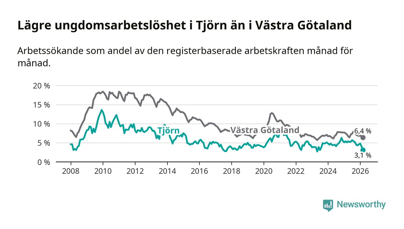 Precis som den totala arbetslösheten ligger ungdomsarbetslösheten på Tjörn lägre än i Västra Götaland som helhet. Skillnaden mellan kommunen och länet är 3,3 procentenheter.