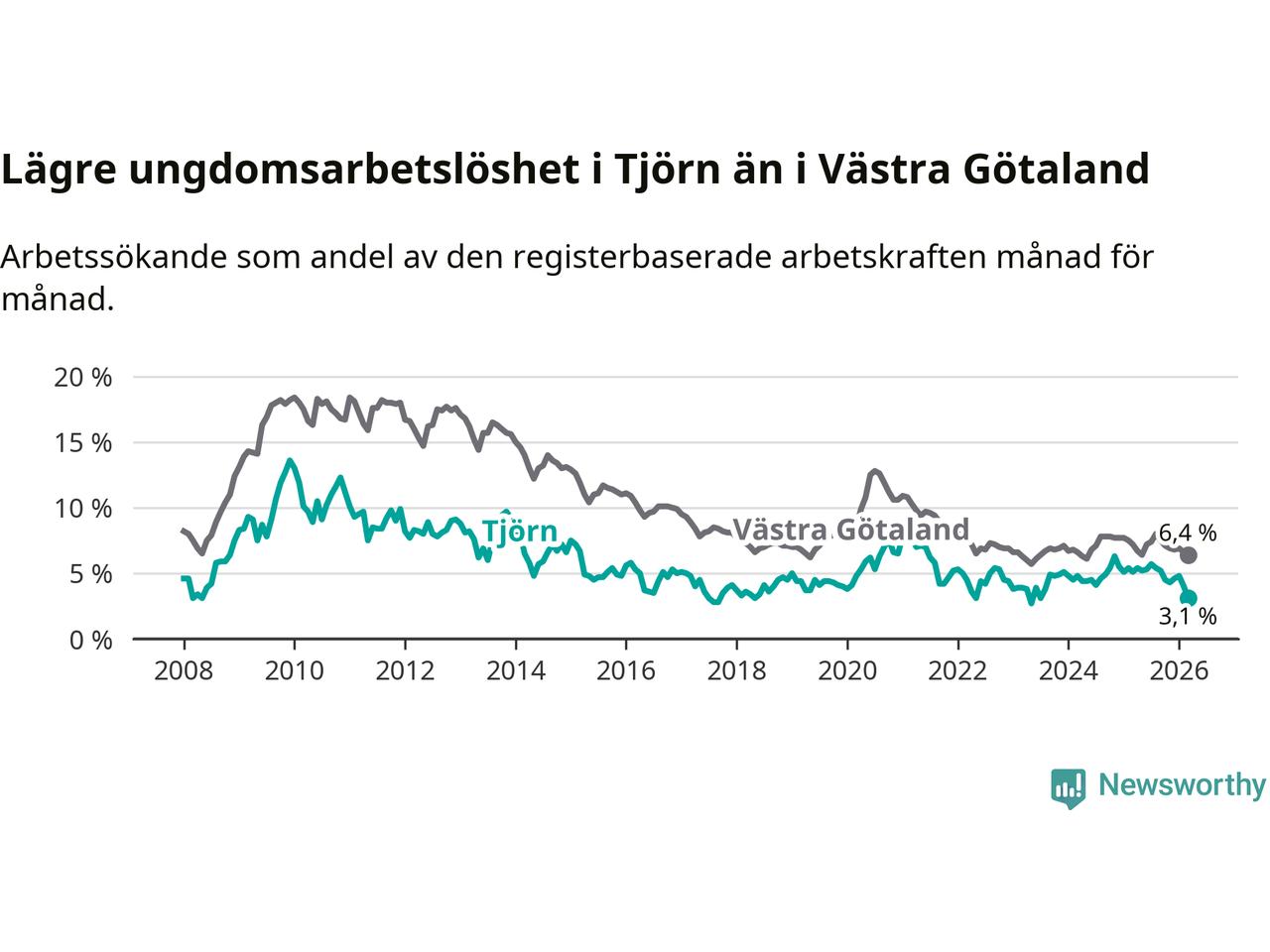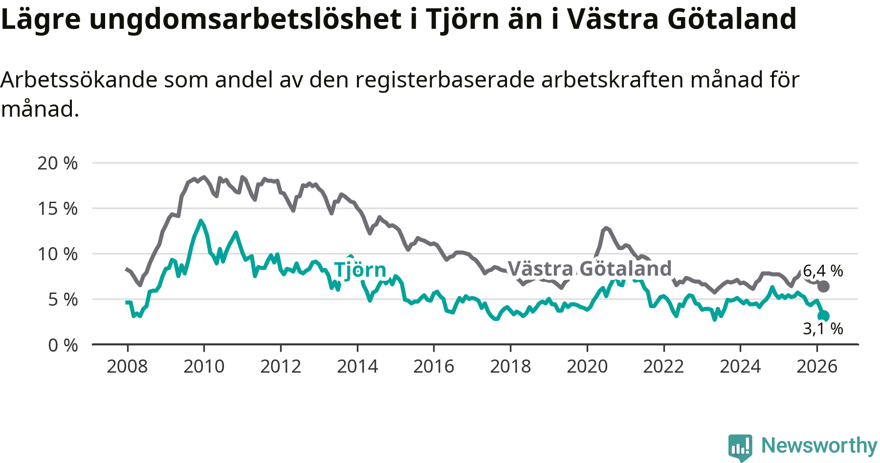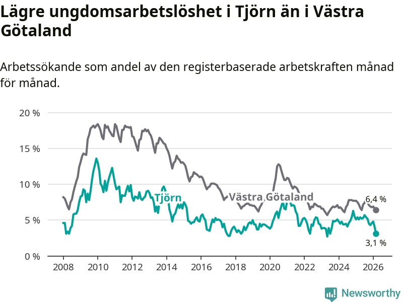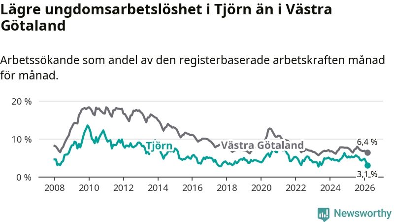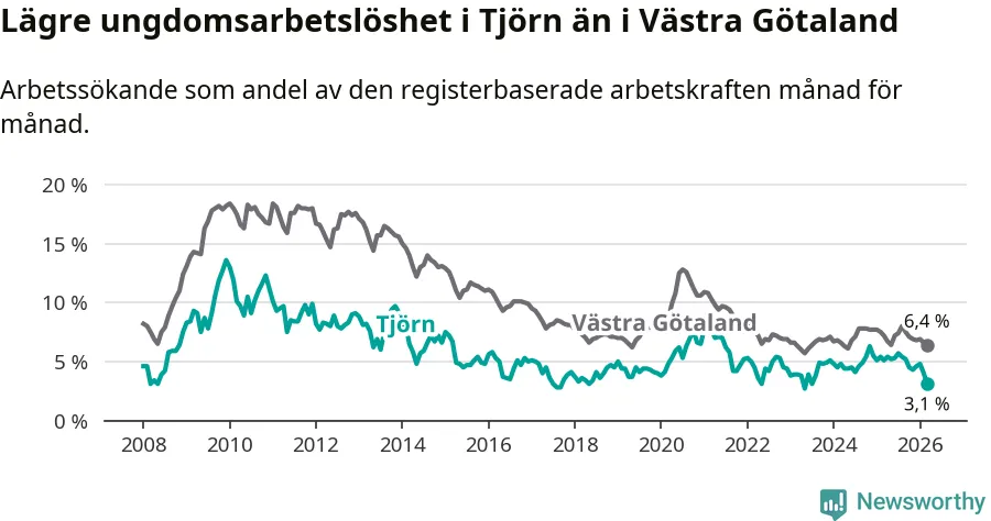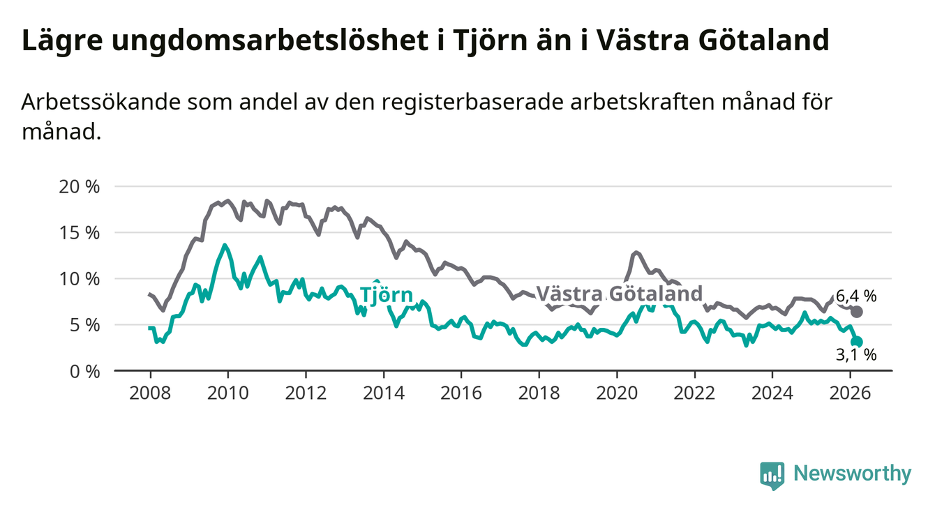 Precis som den totala arbetslösheten ligger ungdomsarbetslösheten på Tjörn lägre än i Västra Götaland som helhet. Skillnaden mellan kommunen och länet är 3,3 procentenheter.