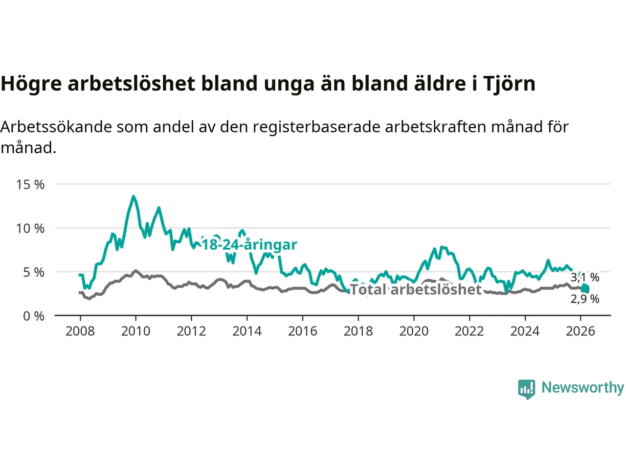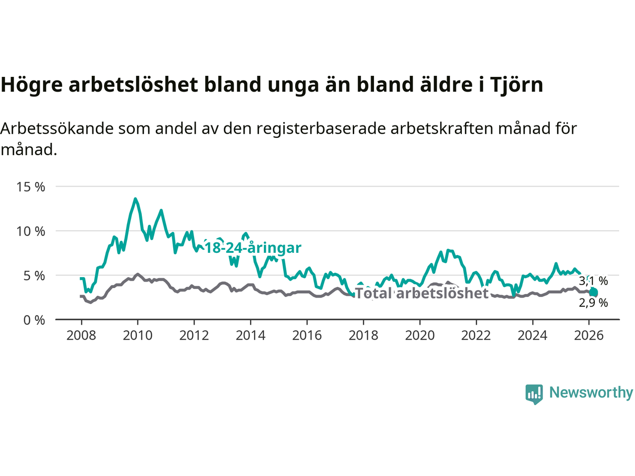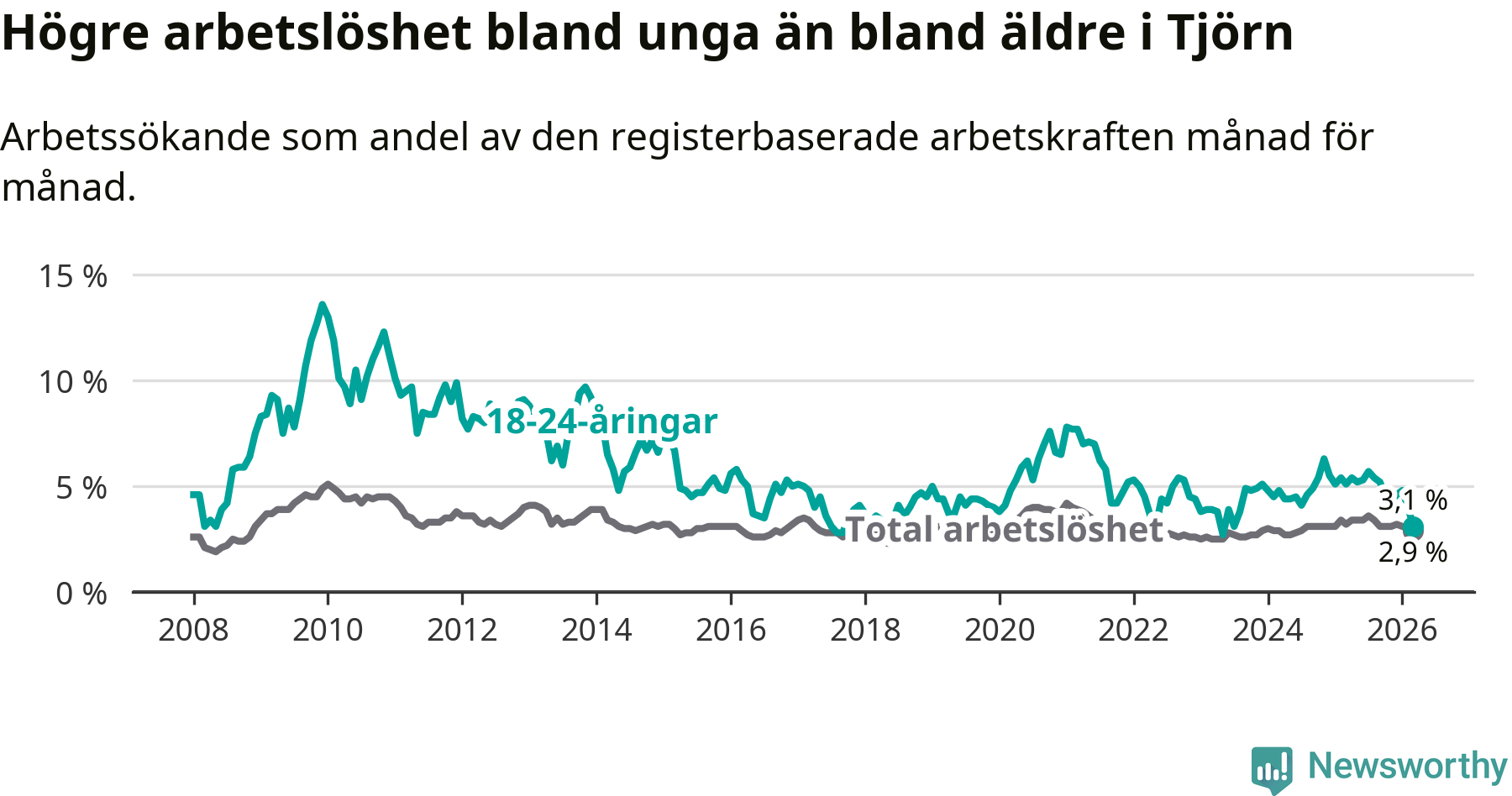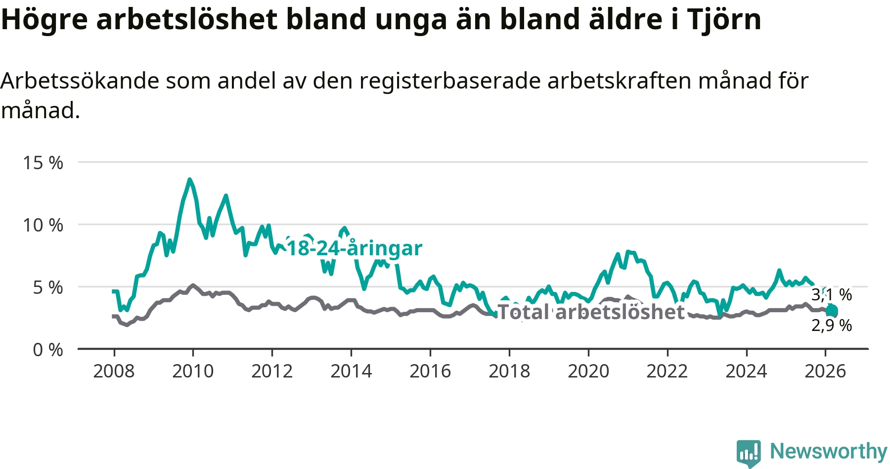 Precis som den totala arbetslösheten ligger ungdomsarbetslösheten på Tjörn lägre än i Västra Götaland som helhet. Skillnaden mellan kommunen och länet är 3,3 procentenheter.